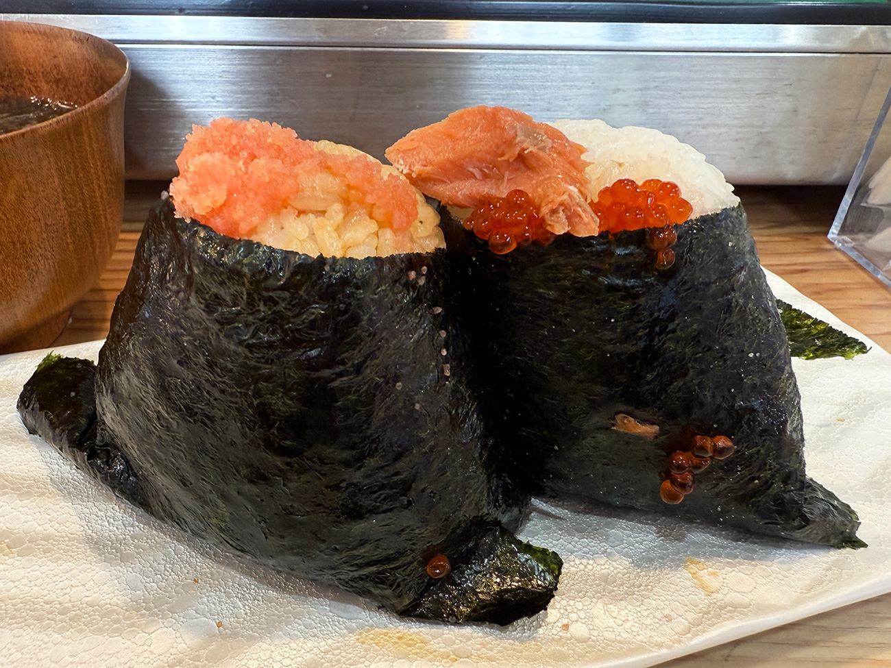 どちらもムッチリとした佇まい。ぽっちゃり系のおにぎりに焼き海苔を強引に巻き付けたようになっていて、具材の盛り付けもちょっぴりワイルド。