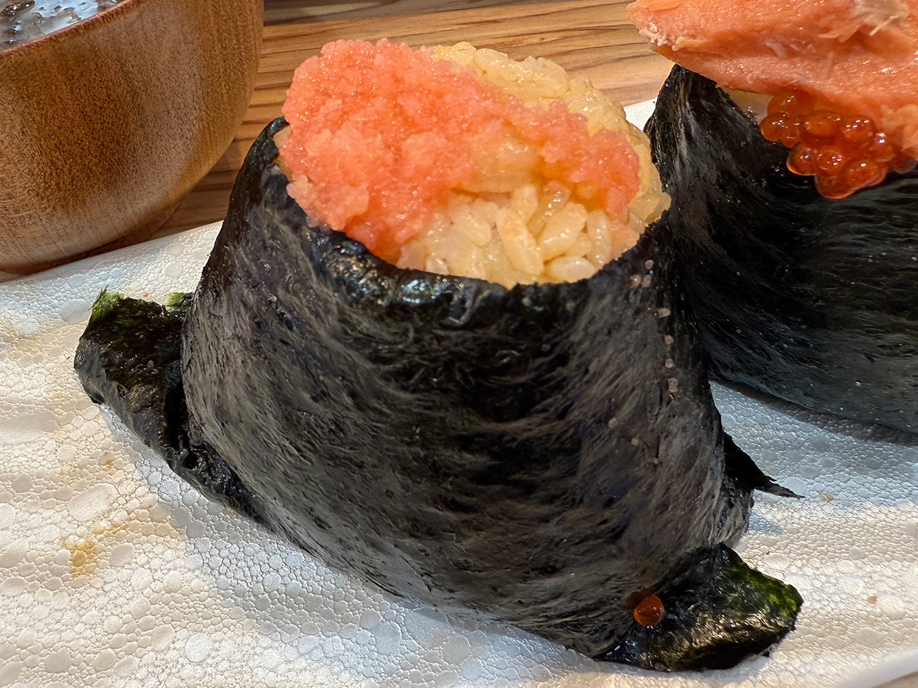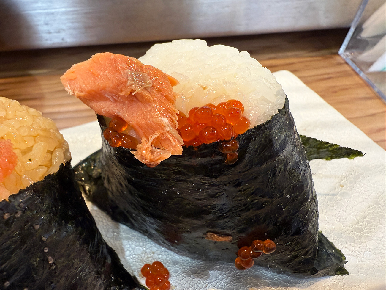 まずは、しゃけ&いくらという北海道のDNAを感じられる「親子いくら」の塩にぎりからガブリ。その刹那、口の中でご飯粒がふわりとほぐれ、ほのかな塩の味が広がっていきます。