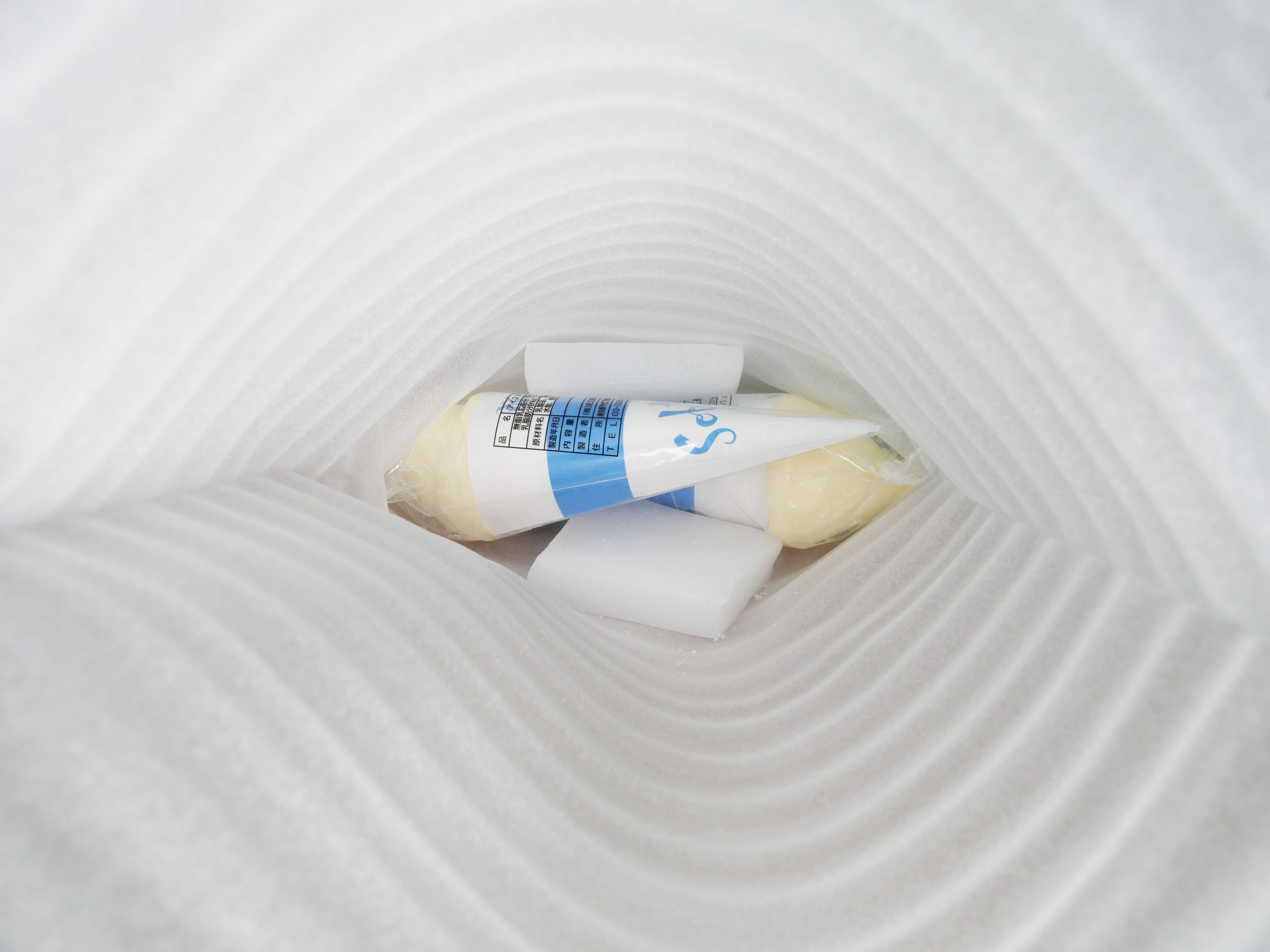 紙袋を開封すると、溶けないように包装されたソフトクリームが入っています。