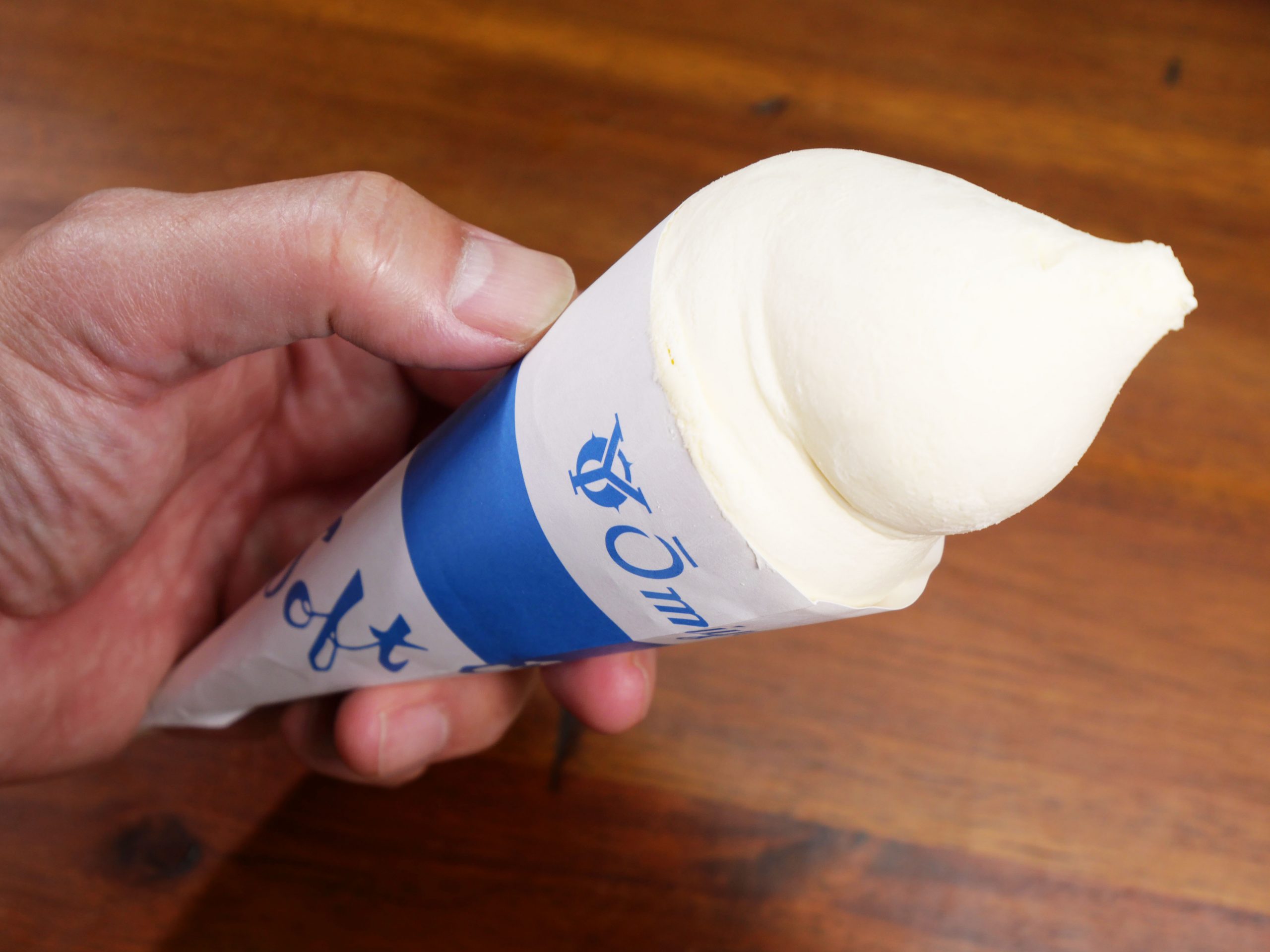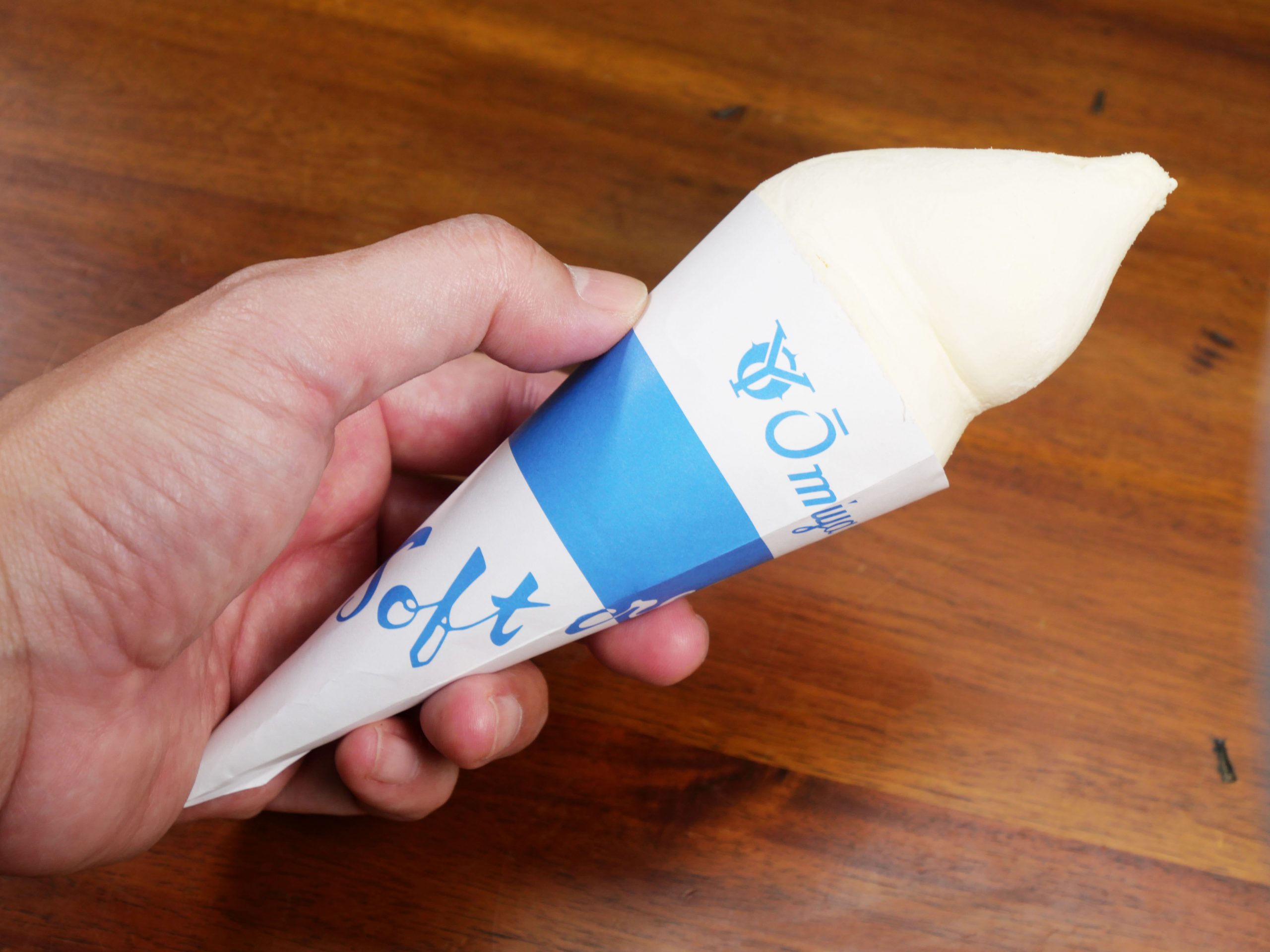 三角コーンにたっぷりと盛られたソフトクリーム。