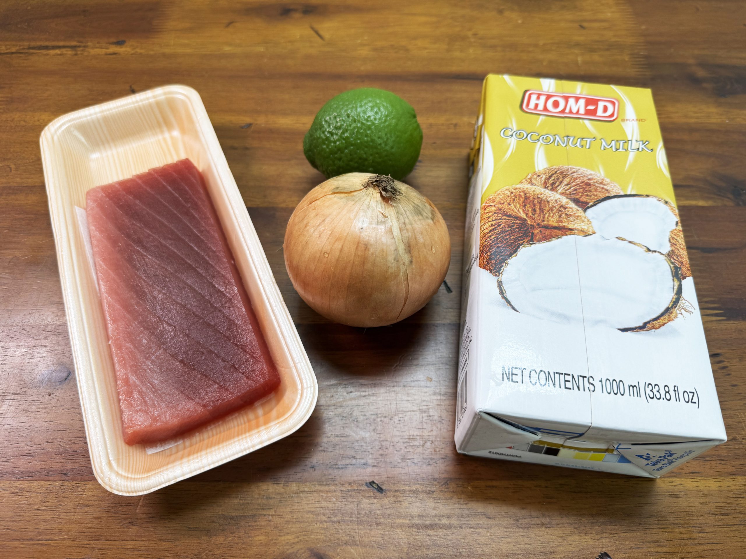 キハダマグロの切り身(適量)、ココナッツミルク(適量)、玉ねぎみじん切り(適量)、ライムとか(適量)、塩胡椒(必要な人は適量)をあえるだけじゃ👵 https://t.co/P90yw6StU7