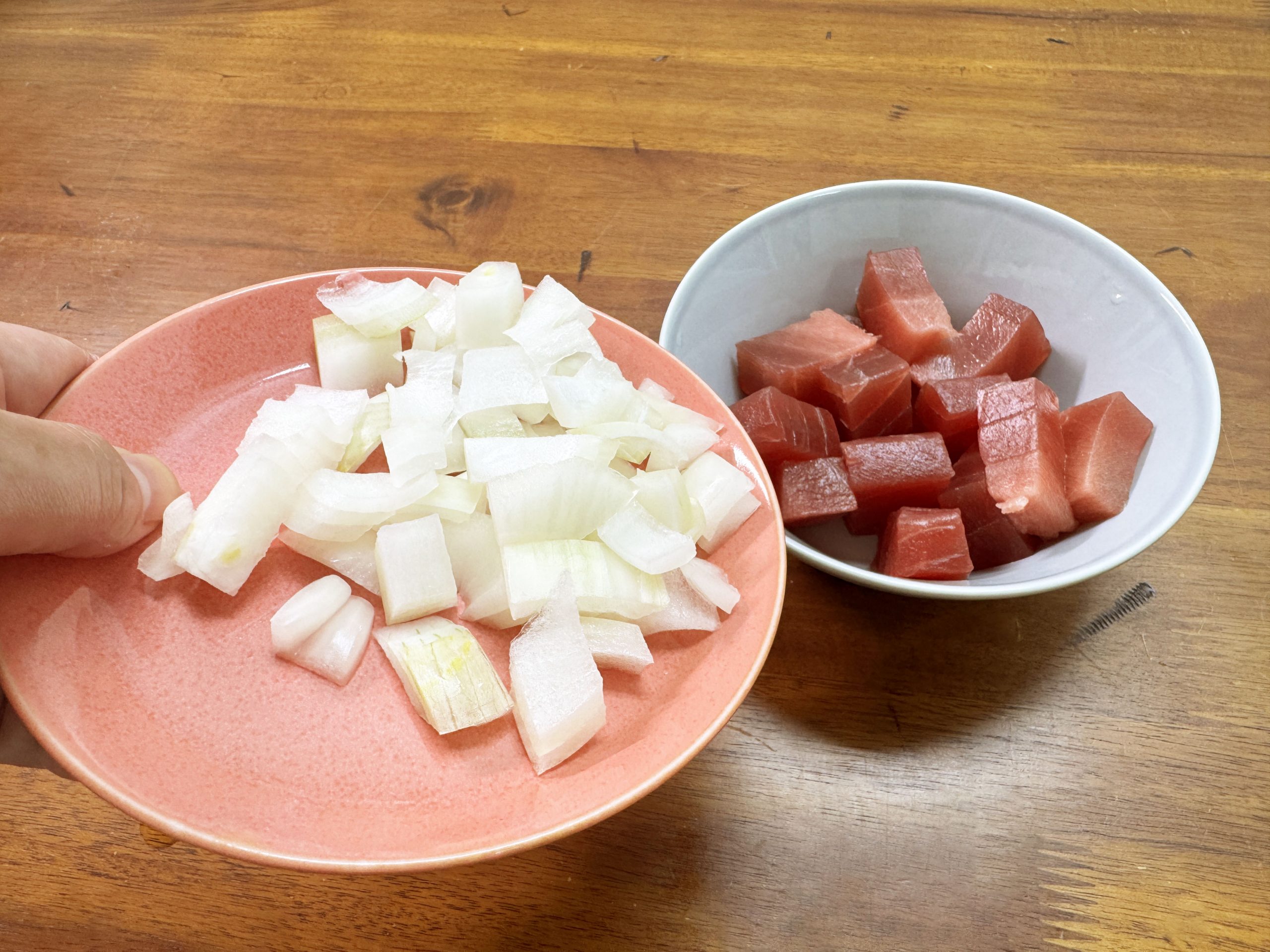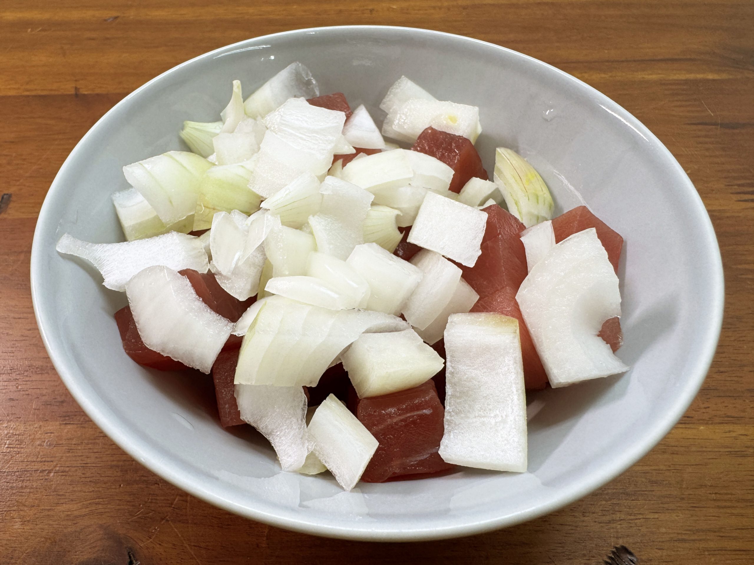 マグロをブロック状にぶつ切りにします。ナウルの食堂では、お店ごとにカットの大きさが違うようですが、筆者がお気に入りの食堂「Coconut Tree Restaurant」(FWJ9+56H, Nibok, Nauru)のスタイルで、やや大きめに、ワイルドにカットしました。