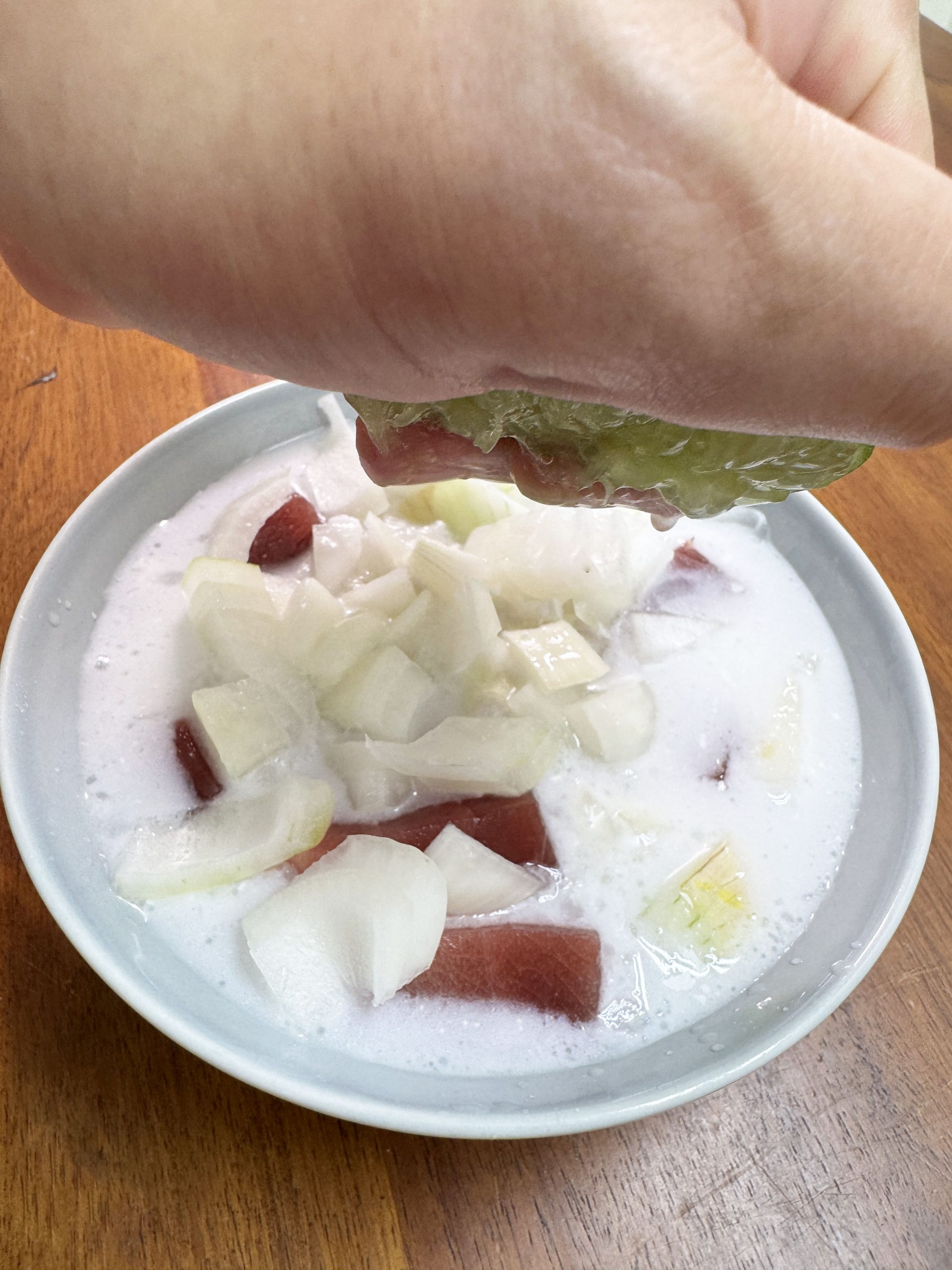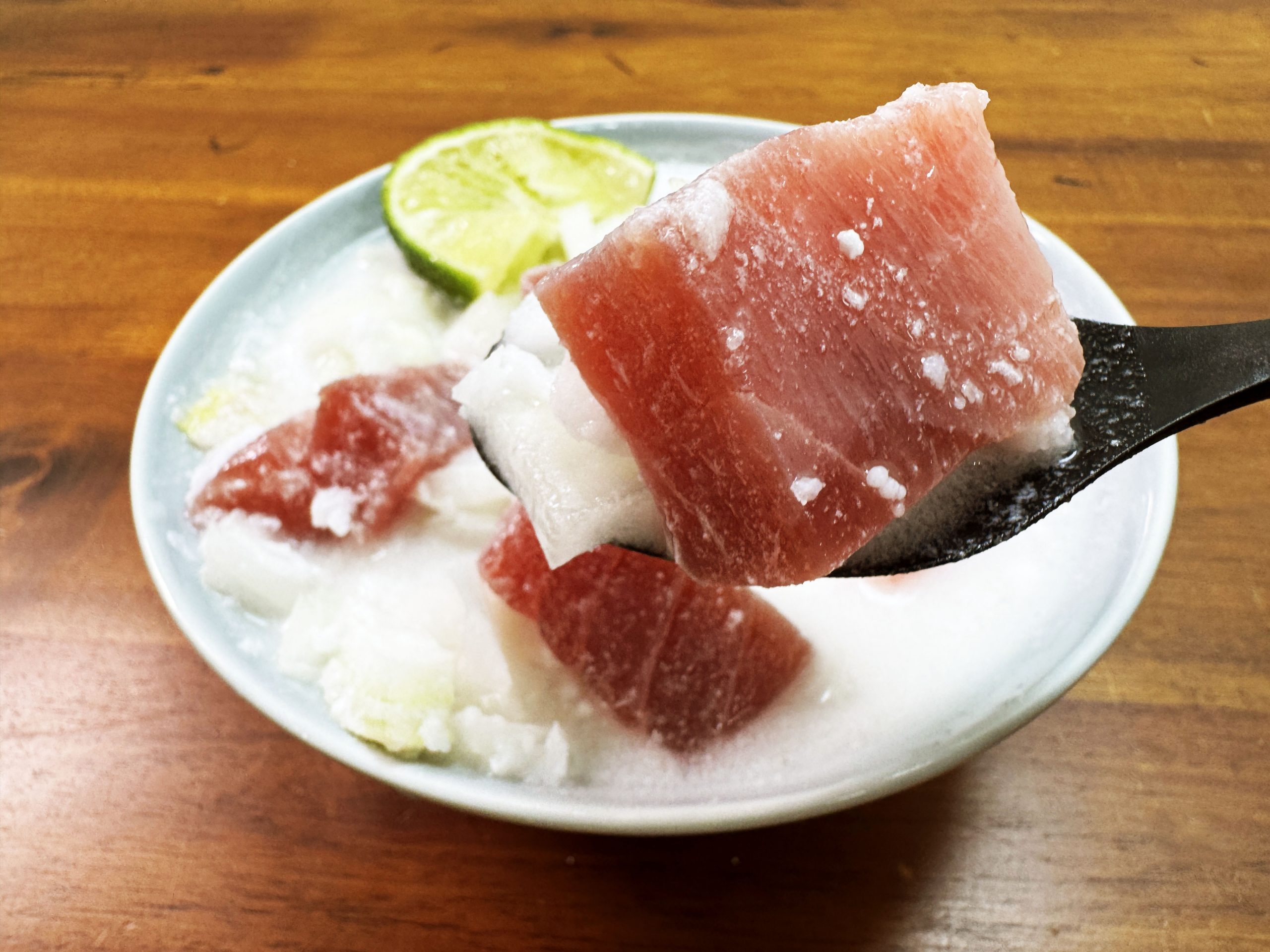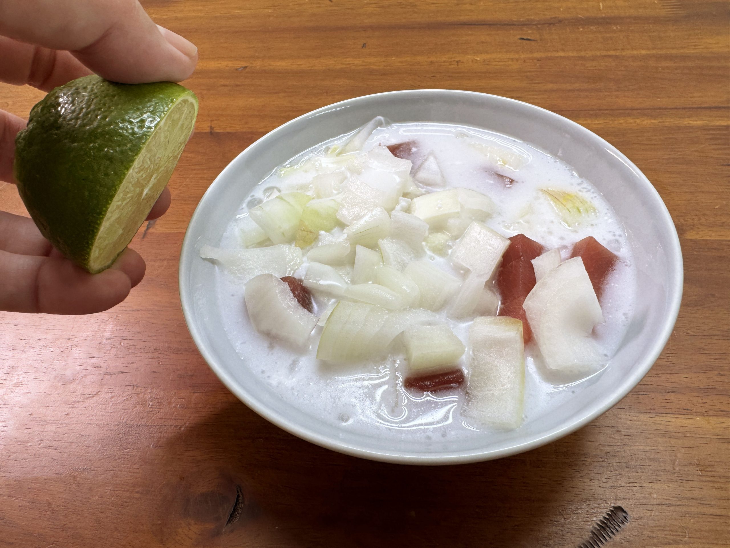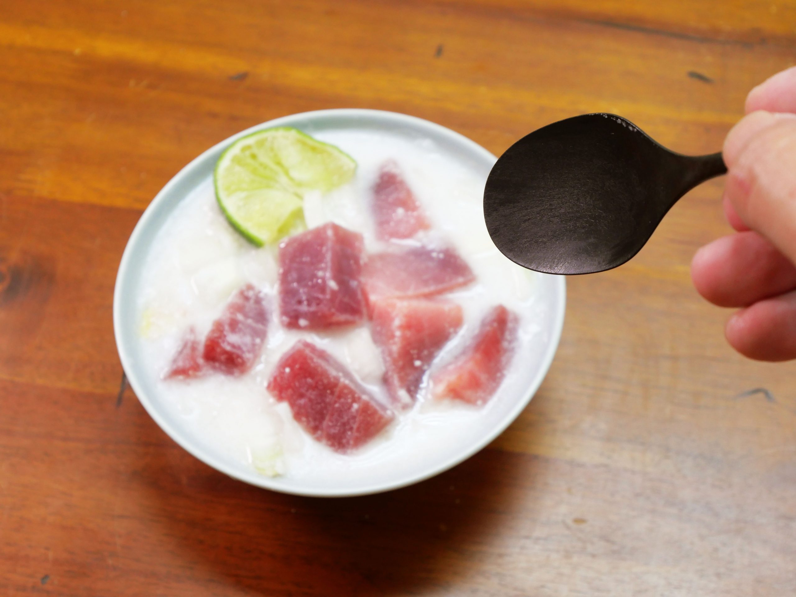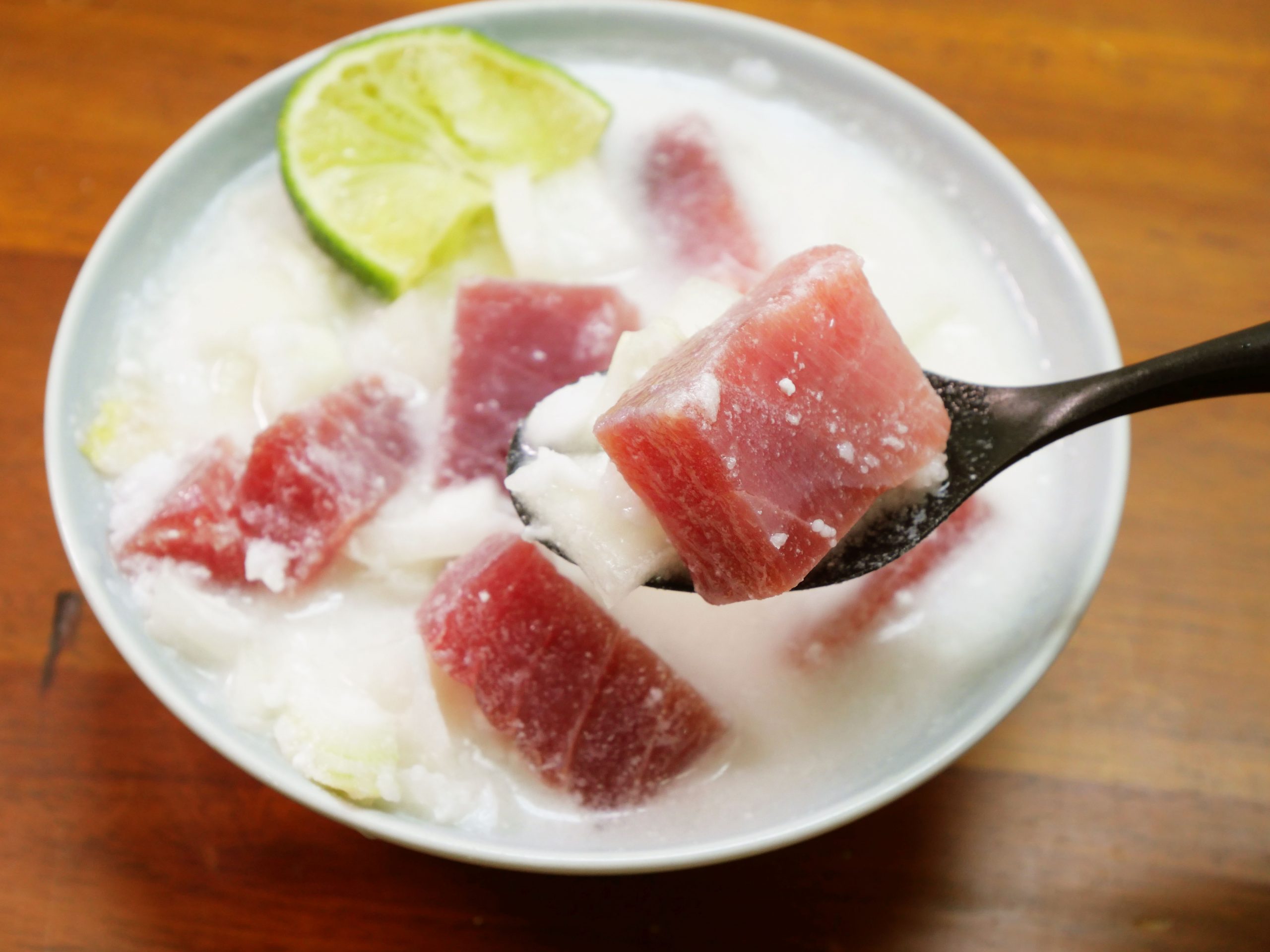 ということで、追加してライムを入れまくったのですが、それでも、酸味の質が違う気がします。もっとギュンギュンくる酸味。その酸味に包まれたマグロの濃い旨味こそ、ココナッツフィッシュの魅力(だと思っています)。もしかして、ライムのほかにレモンを入れたほうがイイ?