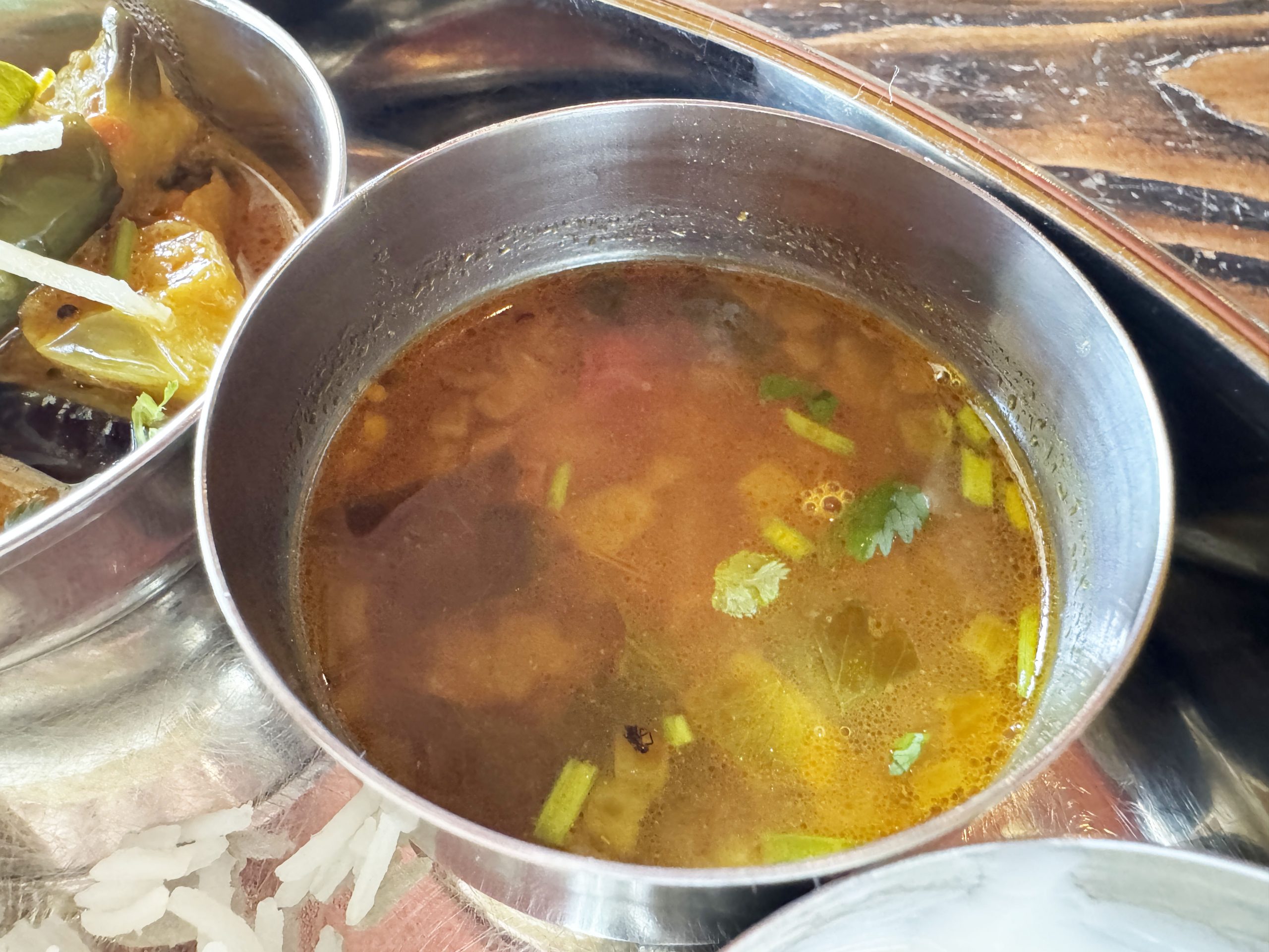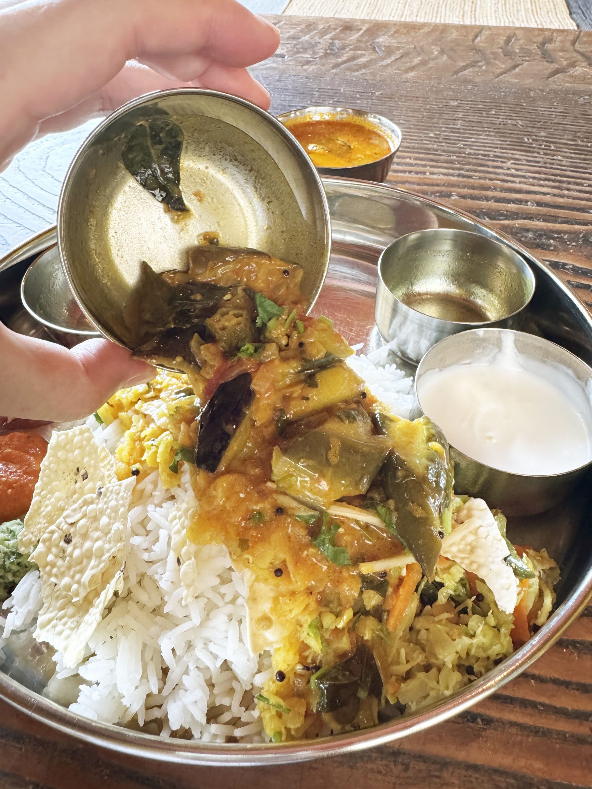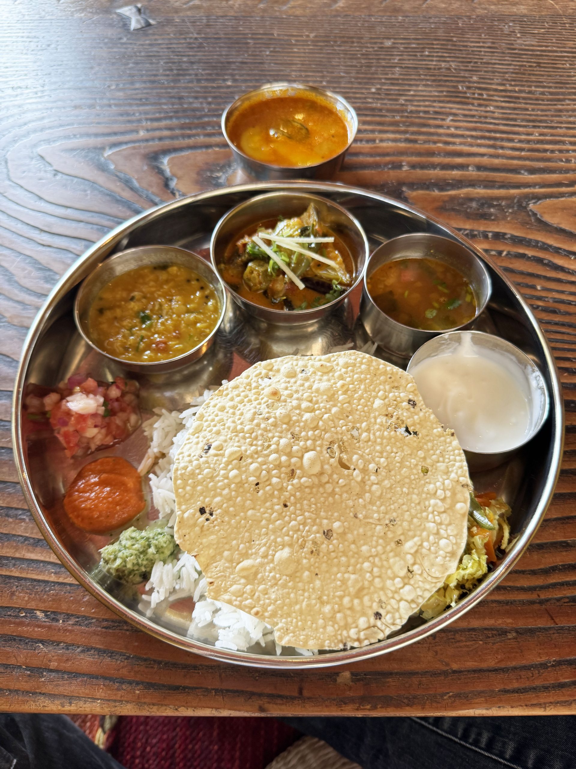 筆者はミールスをオーダー。さまざまなカレーや総菜がセットになったもの。サンバル、ラッサム、カレー、ポリヤル、ダルフライ、アチャール、チャトニ、バスマティライス、パパドがひとつの皿に盛られている。