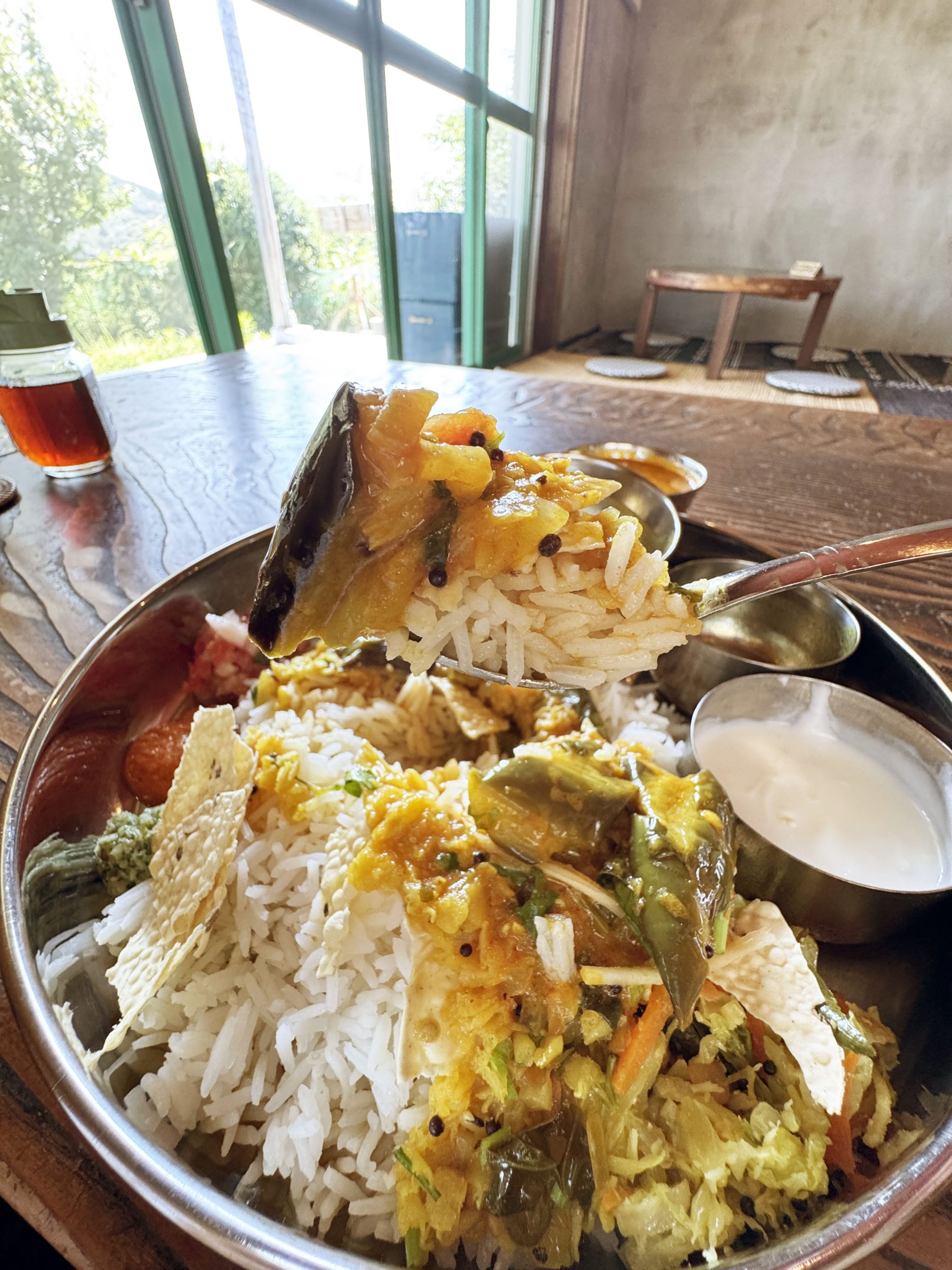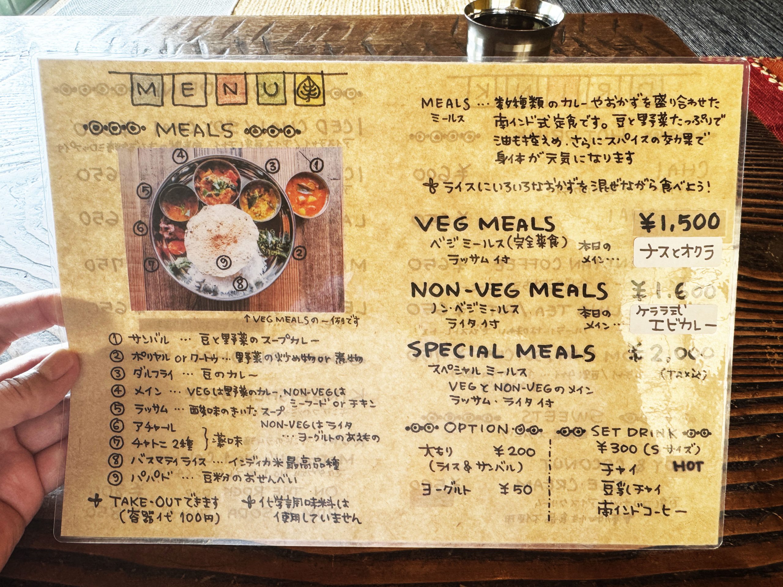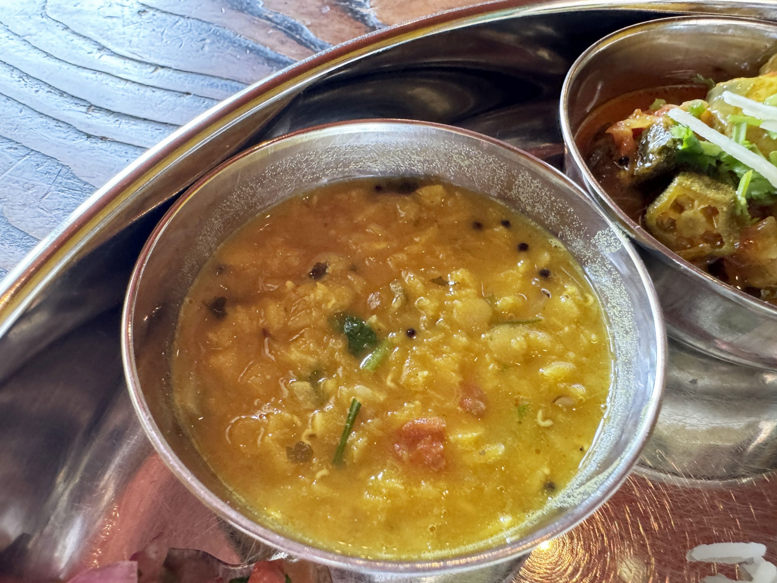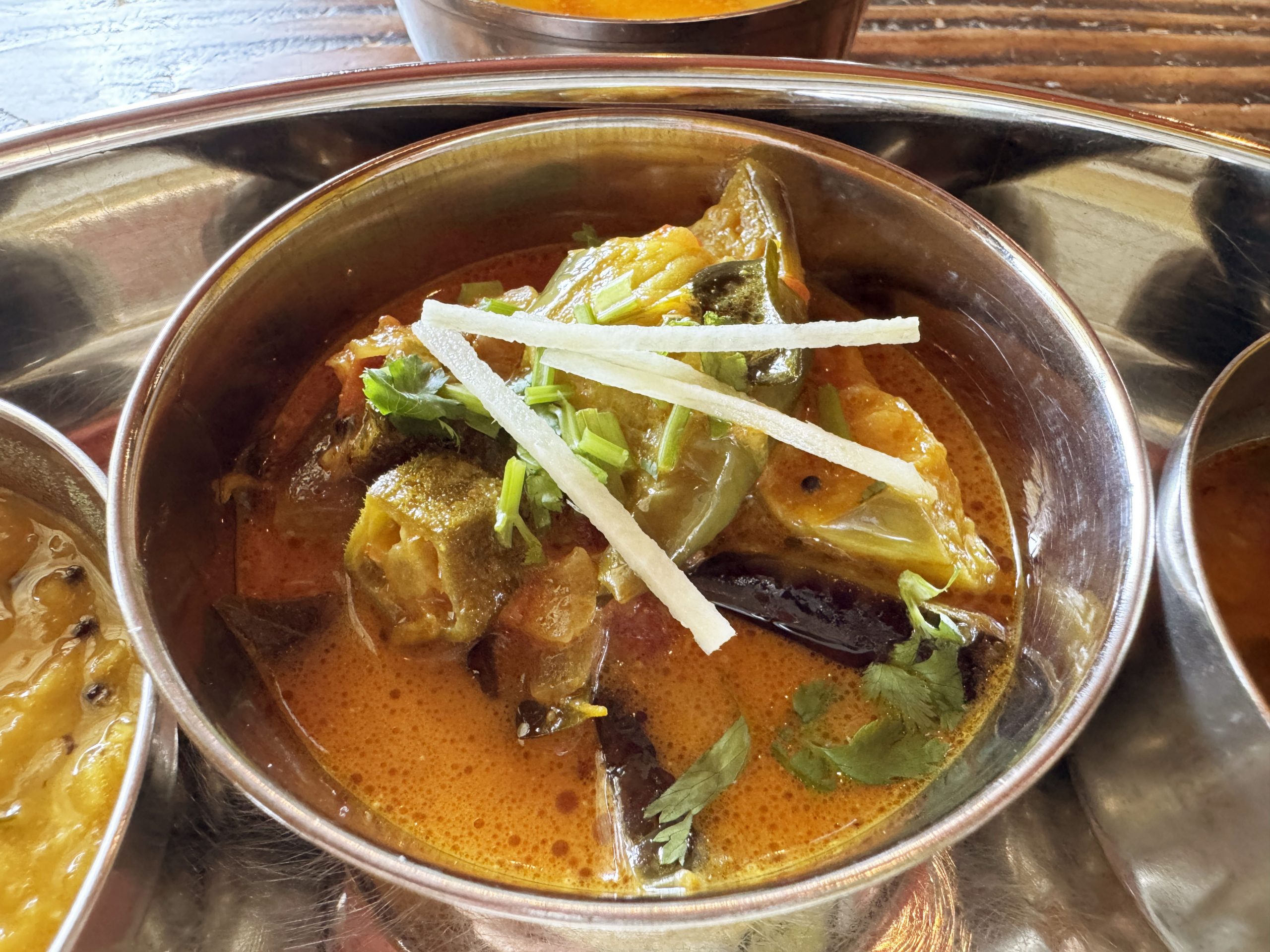 筆者はミールスをオーダー。さまざまなカレーや総菜がセットになったもの。サンバル、ラッサム、カレー、ポリヤル、ダルフライ、アチャール、チャトニ、バスマティライス、パパドがひとつの皿に盛られている。