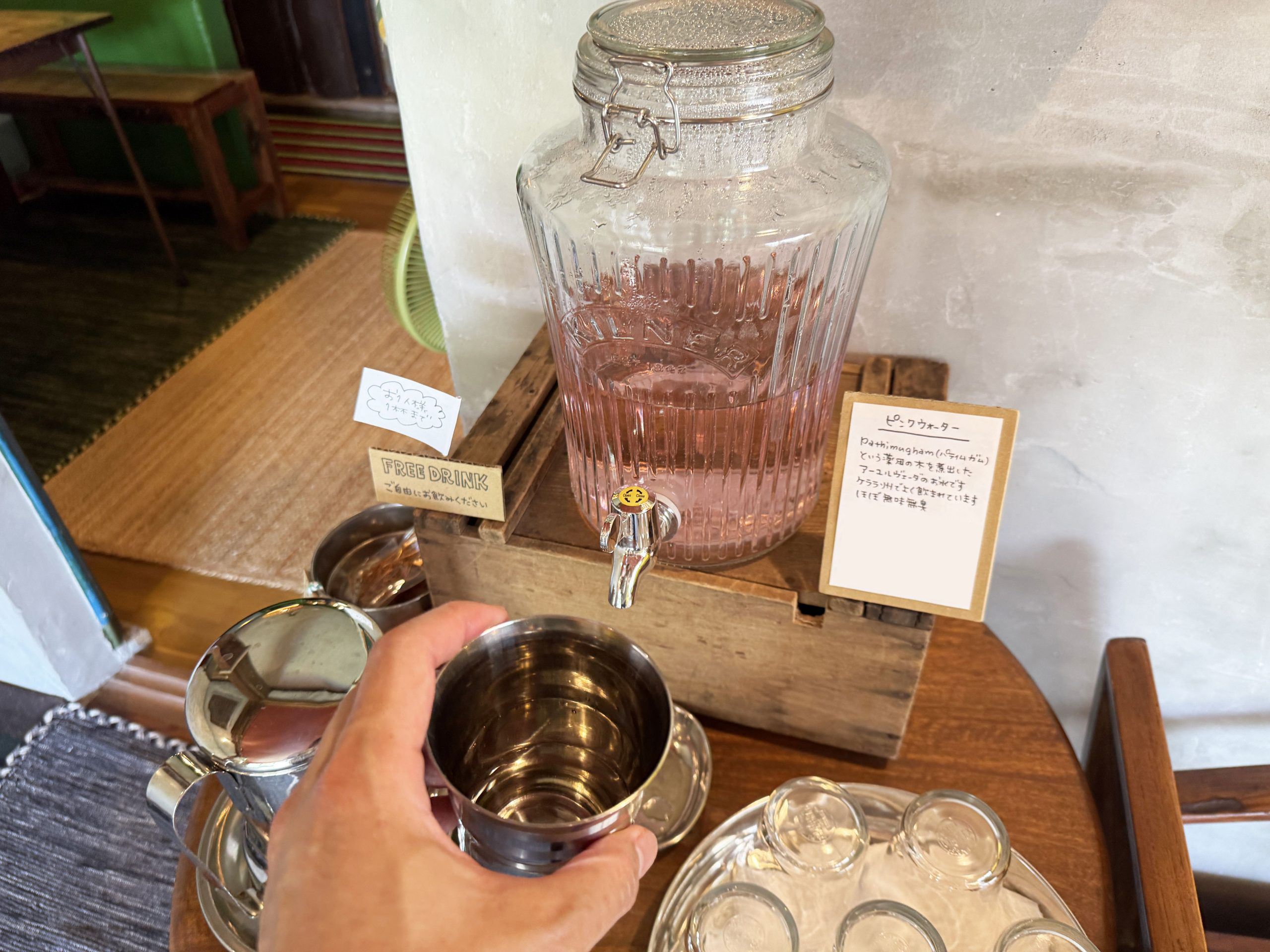 客間にピンクウォーターなる謎のドリンクがあった。インド・ケララ州で愛飲されているアーユルヴェーダ水らしい。そう書かれていると、なんだかおいしい気がしてきた。事実、おいしい。