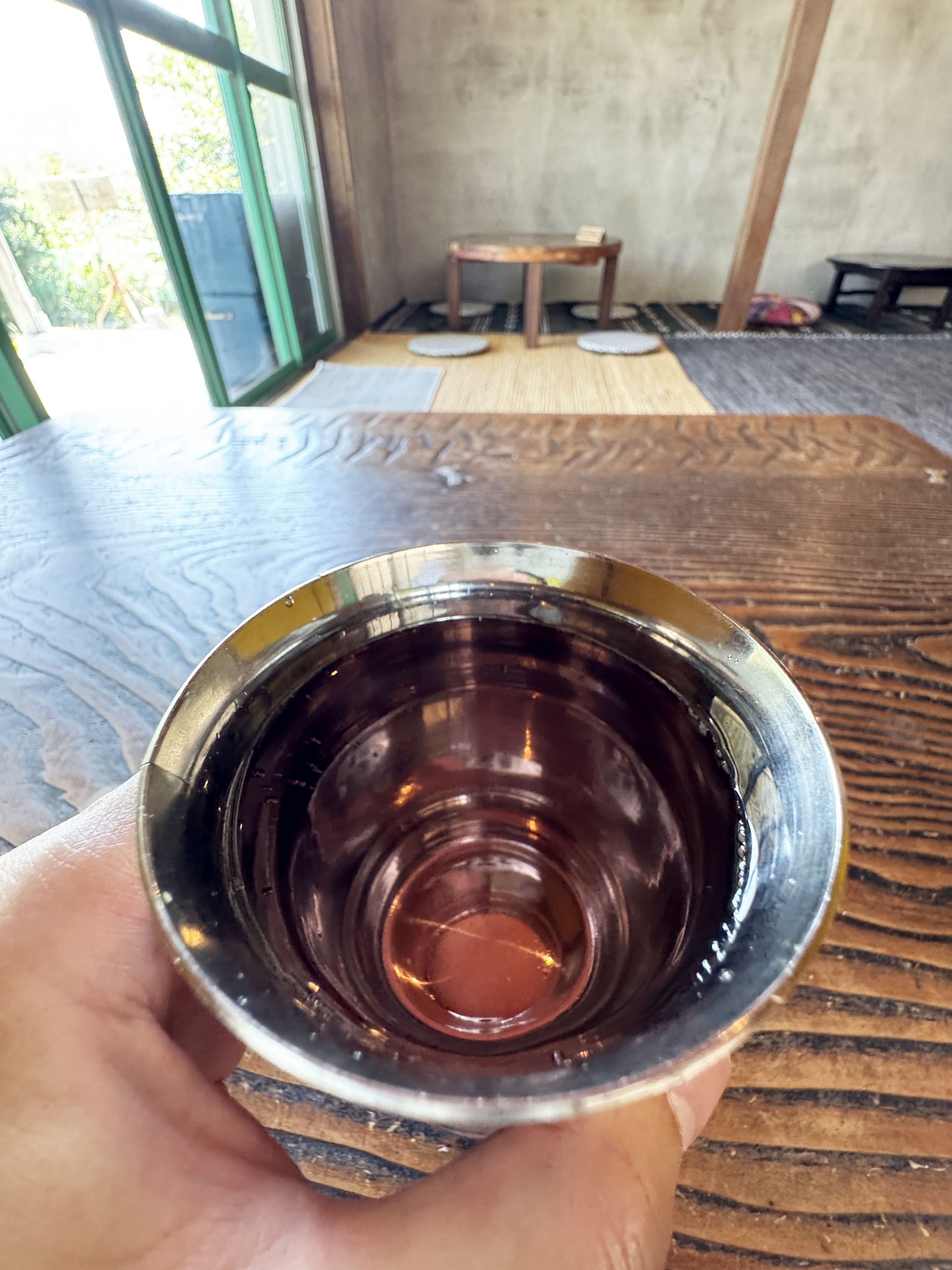 民家っぽい店舗の横道から庭に行き、庭で靴を脱いでから、縁側から入る。まさかの縁側イン。民家っぽく、庭があり、縁側もある。確実に民家的。