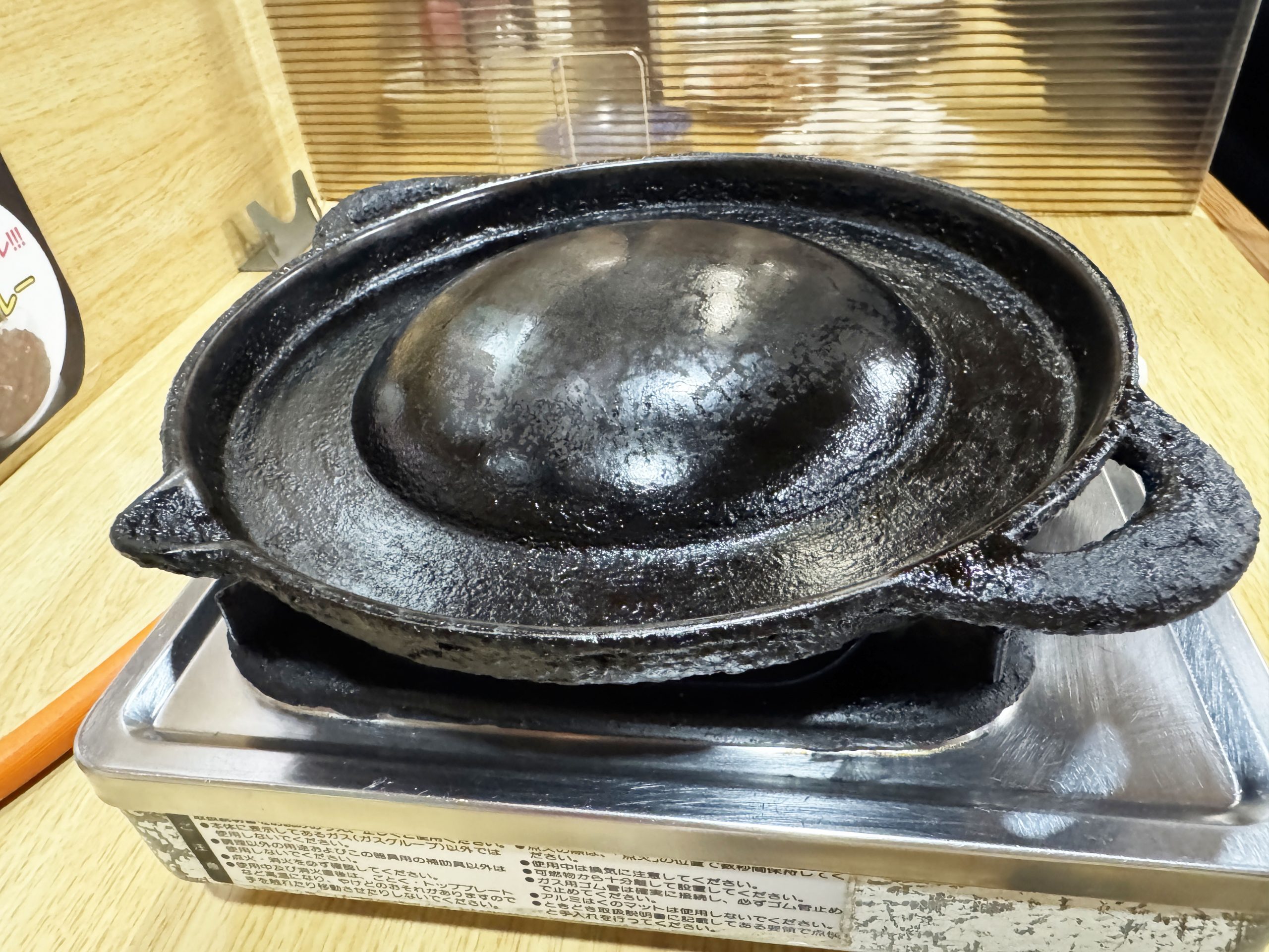 円形の鉄鍋の中央部にふくらみがあり、ジンギスカ焼肉の鉄鍋にも似ているが、ちょっと違う。