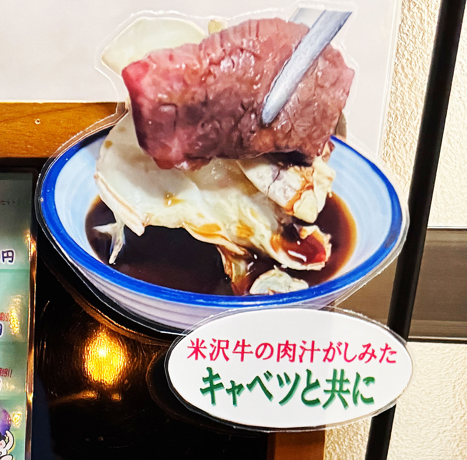 そしてなにより心が躍る一文がメニューに書かれていた。「米沢牛の脂で焼いてけろぉ」「米沢牛の肉汁がしみたキャベツと共に」と! これは期待せずにはいられない。米沢牛を米沢牛の脂で焼くってコト!? あぁ、なんと幸せな展開。ということで、孤独の一人焼肉グルメを体験するべく入店した。