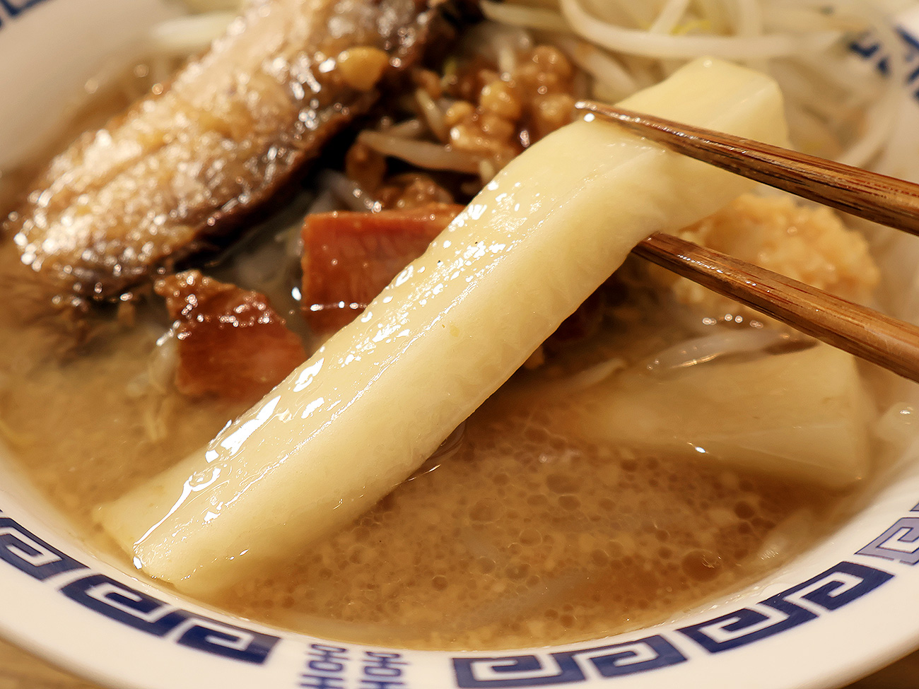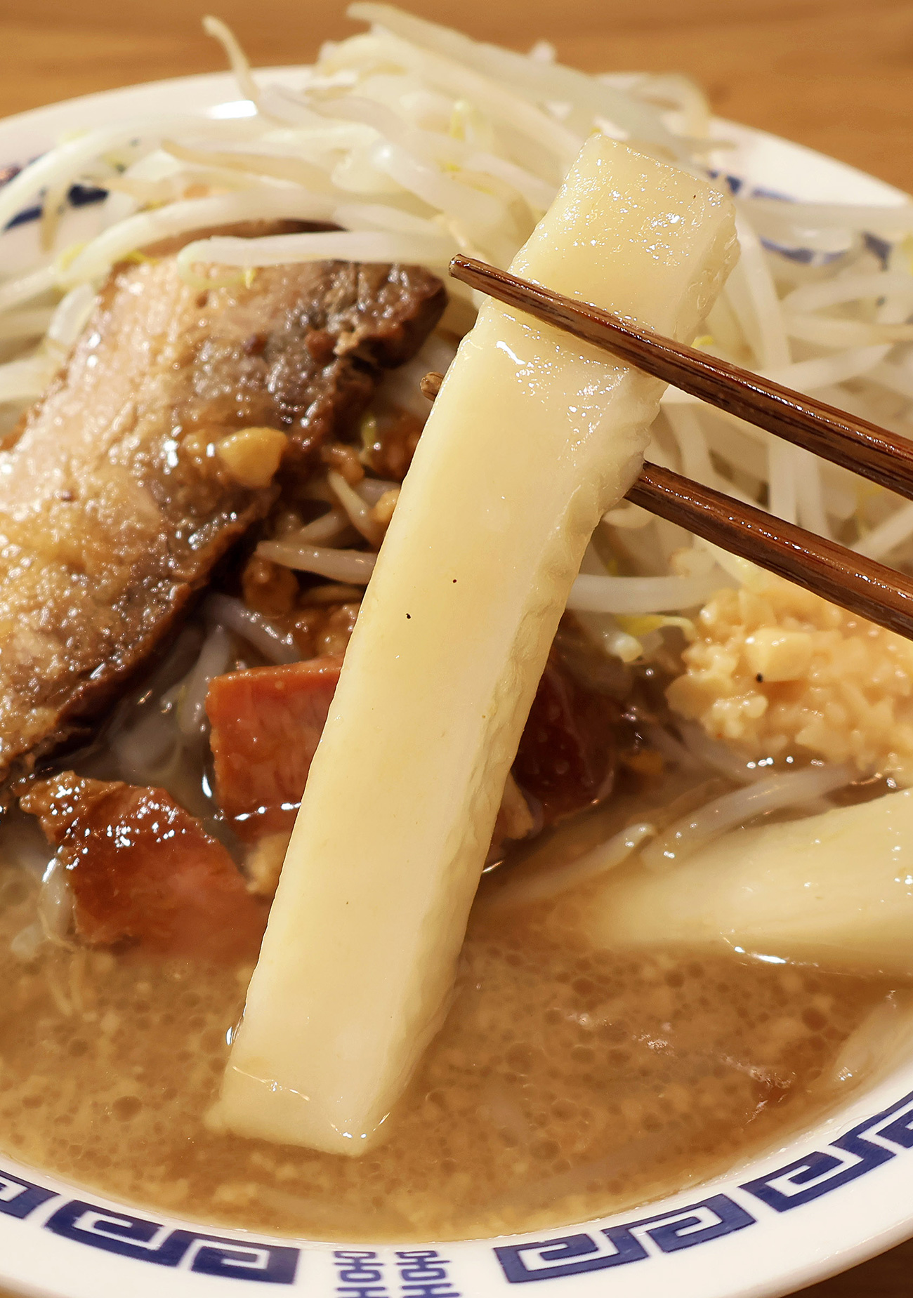 うへへへへっ。なんだこの見た目は。ギトギトの豚ラーメンのスープからひょっこりと姿を現す超極太麺。いや、極太餅。