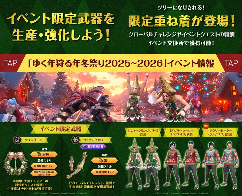 位置情報ゲーム『モンハンNow』の年末年始イベント“ゆく年狩る年冬祭り”が2025年12月22日(月)から2026年1月4日(日)まで2部構成で開催されることが判明。