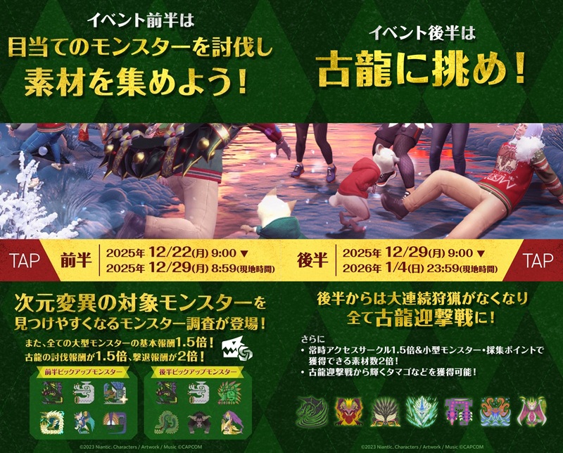 前半(12/22)から大連続狩猟と古龍迎撃戦が24時間化。