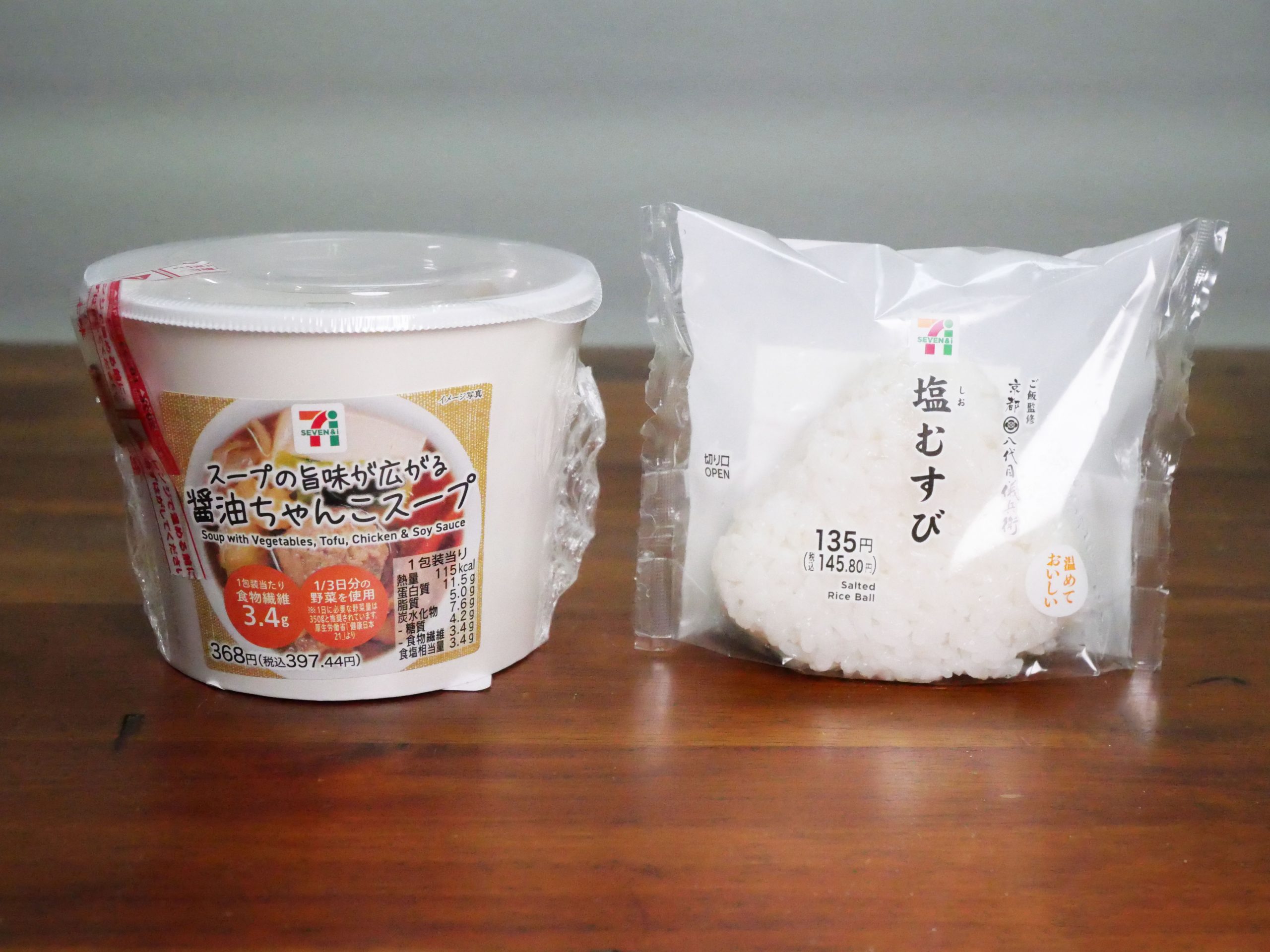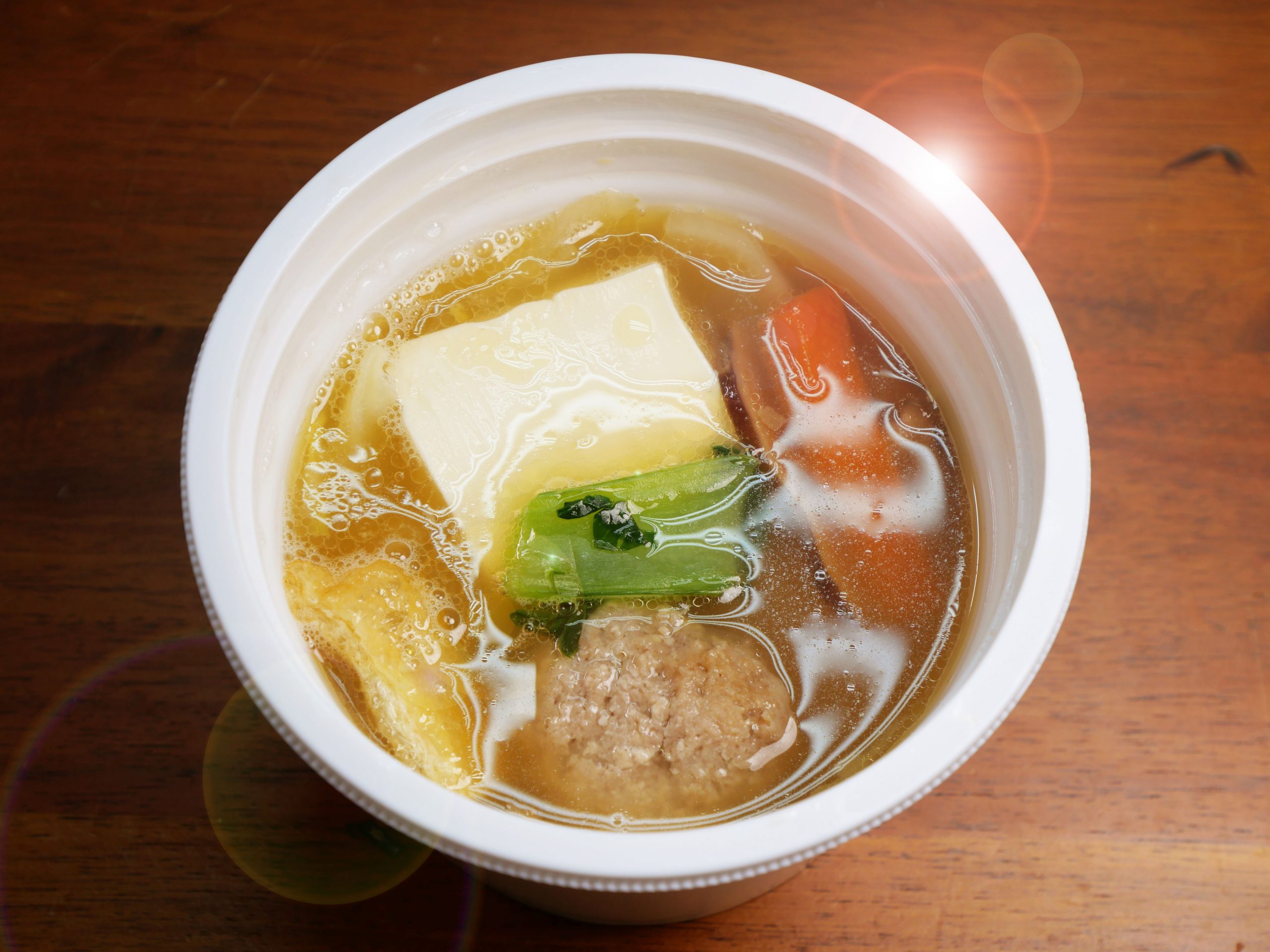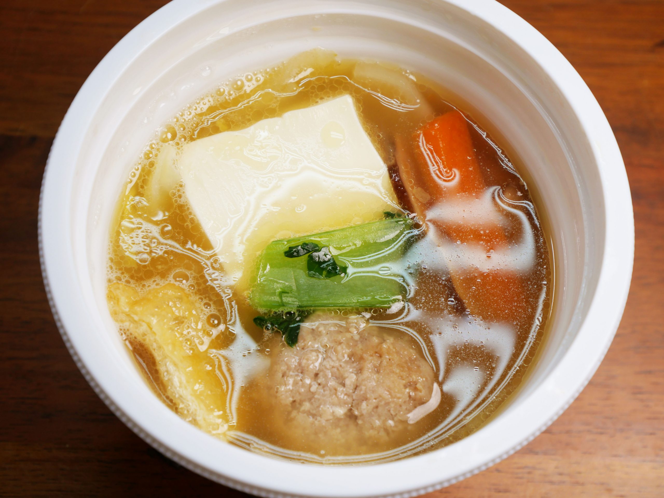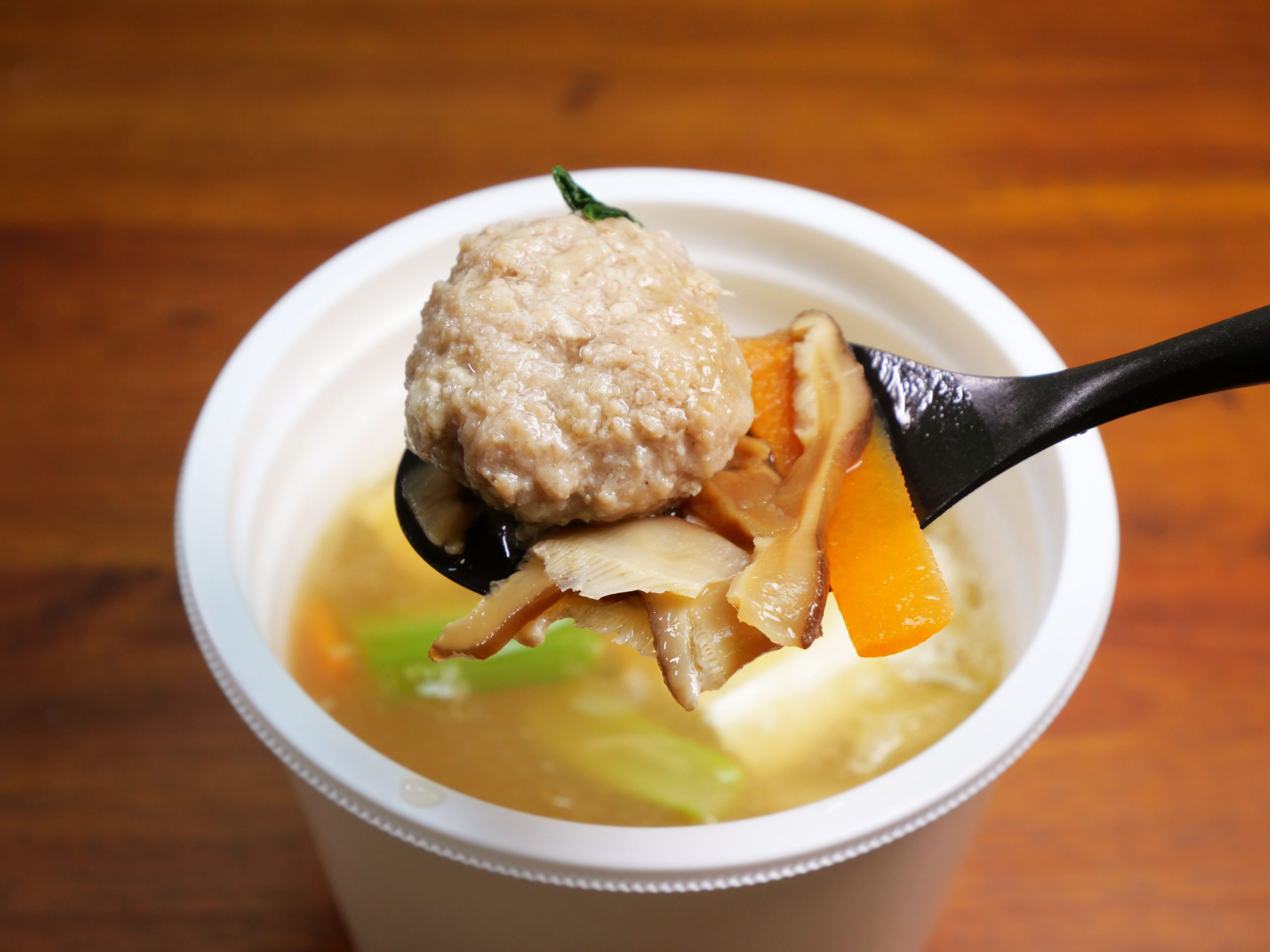 実際にセブンイレブンで「スープの旨味が広がる醤油ちゃんこスープ」と「塩むすび」を購入してみた。スープを温めて開封すると、野菜とスープの薫りが広がってイイ感じ。かなりの具だくさんで、スープに沈み切れず、姿を現している具材。