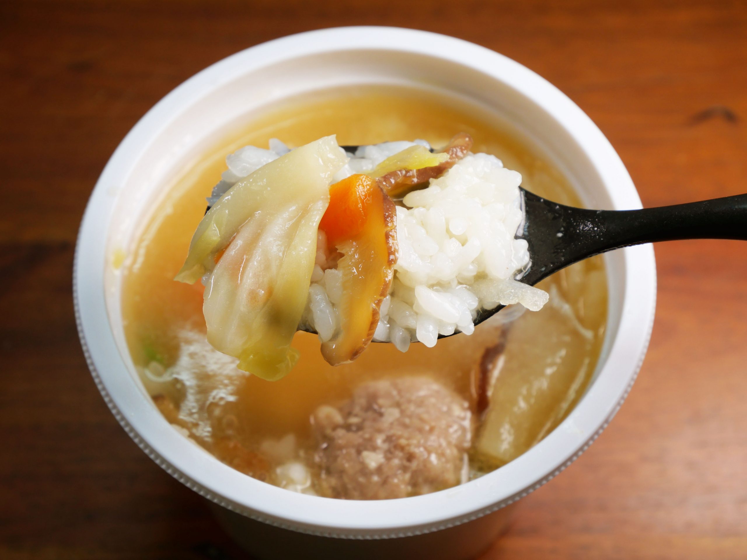 まず最初に、スープ本来のおいしさを楽しむため、おにぎりを入れずに食べてみたのだが、これがもうステキ。野菜由来の旨味と甘味をしっかり深く感じられるステキなスープに仕上がっていた。