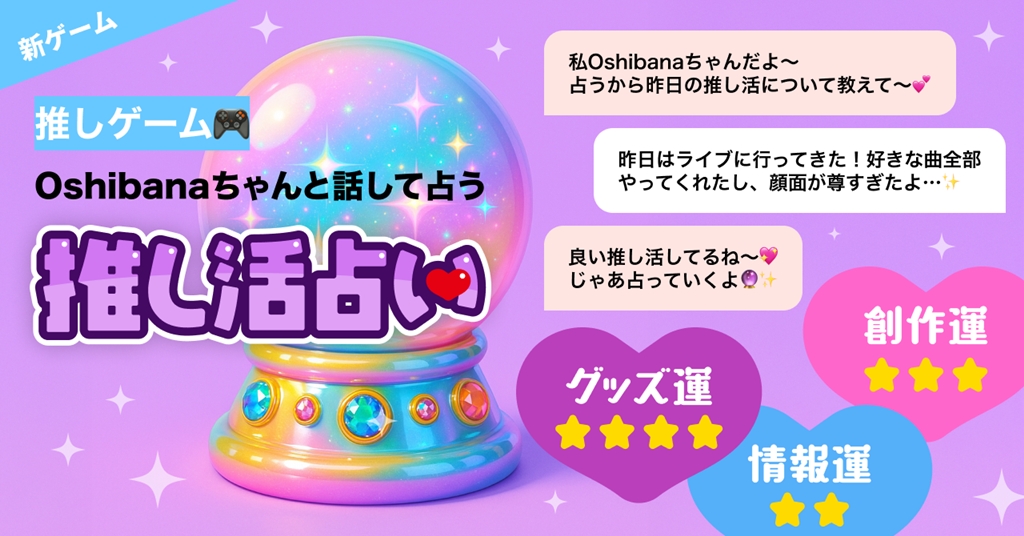 「Oshibanaちゃん」と推し活についてお話しすることで、推し活に関する運勢を教えてくれる占いコンテンツ。グッズ運、情報運、創作運など、ユーザーに合わせた推し活運勢に寄り添って占ってくれるという。