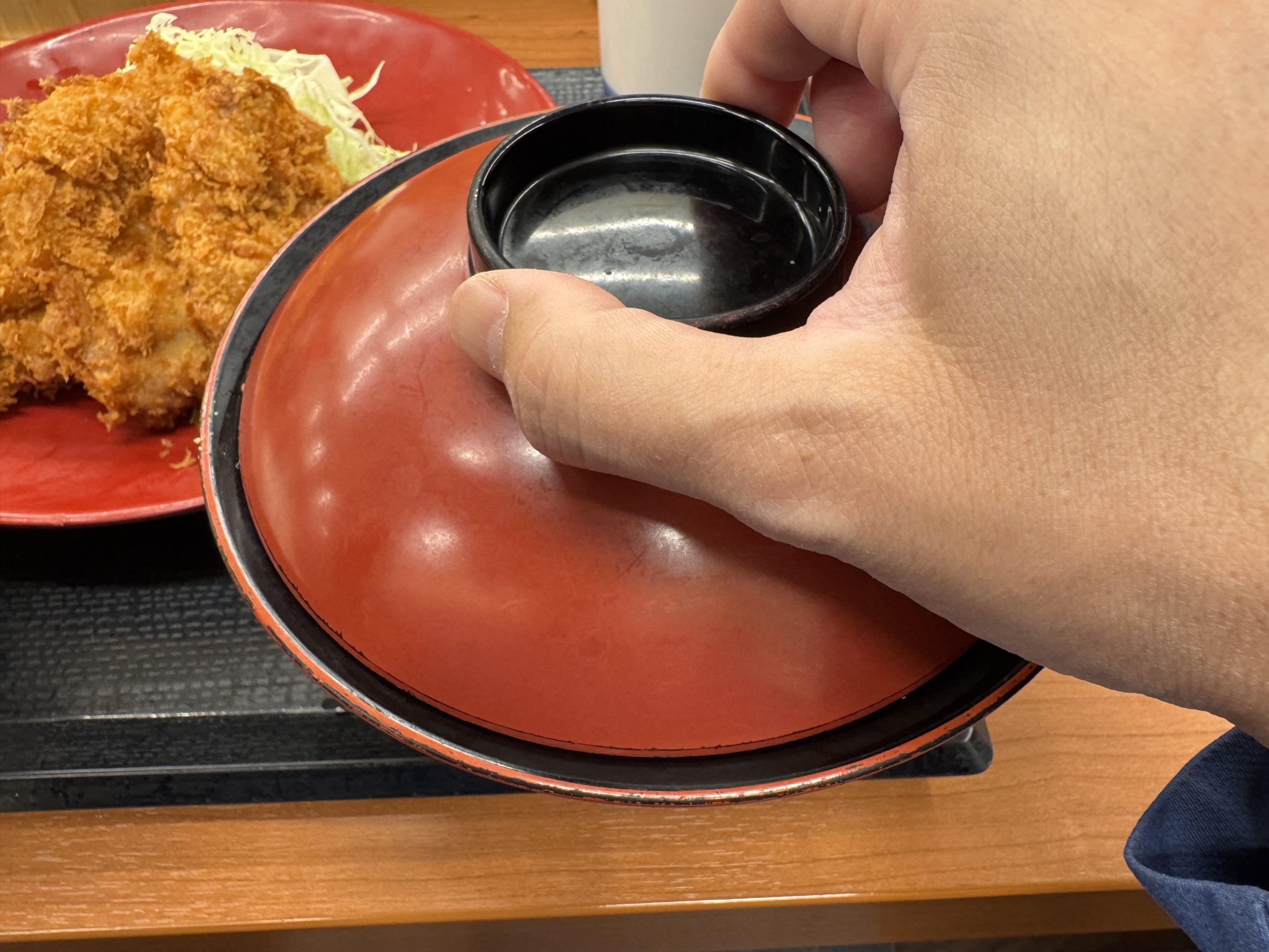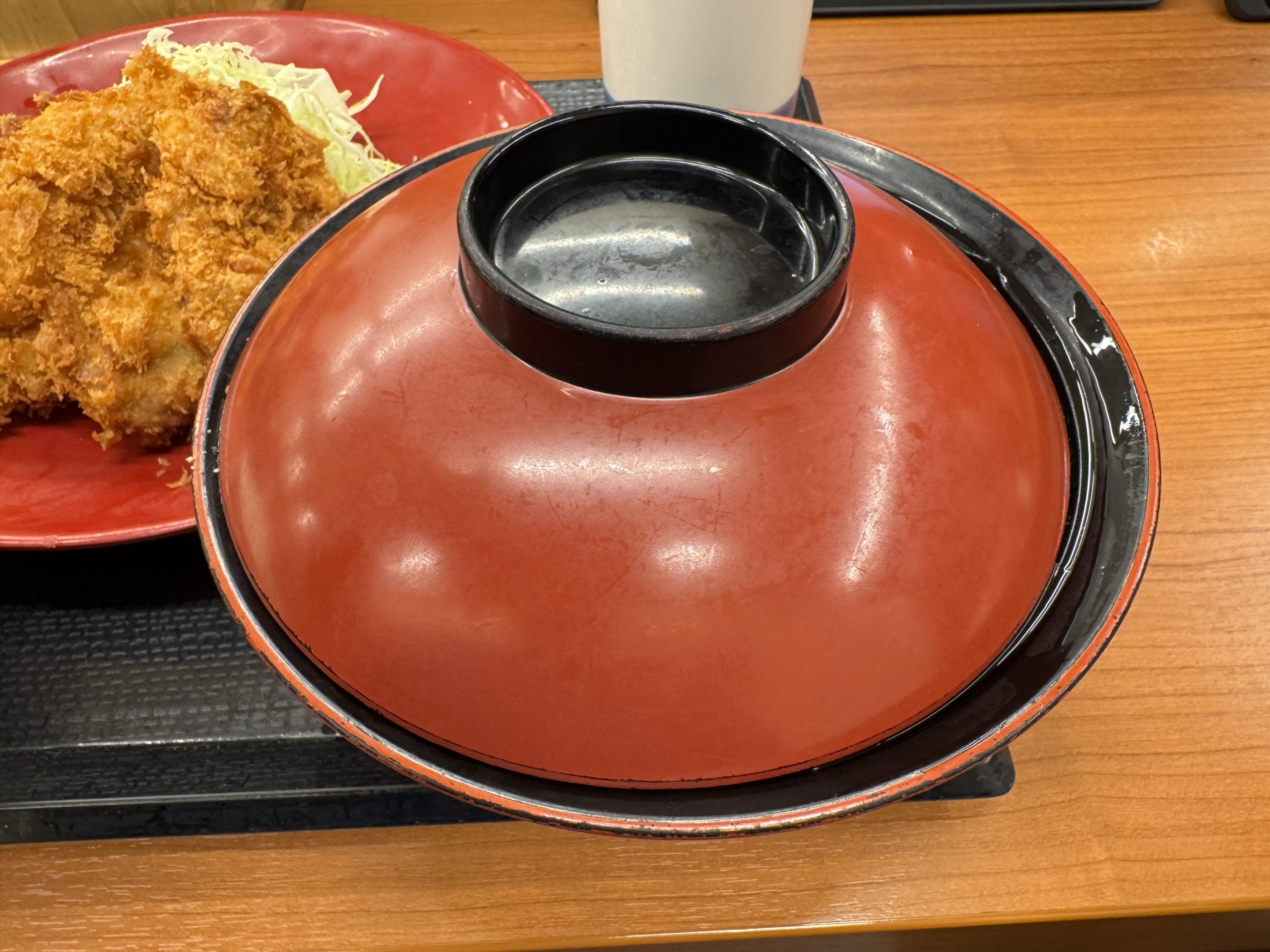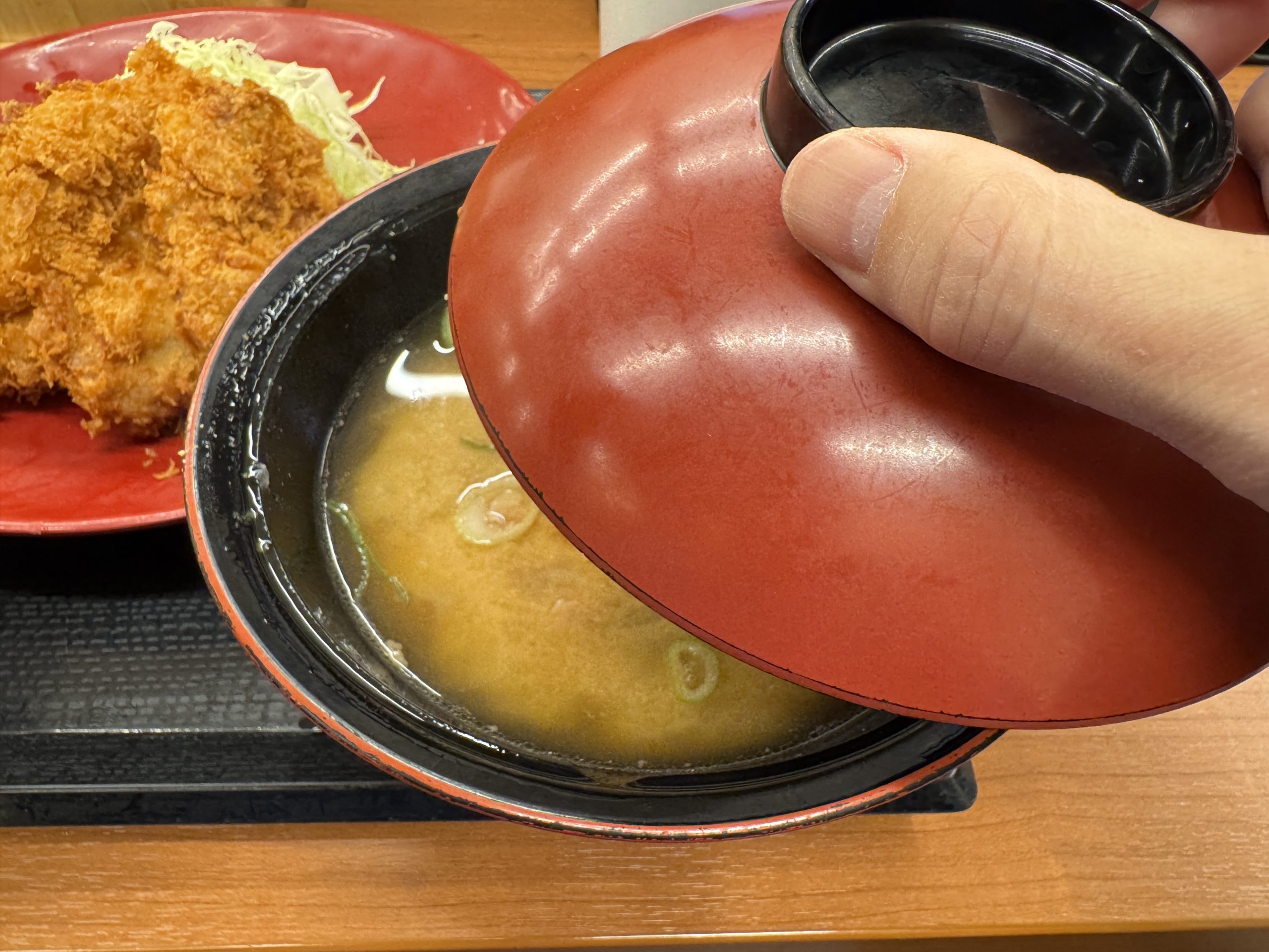 ということで、実際にかつやに行って豚汁を食べてみることにした。今回はヒレカツ定食をオーダー。豚汁はヒレカツ定食のなかに含まれているが、ナガノ先生が絶賛するほどの豚汁ということで、今回は豚汁を大サイズにしてみた。