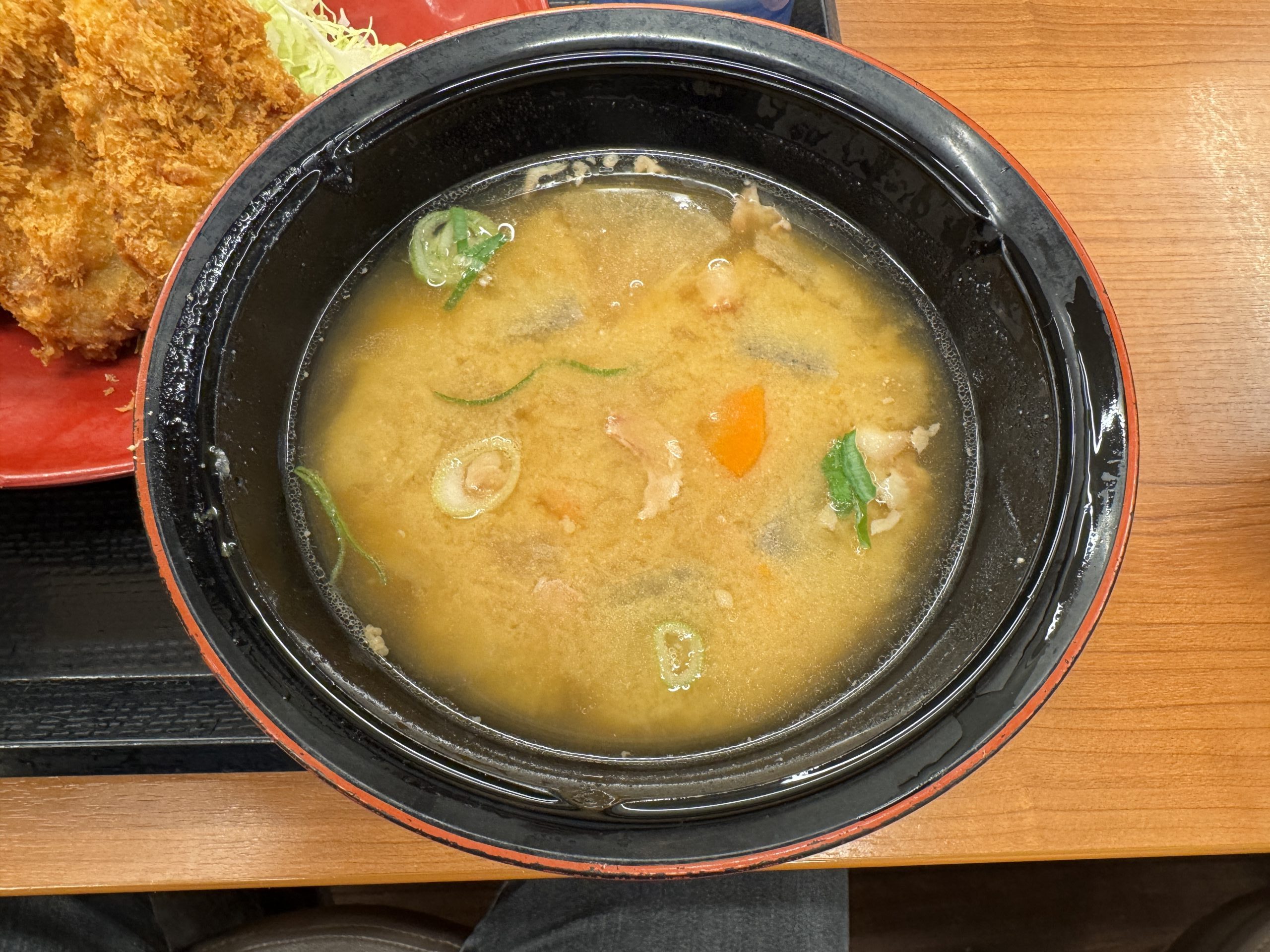 味噌の強いコクと薫りはそのままに、塩味が極めて穏やかで、ゴクゴク飲んでもしょっぱさが皆無。あくまで、必要最低限の塩味で野菜と豚肉、そして味噌の旨味を支えてくれている。素晴らしすぎないか!? かつやの豚汁。