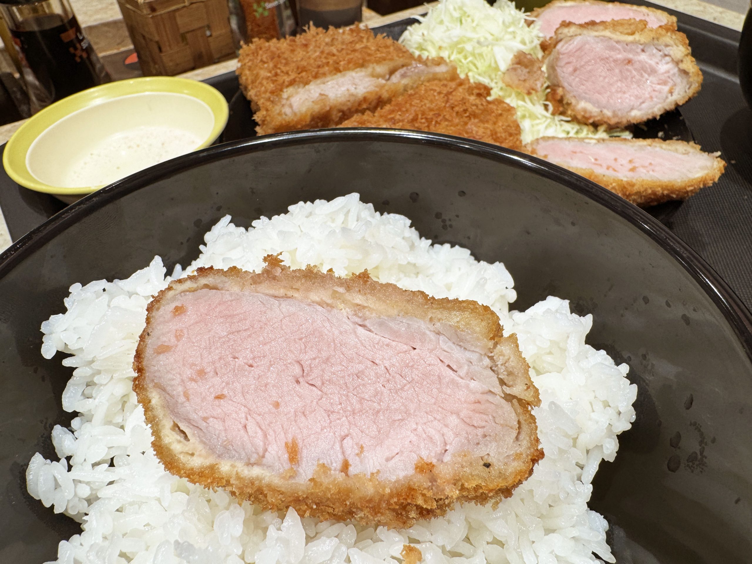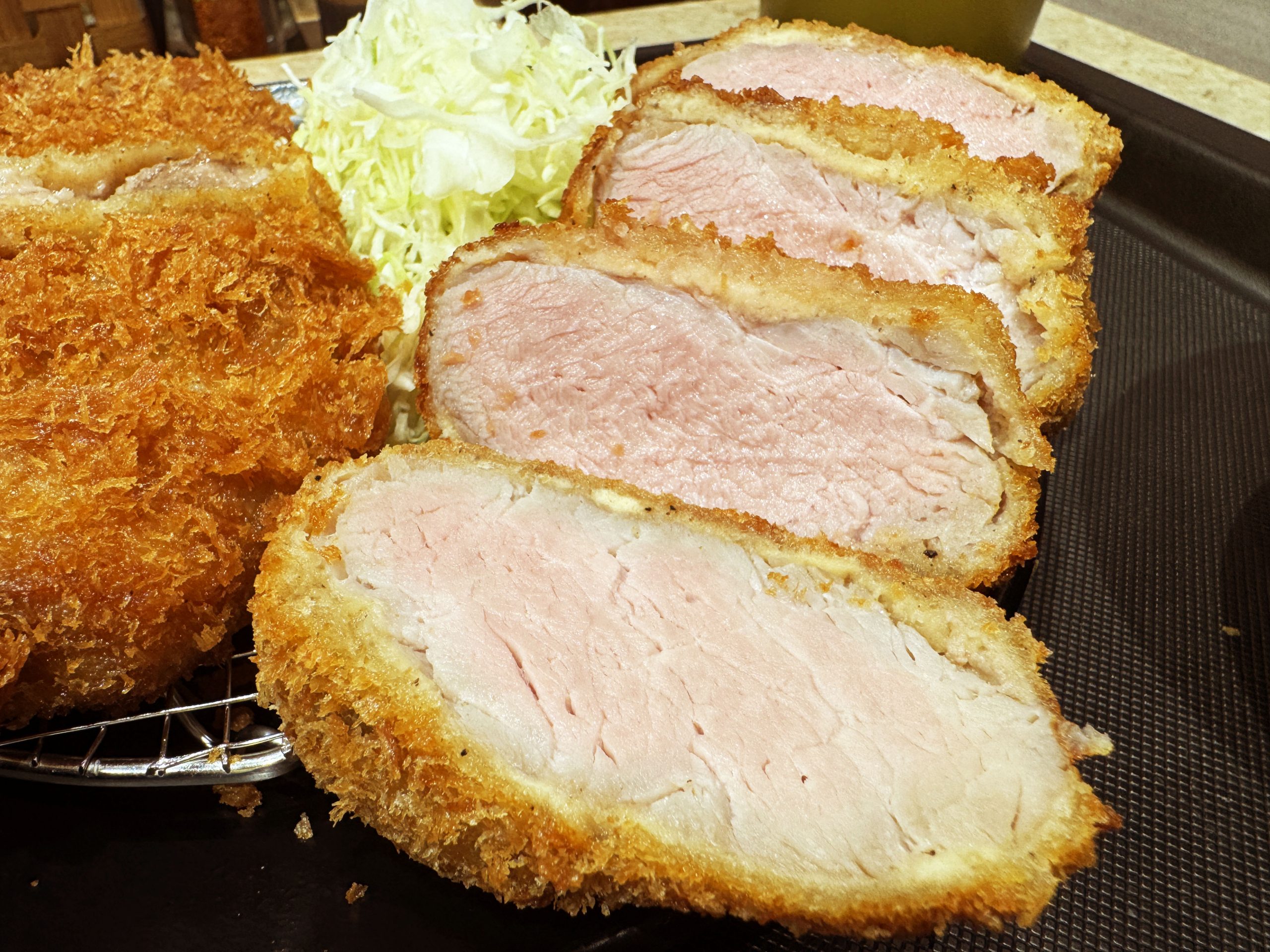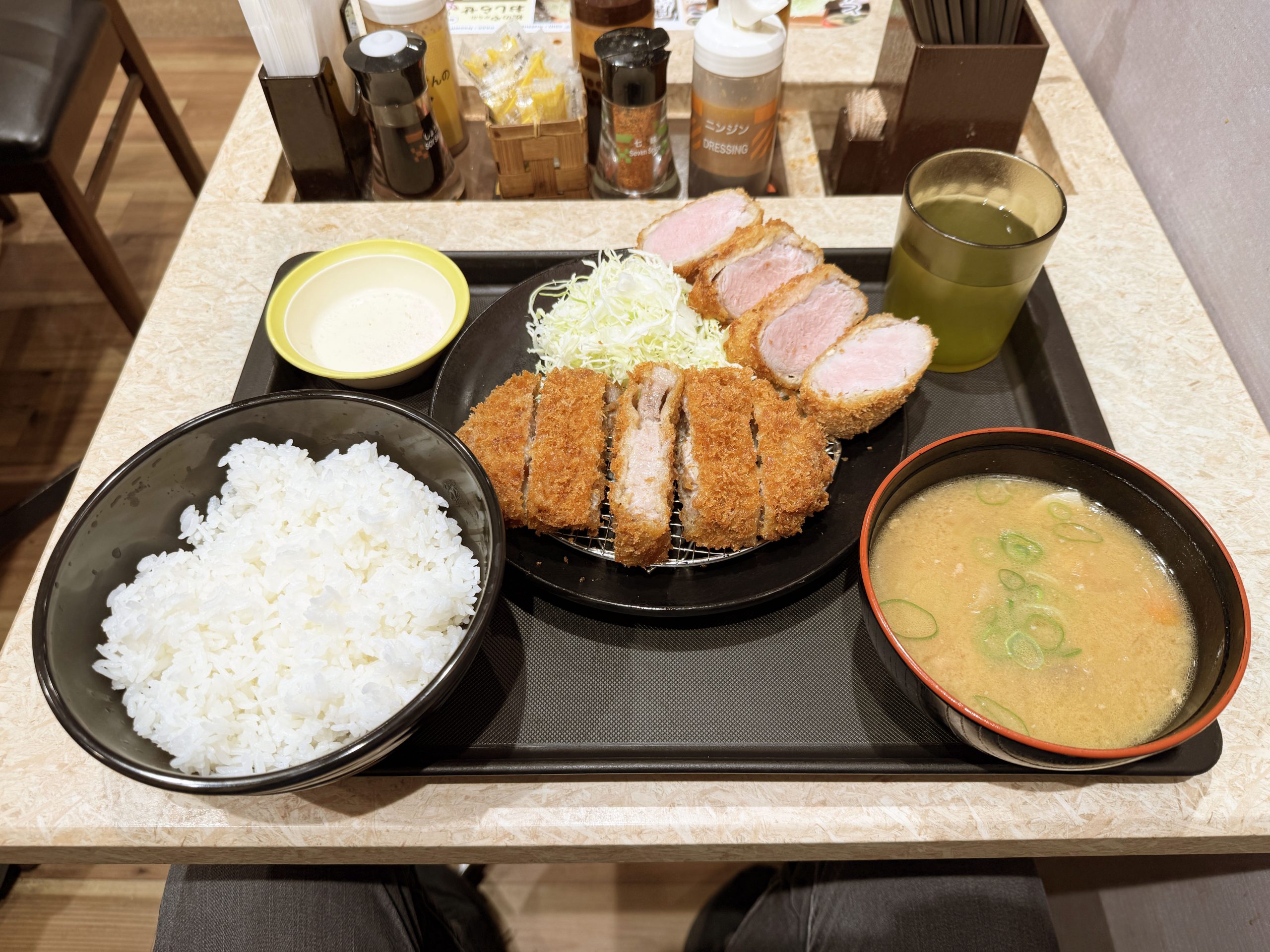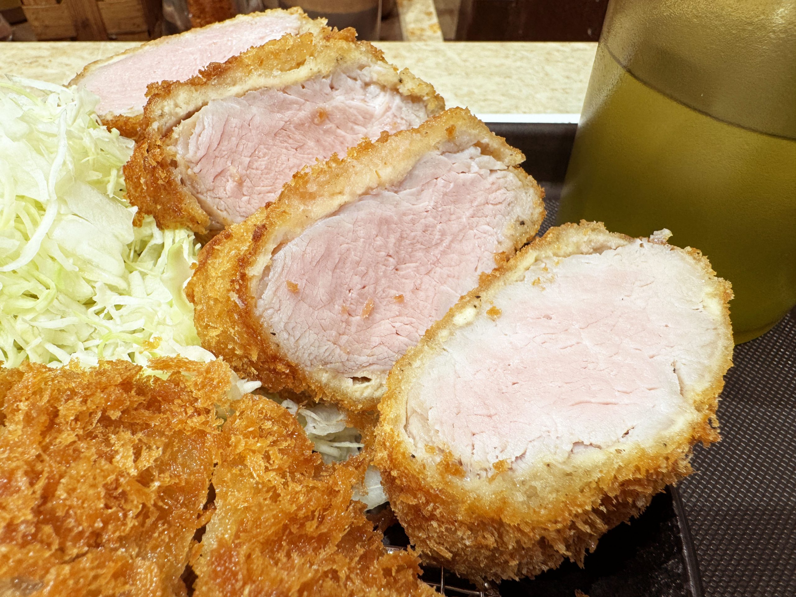 そんな松のやが、店舗限定メニューとして「国産雪国育ち厚切りロースかつ&極厚レアヒレかつ定食」を販売していると聞いて、じっいに食べに行ってみたのですが、いやー、ステキなとんかつでした。まず、ロースとヒレの双方が楽しめる点で素敵じゃあないですか。