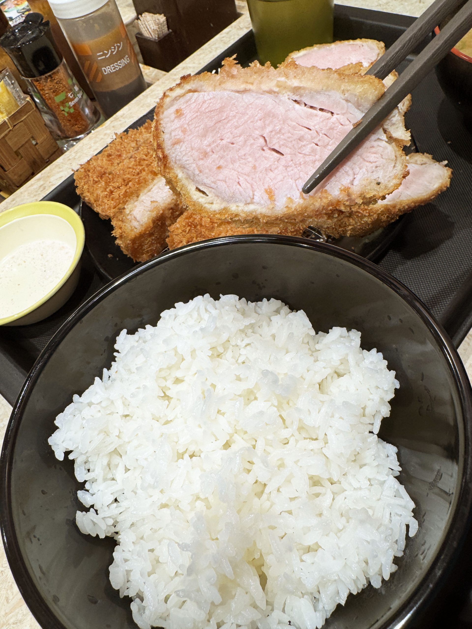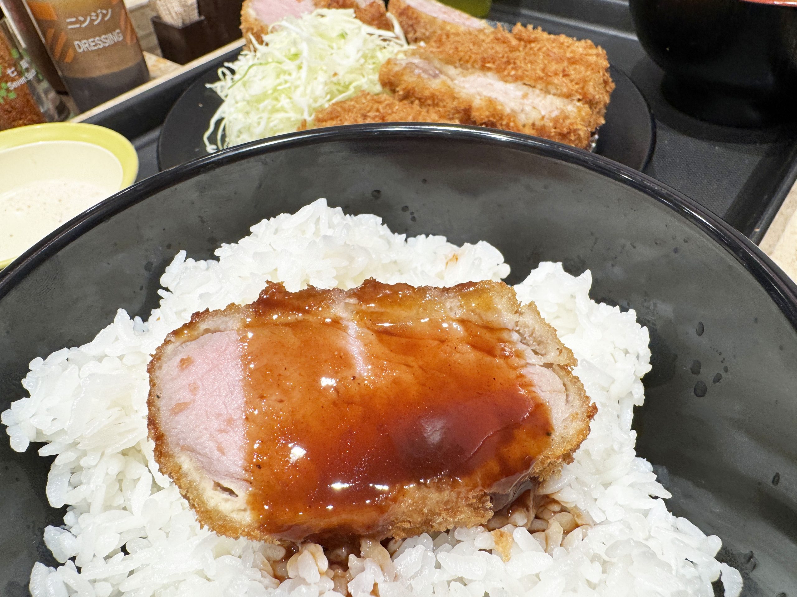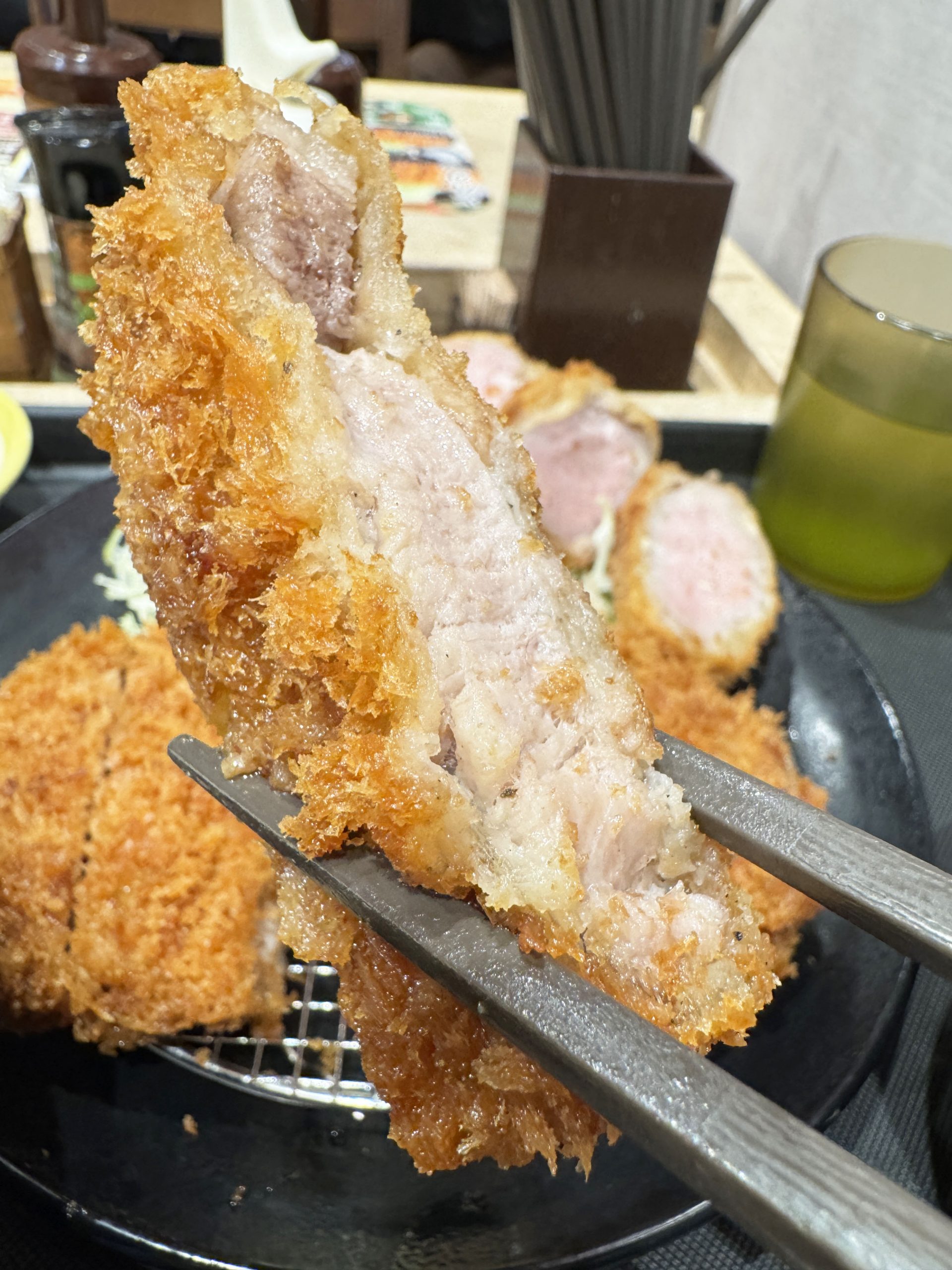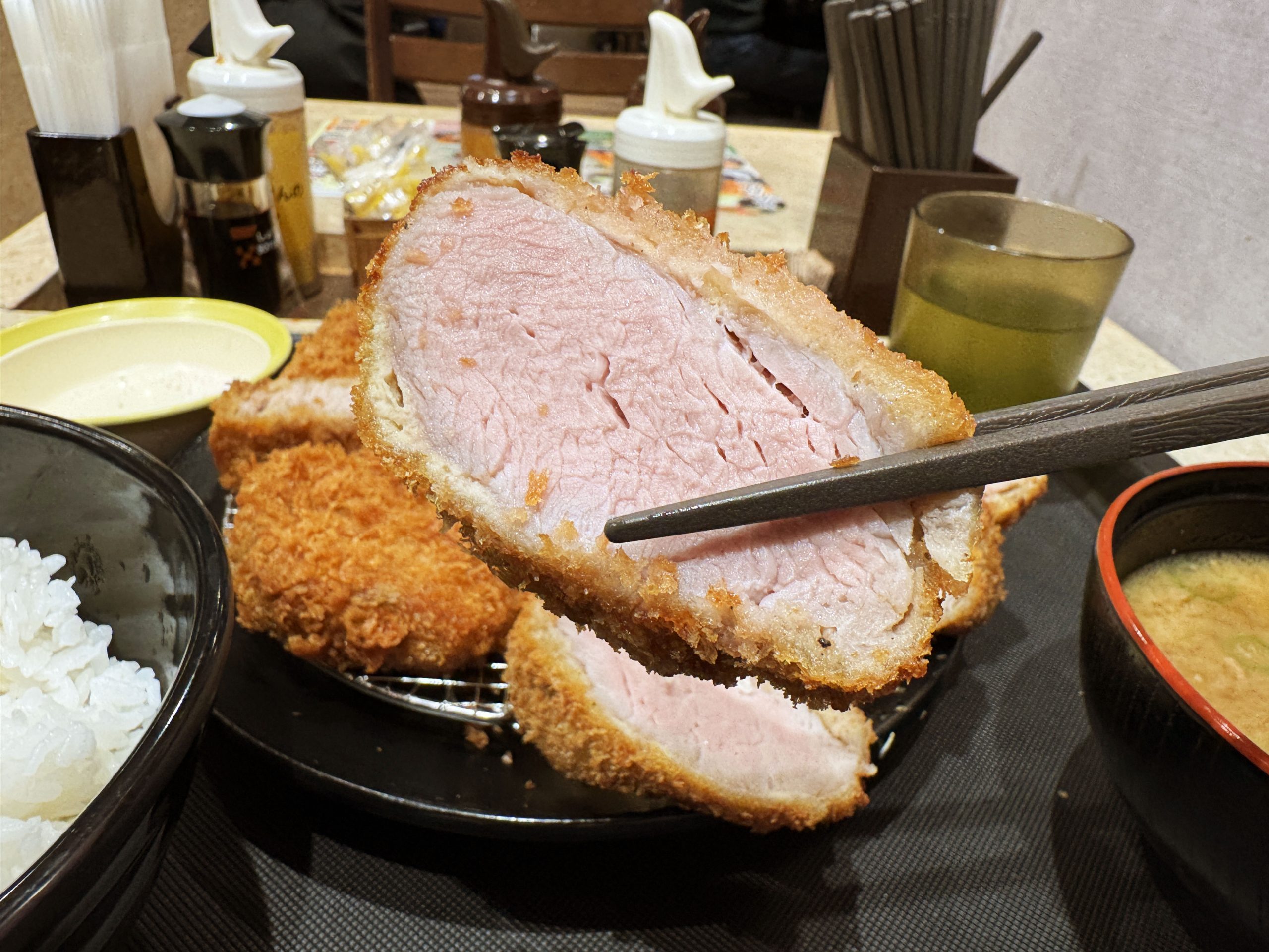 そんな松のやが、店舗限定メニューとして「国産雪国育ち厚切りロースかつ&極厚レアヒレかつ定食」を販売していると聞いて、じっいに食べに行ってみたのですが、いやー、ステキなとんかつでした。まず、ロースとヒレの双方が楽しめる点で素敵じゃあないですか。