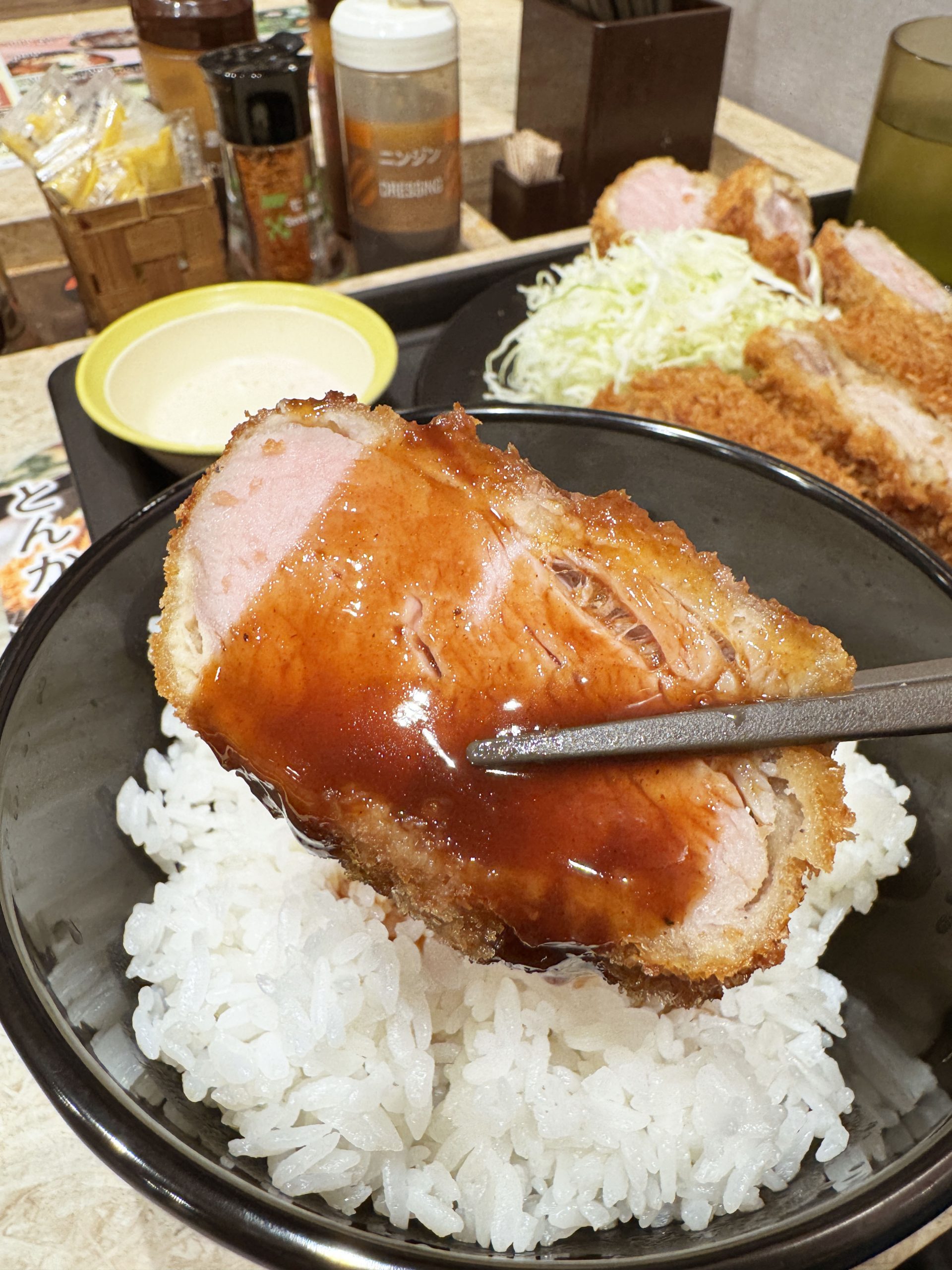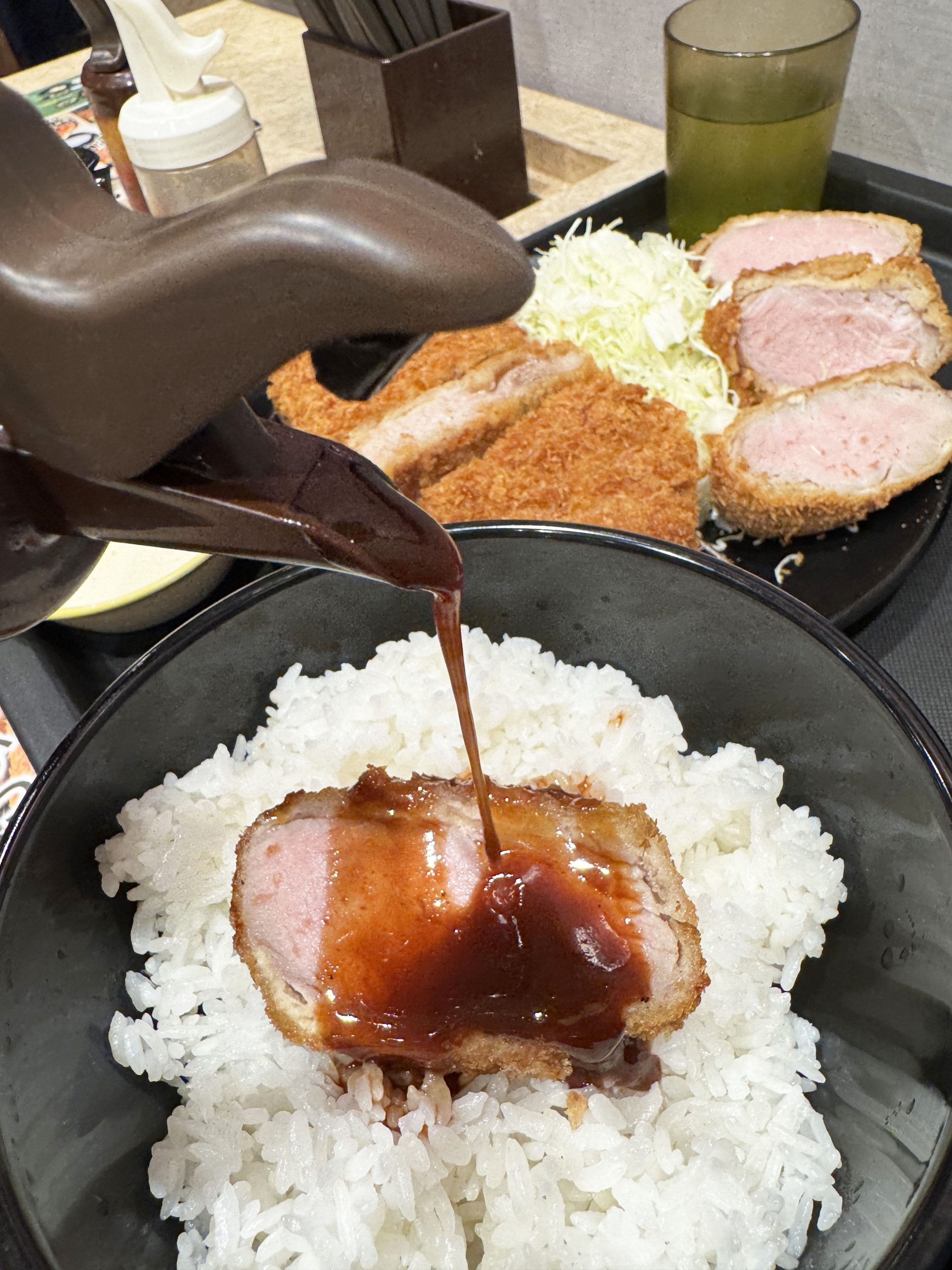 オススメの食べ方は、極厚レアヒレかつをライスにのせて、たっぷりとソースをかけて食べる方法。極厚レアヒレかつは塩でも美味ですが、ソースも良いのです。ソースがしみ込んだライスも美味ですよ。