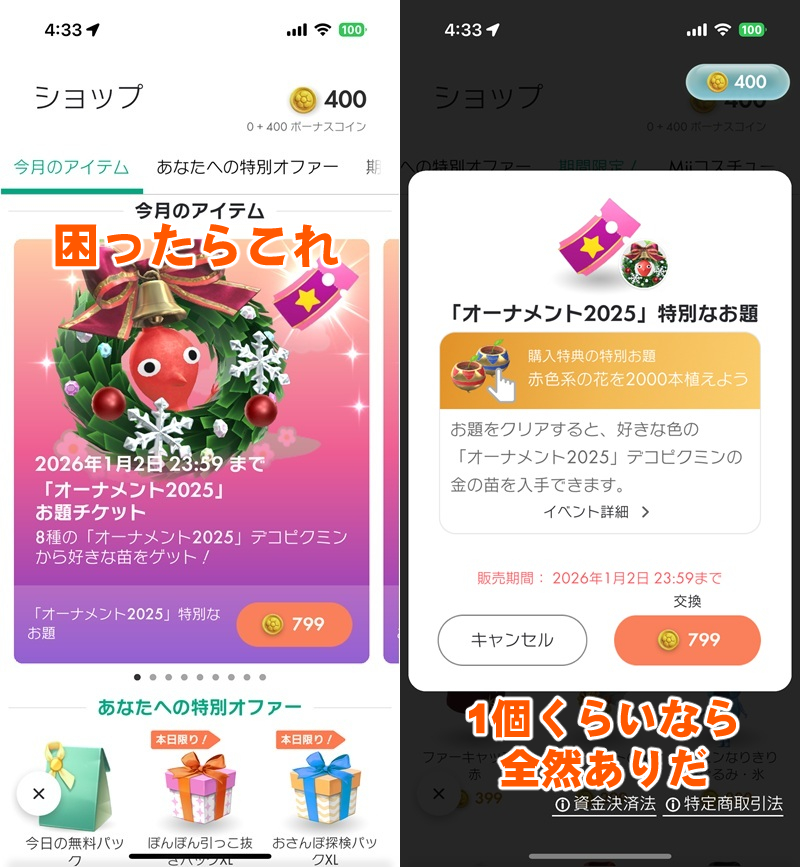 それが、何パーセントのユーザーが“選べる苗”を購入せず、イベント限定のデコピクミンをコンプリートできているのかという問題だ。