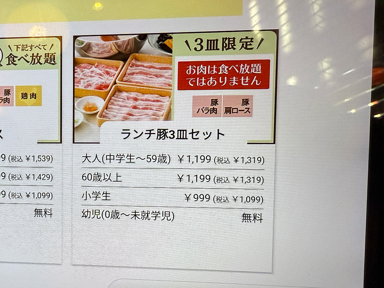 ちなみに僕の最寄り店舗では「豚3皿+野菜食べ放題」が税込1,319円でしたが、店舗によっては「豚2皿+野菜食べ放題」で1,099円のセットを販売していたり、いろいろとバリエーションもあるようです。