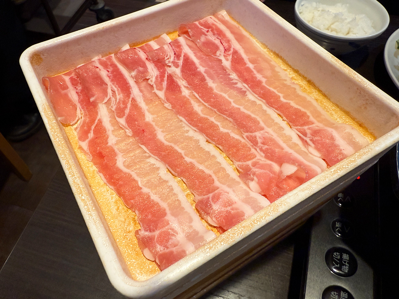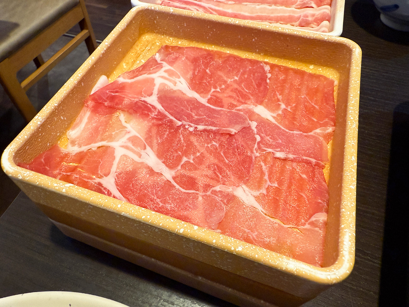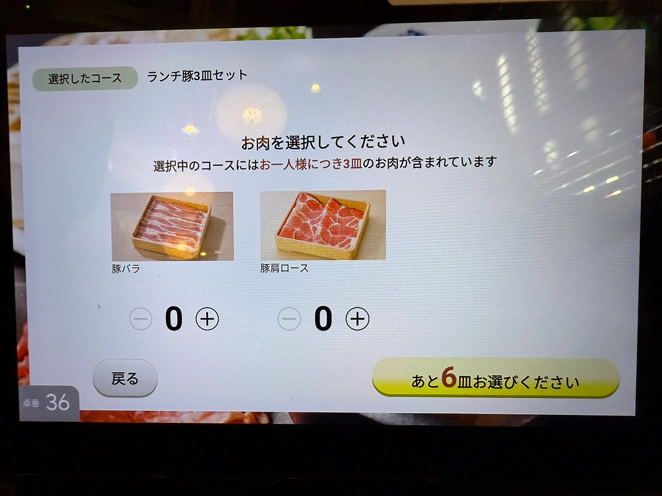 「豚3皿+野菜食べ放題」のセットでは豚肉をバラ肉と肩ロースか選択可能。この日は2人で行ったので、それぞれ3皿ずつ注文しました。