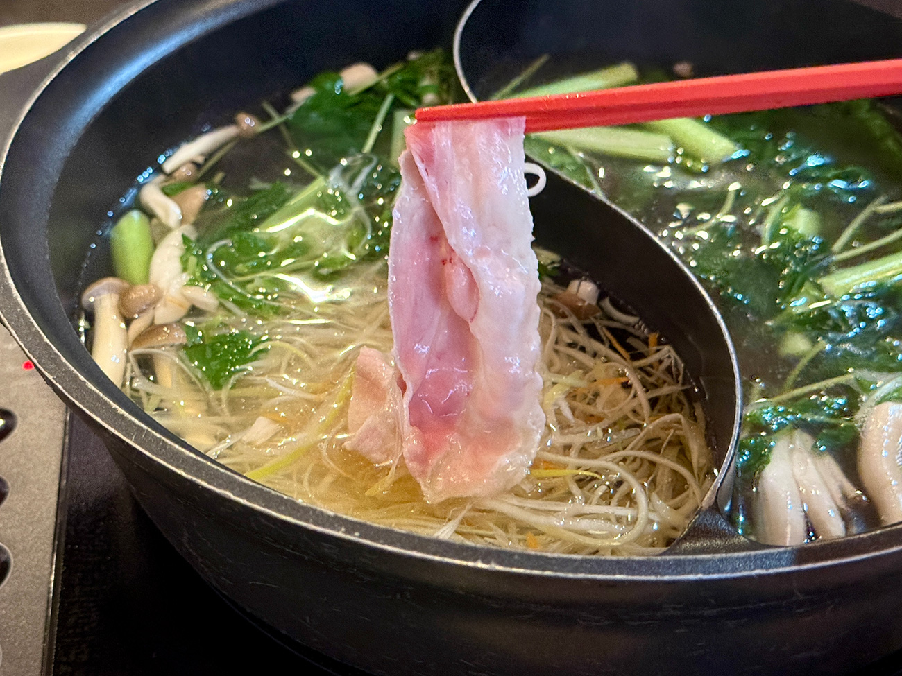野菜をたくさん入れるとダシの風味が変わっていくのもいい感じ。ちょっとこれ、いつものしゃぶ葉と全然違うスタイルだけど、これはこれでめちゃくちゃいいぞ……!