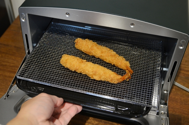 ちなみに本機はパンのほか、ピザやグラタンなどの本格料理にも対応。付属の受け皿を使えば揚げ物も余分な油を落としながらサクッと温め直せます。ということで、次は海老フライをリベイクすることに。