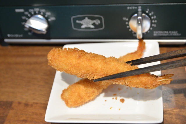 準備としては、メッシュ仕様の焼き網の下に黒い受け皿を忍ばせてセットします。海老フライは2尾なら160℃で4~5分が目安(1尾約25gの場合)。焼いてみると、こちらもナイスな感じに仕上がりました。