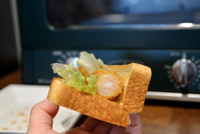 こちらに、焼いた食パンを合わせて、海老フライトーストサンドを作ってみました。この際、エイッと海老フライをカットして断面を見ると、プリッとした感じになってるではありませんか!