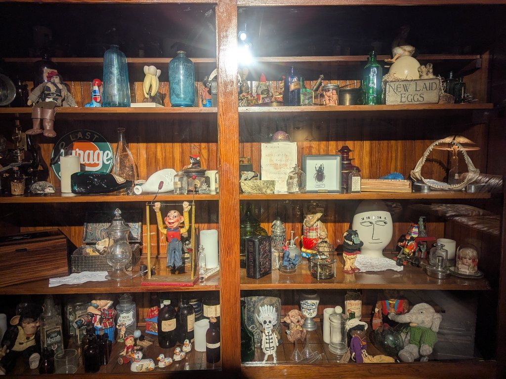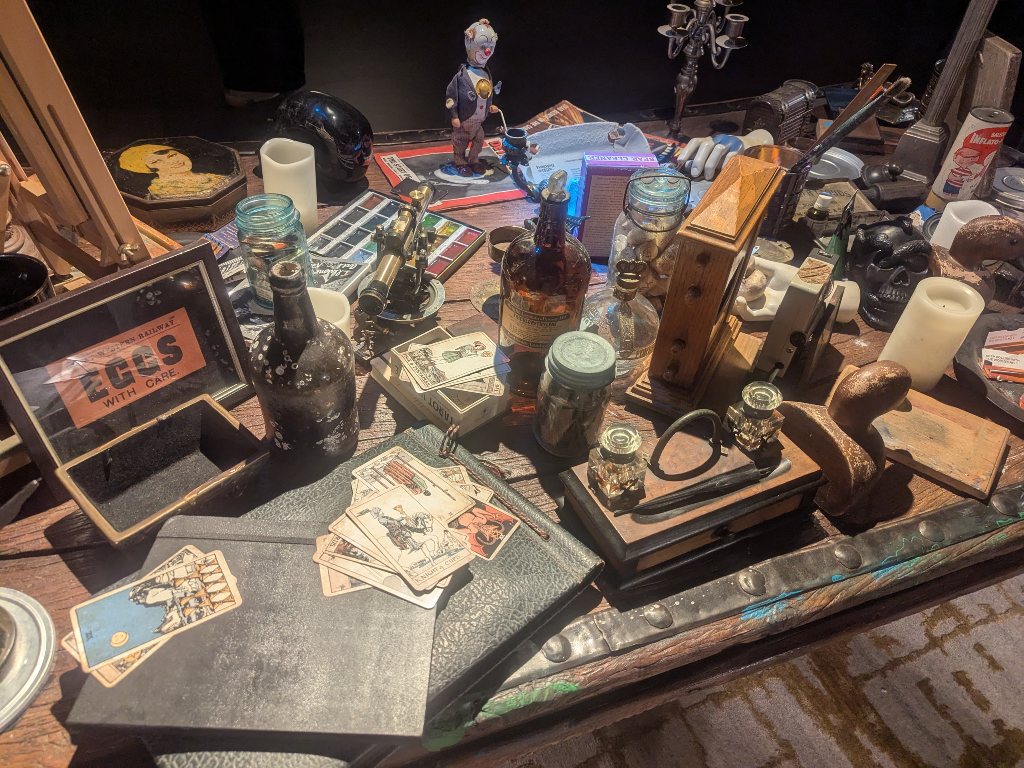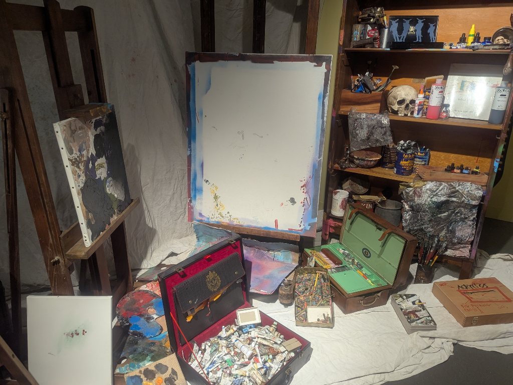 続いて、アンティークな机にタイプライターが置かれた、ジョニー・デップの書斎風コーナーが。展覧会タイトルを直訳すると「たくさんのもの」なので、作品だけではなくジョニー・デップのおしゃれな私物も展示されているようです。別のスペースには、ソファーとテーブル、棚がセッティングされ、テーブルと棚にはアンティークの素敵なオブジェが大量に並んでいました。キャンドルやタロットカード、ブリキのおもちゃ、木の像、画材など。ベクトルは違いますが、物量や収集癖などみうらじゅん氏のコレクションと通じるものがあります。この中に「いやげもの」や「冷蔵庫マグネット」などが混じっても違和感なさそうです。ジョニー・デップの制作環境を再現したコーナーも。テーブルをパレットがわりにして絵の具を盛ったり、惜しまずに大量の絵の具を使ったりしているところにセレブの財力を感じました。