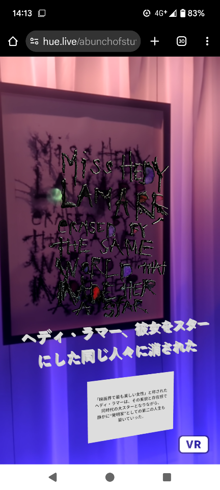 ARの技術を使った作品は「ヘディ・ラマー」シリーズ。親友でありバンドメイトでもあったギタリスト、故ジェフ・ベックとともに演奏した「This is a Song for Miss Hedy Lamarr」の歌詞が書かれています。特設サイトにアクセスしてスマホをかざすと、作品解説が表示されました。字が小さすぎて読みづらいですが、60代になっても先端技術を取り入れるジョニー・デップの精神的な若さが表れているコンテンツです。この展示ではじめてヘディ・ラマーと言う歴史的な女性を知りました。1930~40年代に活躍したオーストリア出身の映画女優で、発明家としての顔も持っていて、彼女が開発した周波数ホッピング技術は、今のWi-Fiの基盤になっているそうです。施設のWi-Fiに接続し、このARコンテンツを楽しむことが、ヘディ・ラマーへのオマージュになります。