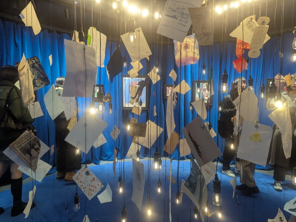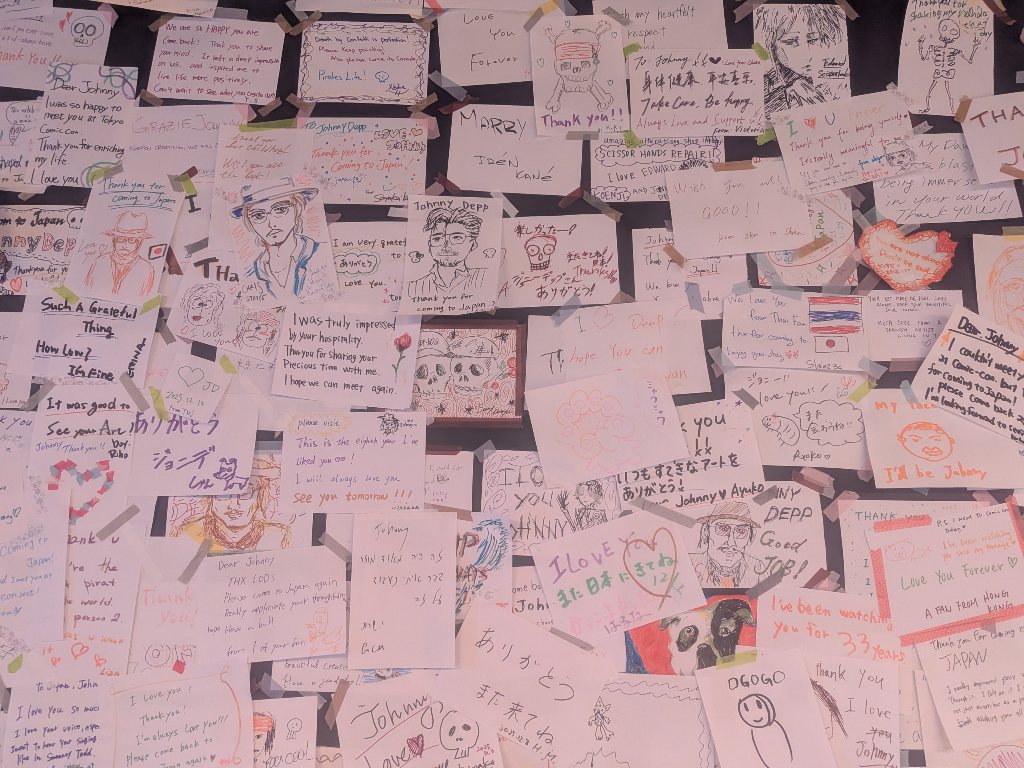 会場はニュウマン高輪のSouthの別棟のような場所で、この展覧会の特設カフェとグッズショップもありました。エントランスを入ってすぐのところには、来場者が書いたジョニー・デップへのメッセージカードが壁10数メートルくらいに渡って貼られていました。「Thnk you Johnny!」「I love Johnny」「I Love You!」と愛と感謝であふれたメッセージの数々が。やはり彼は存在しているだけでもありがたい方なのでしょう。