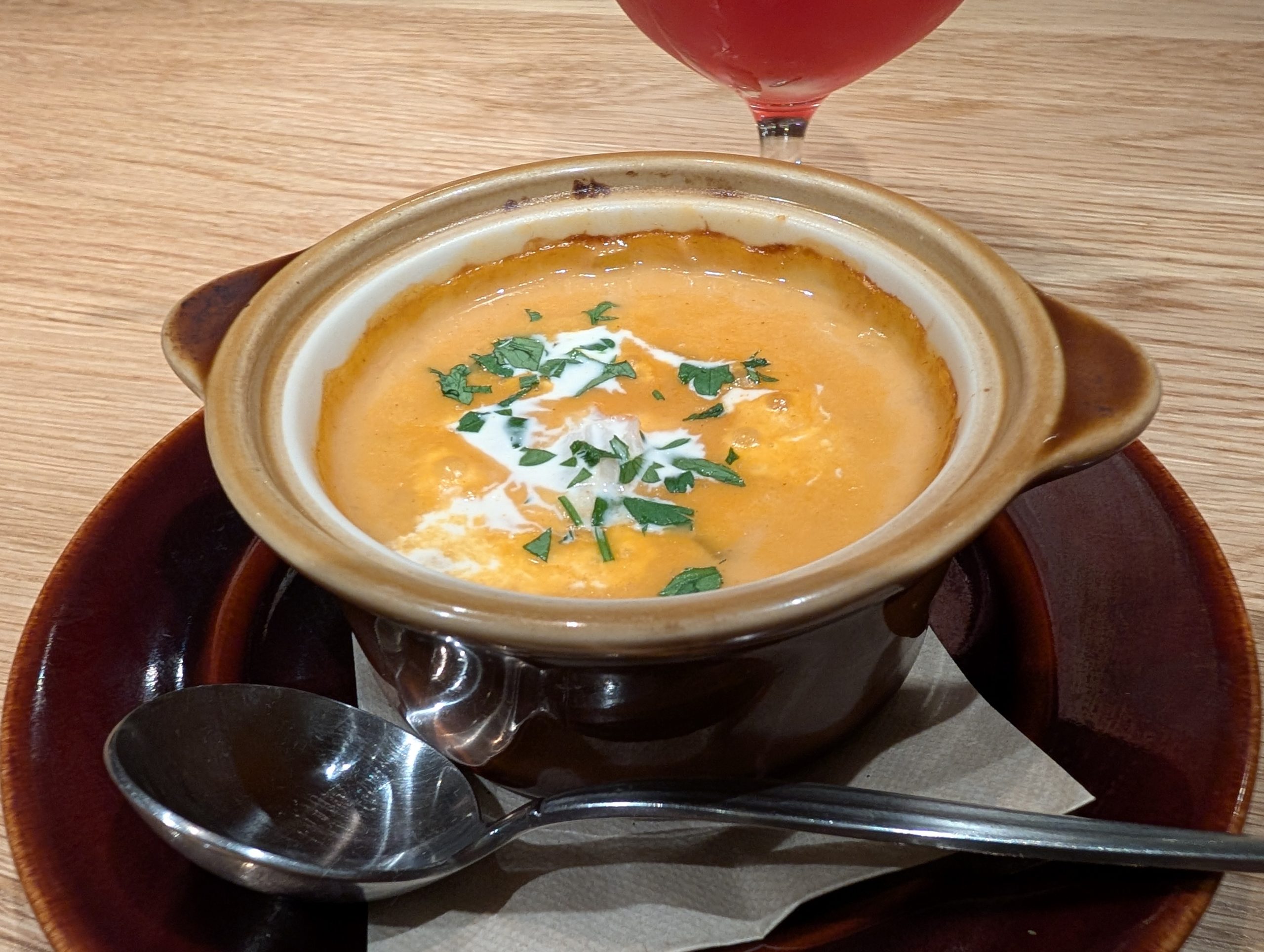 海老、蟹のなど甲殻類から出る旨みをベースに、フュメ・ド・ポワソン(魚介だし)や貝柱のだしに加え、牛乳、生クリームでクリーミーに仕上げたもの。オマール海老の切り身も添えた贅沢なスープとなっています。