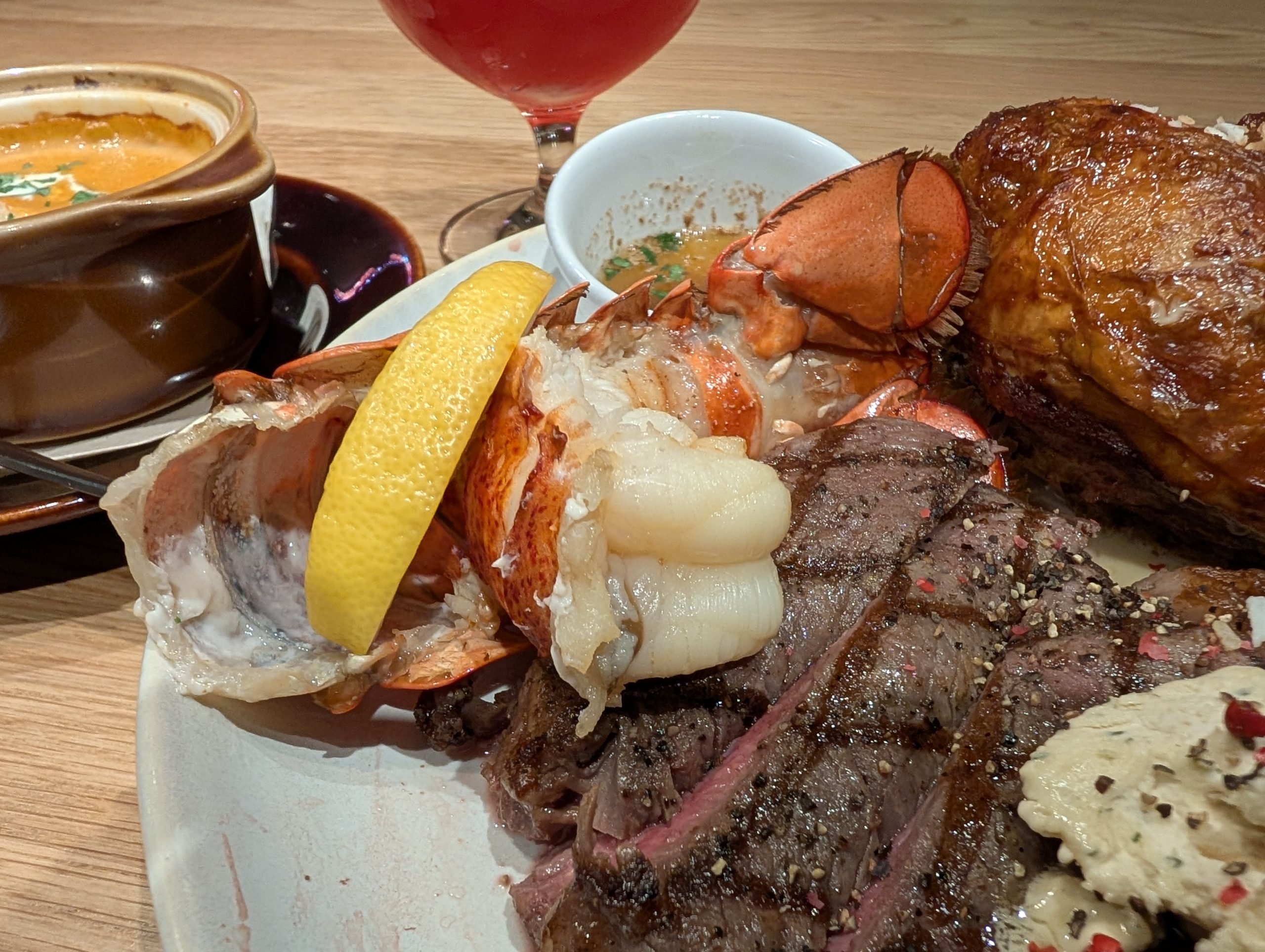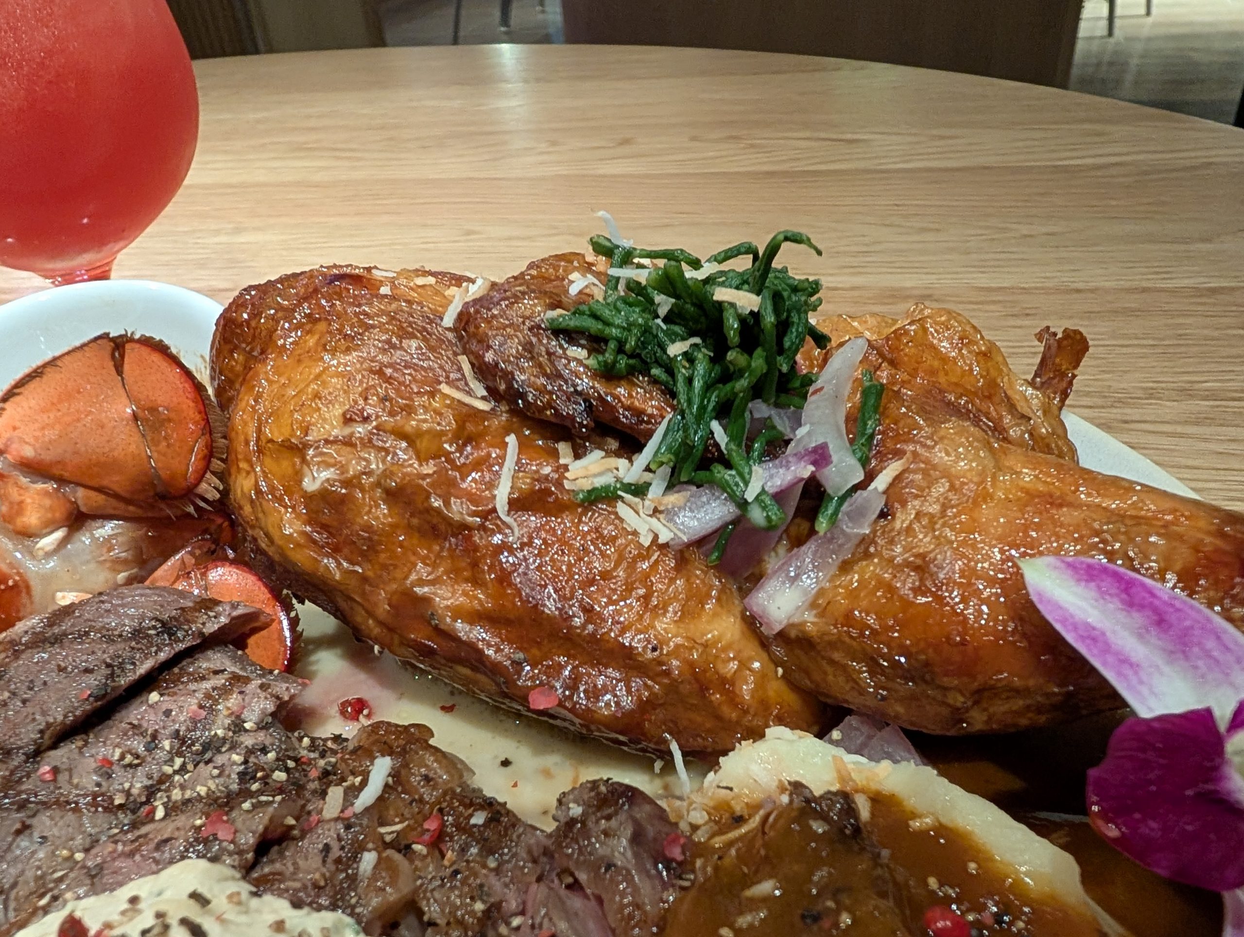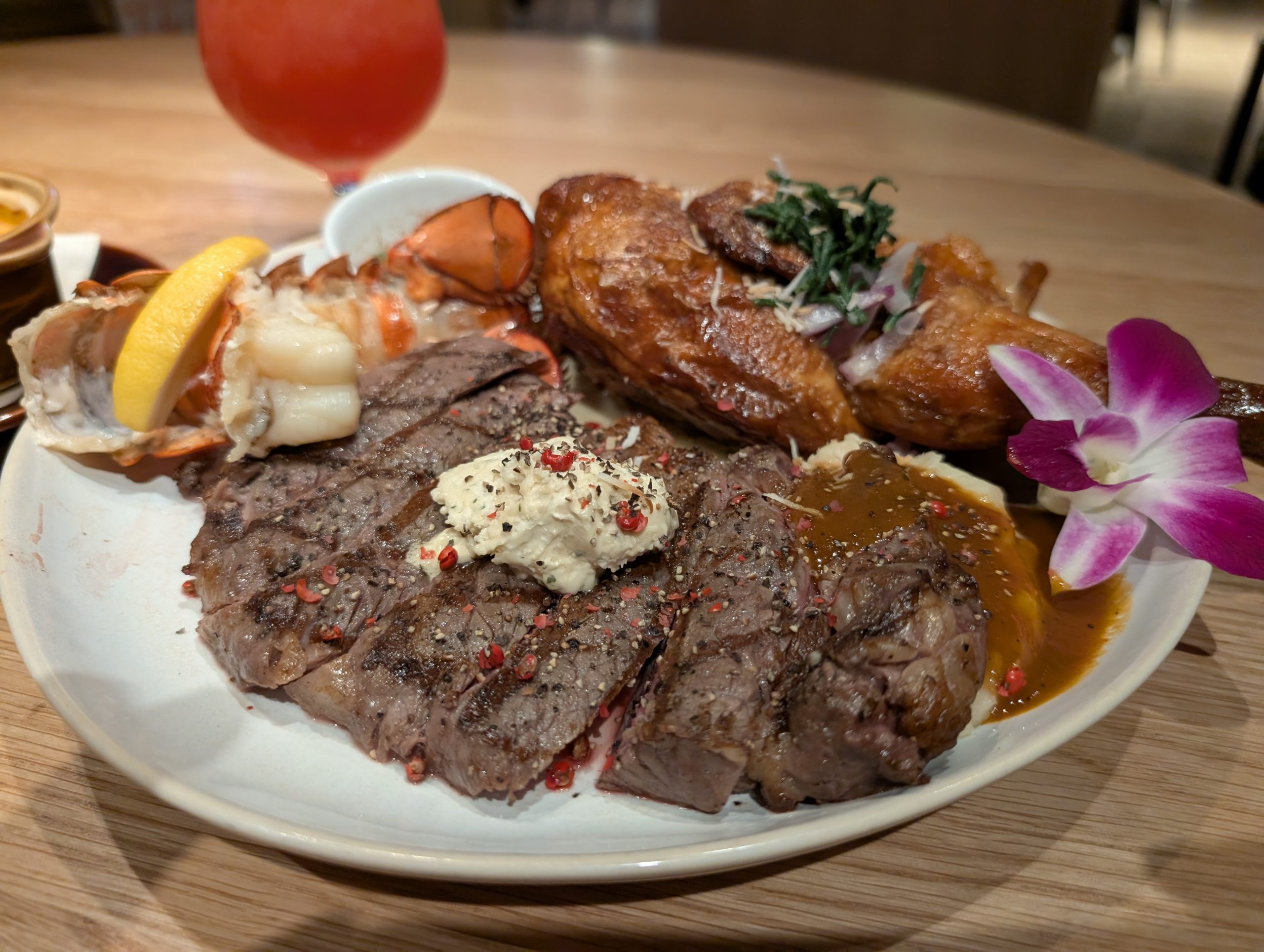 特別メニューは三種類。こちらは、ぷりっぷりのオマール海老、ダイヤモンドヘッドの岩肌に見立てたしっとり食感の国産雛鳥フリフリチキン、そしてTiki’sオリジナルソースで味わえる肉厚でジューシーなリブロースステーキをワンプレートに盛り込んだ豪華な一品。サーフ(海)とターフ(大地)の競演を集まったみんなで楽しめる冬のごちそうです。