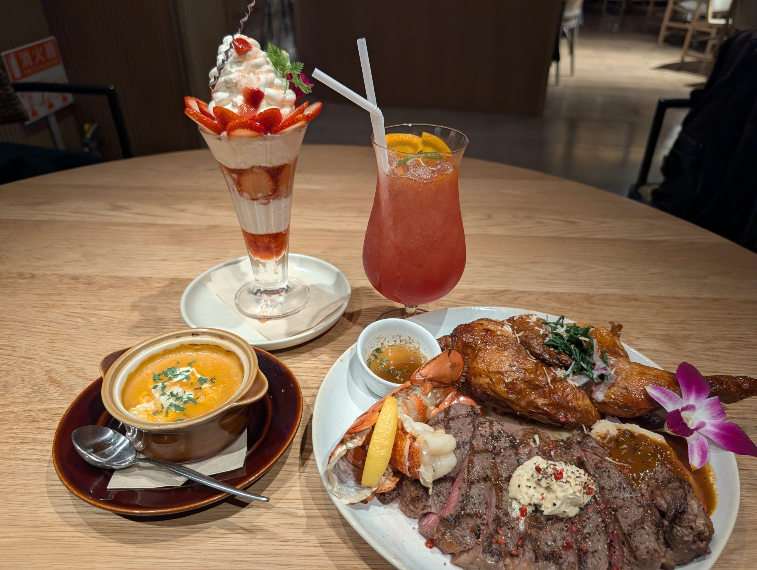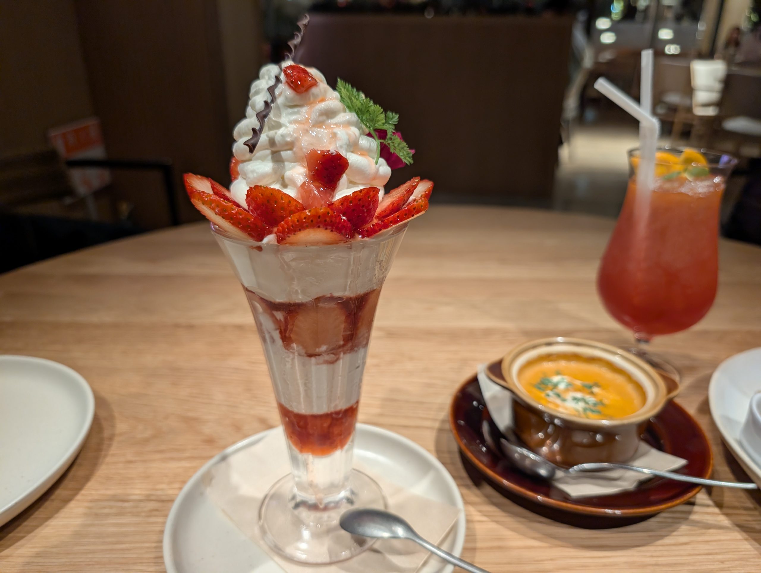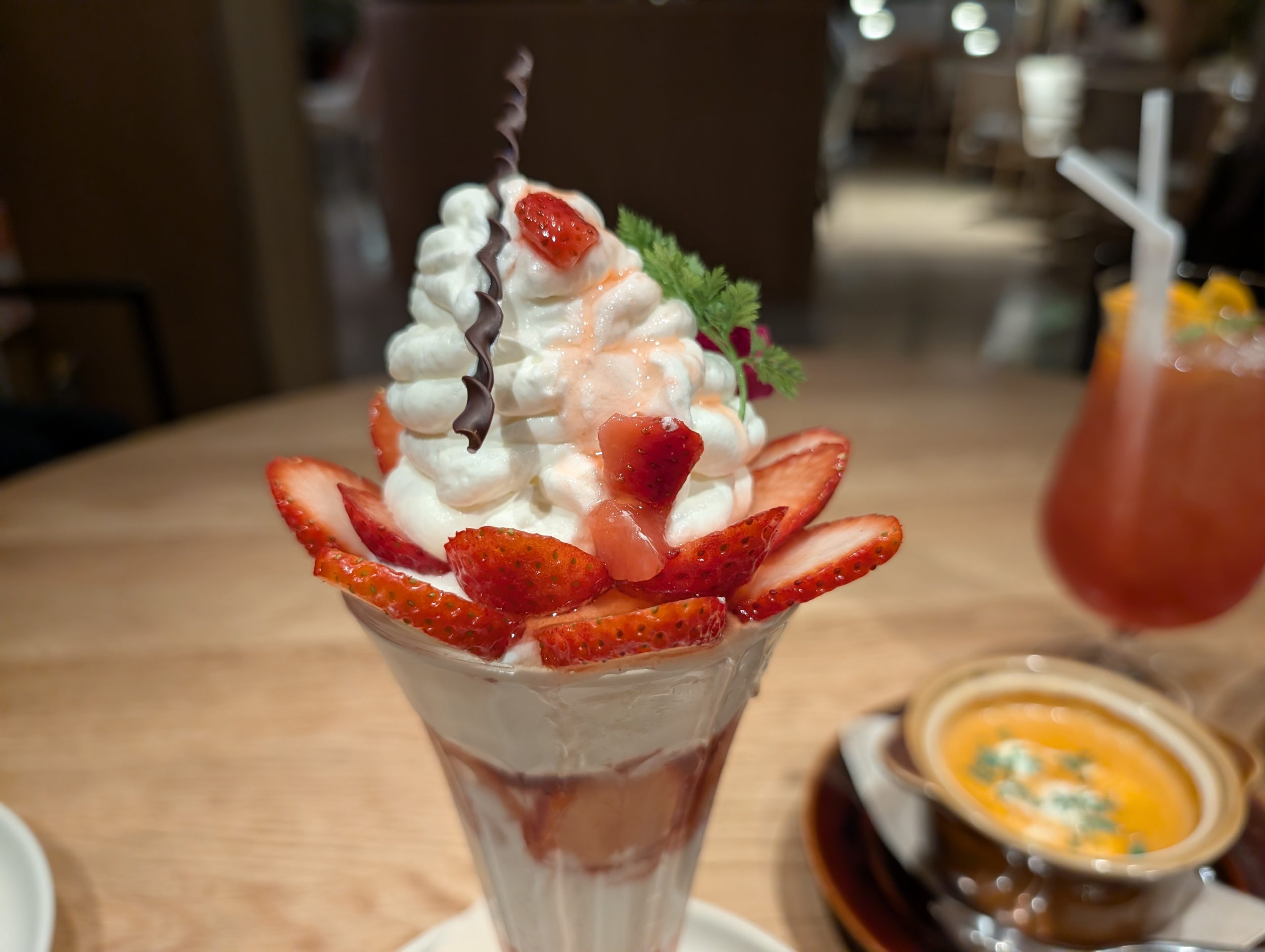 こちらは、フレッシュなイチゴにストロベリーアイス、食べやすいクレームシャンティを使用した、南国のお花をイメージしたパフェ。クレームシャンティが優しく濃厚な味わいで、満足度の高いパフェでした。楽しかった食事の最後をしめる、贅沢なデザートです。