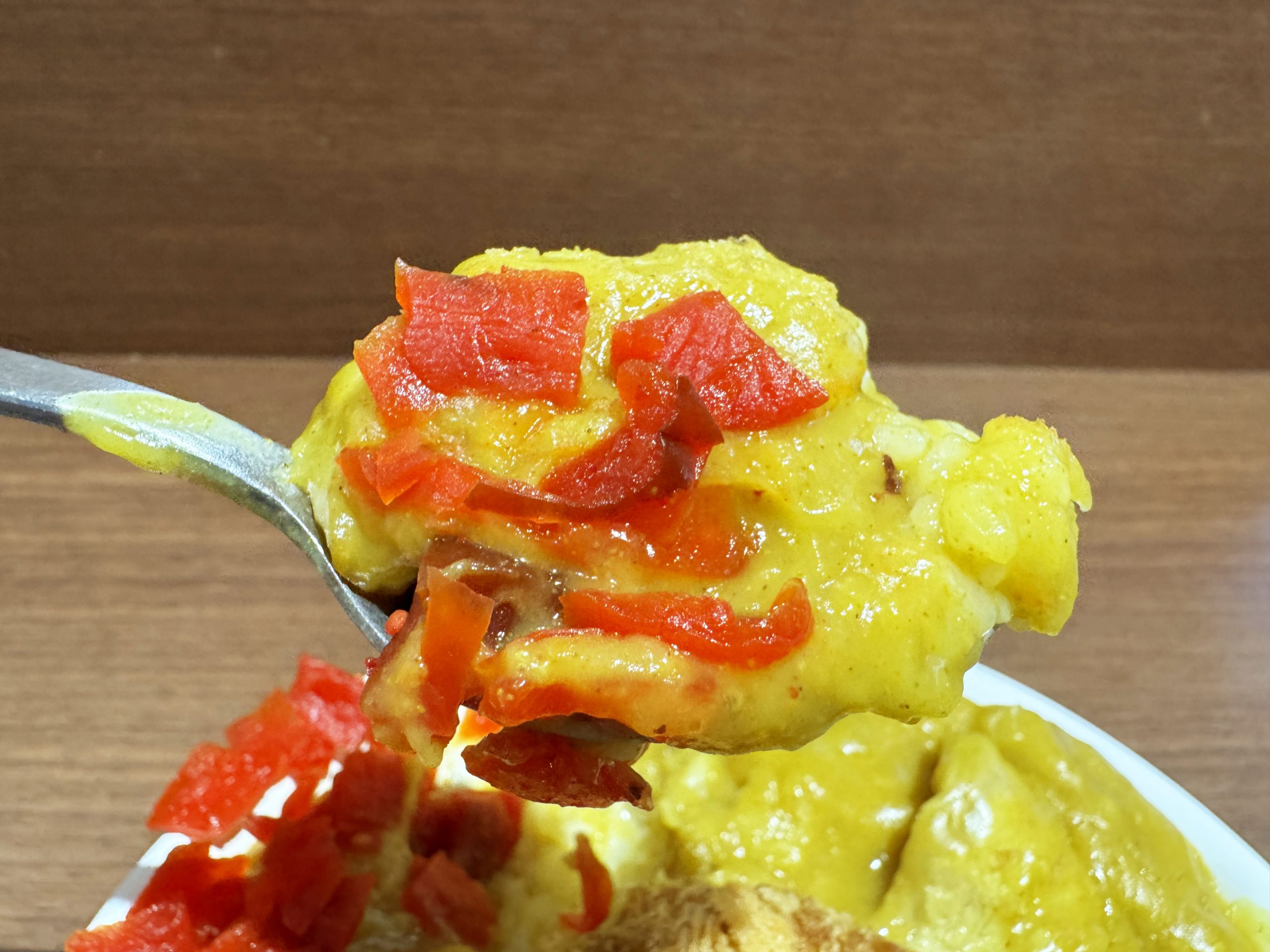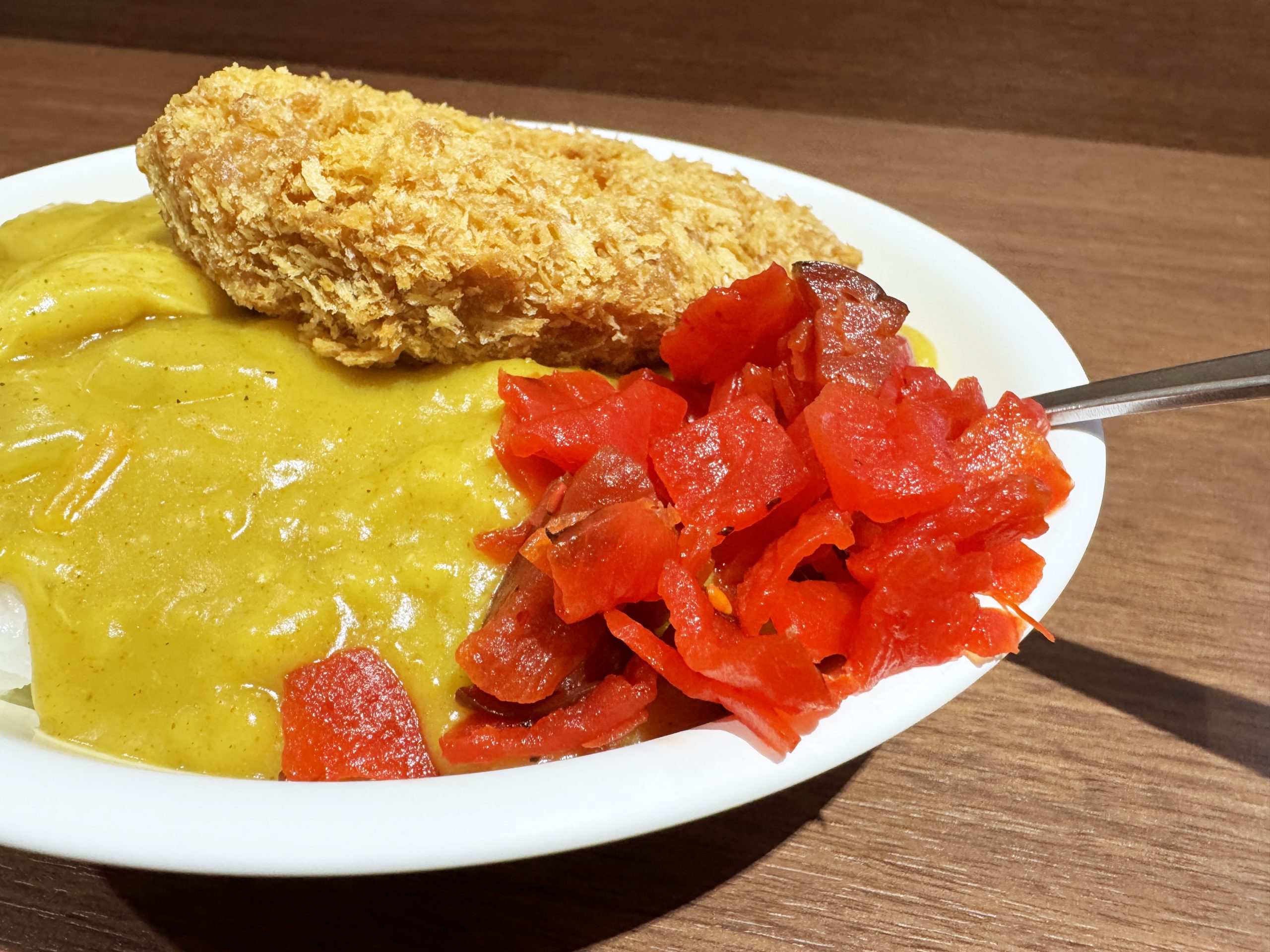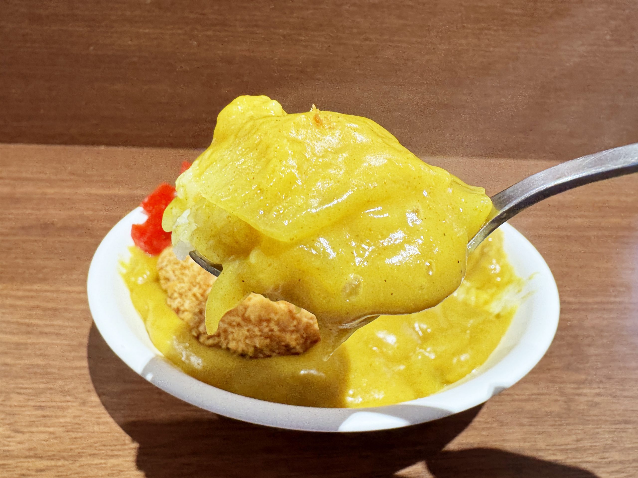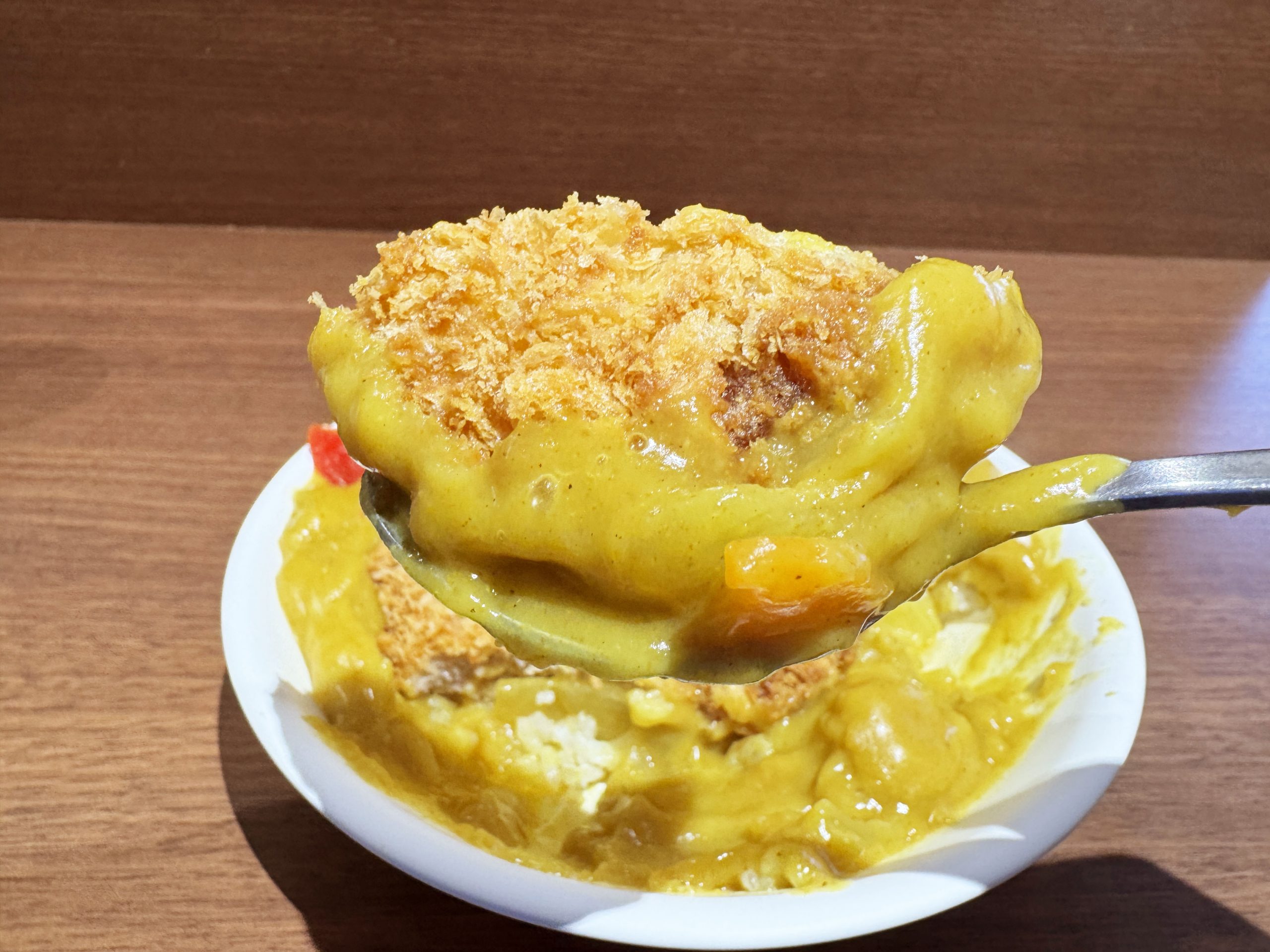 皆さんご存じとおり、万代バスセンターのカレーは粘度が高めで超ねっとりタイプ。その粘性あるカレーとメンチカツの衣が一体化。