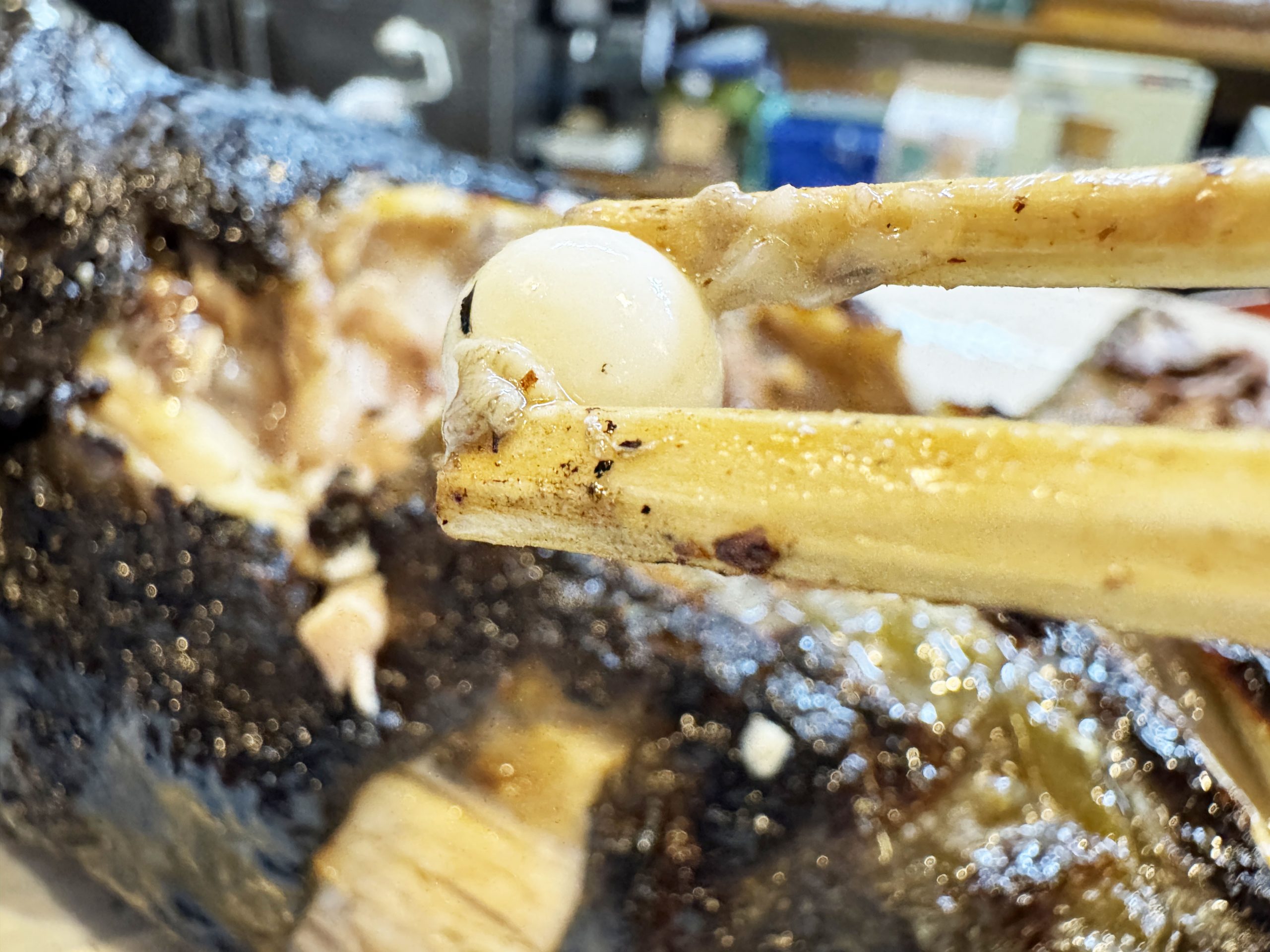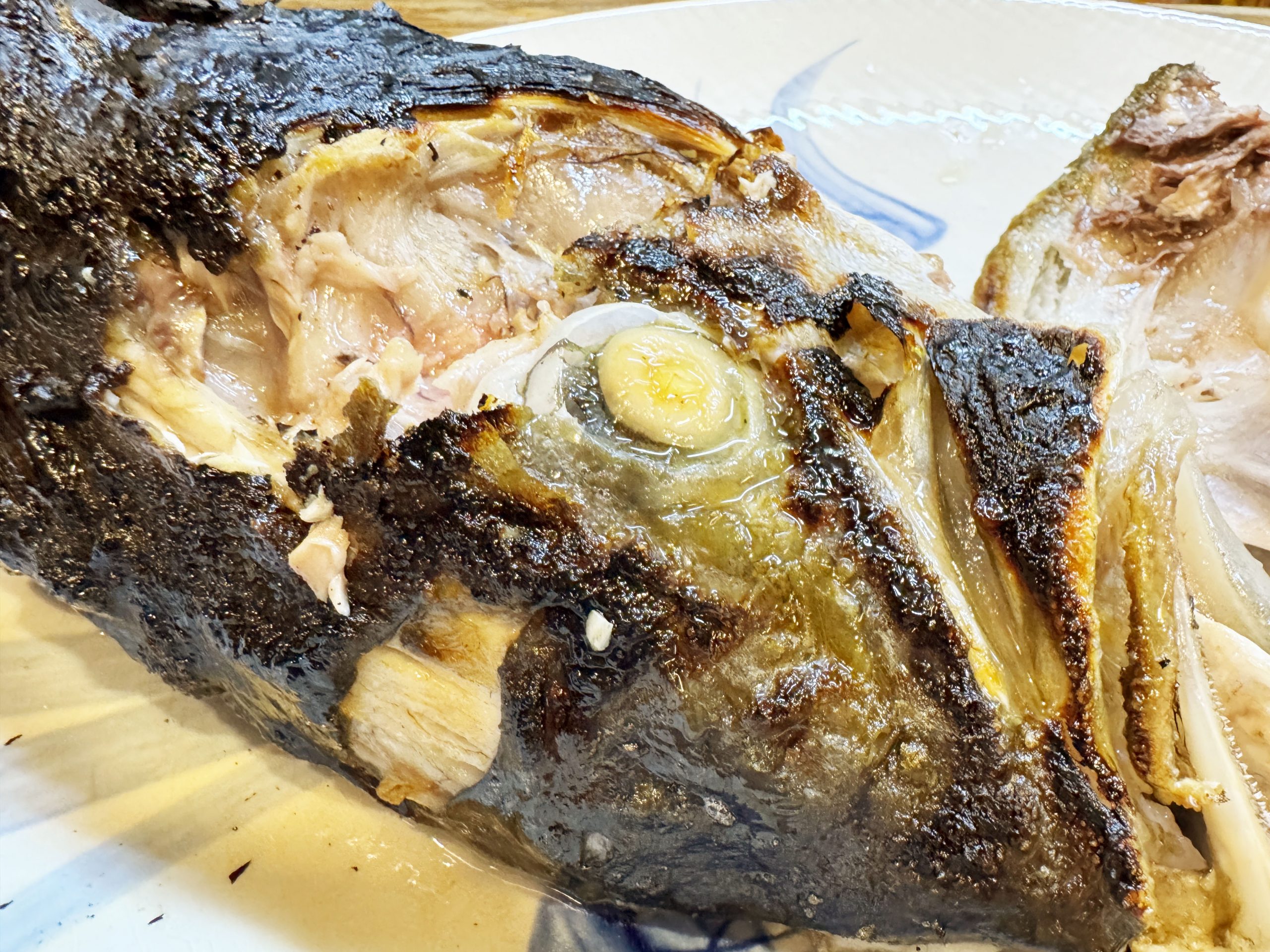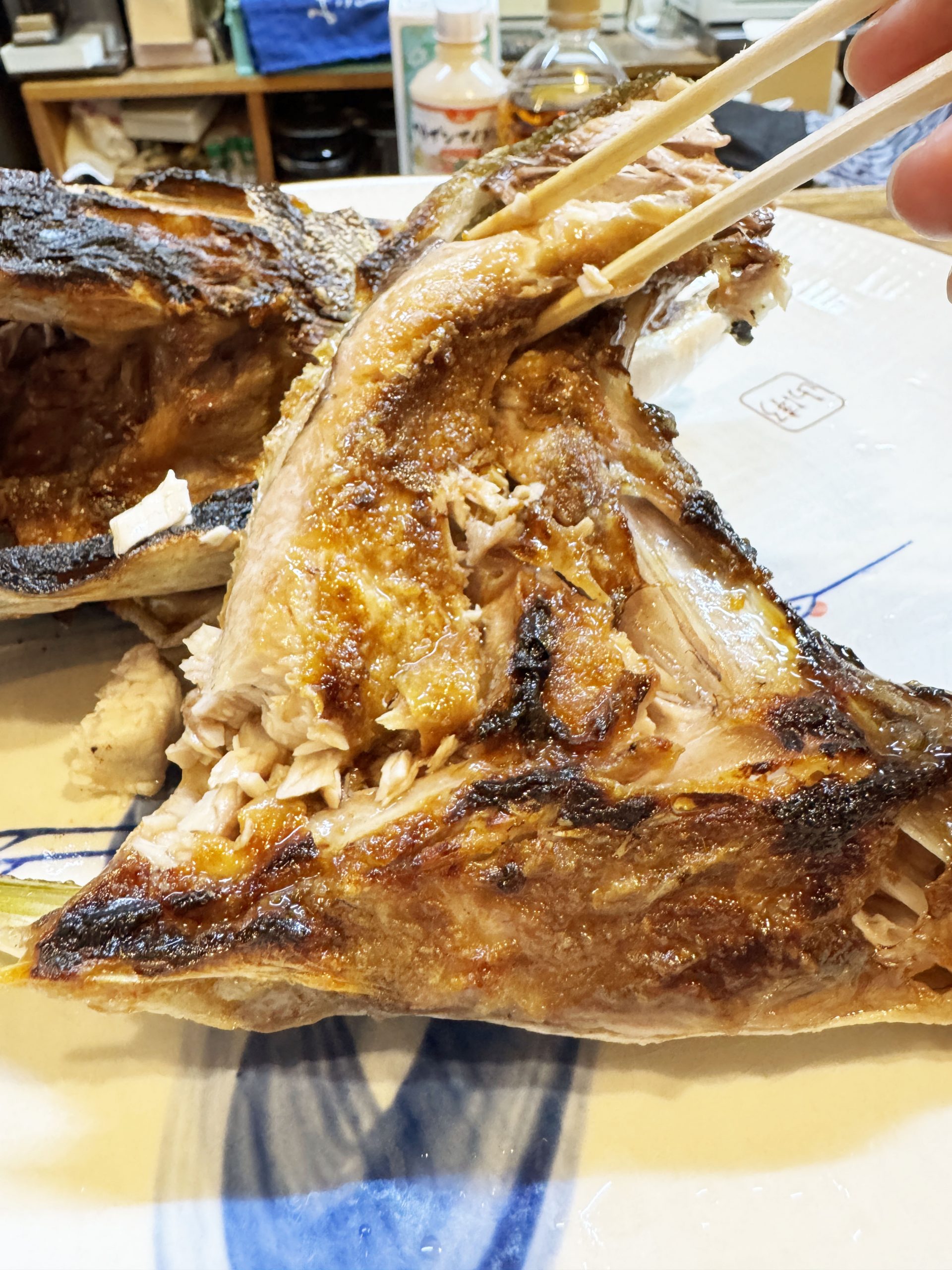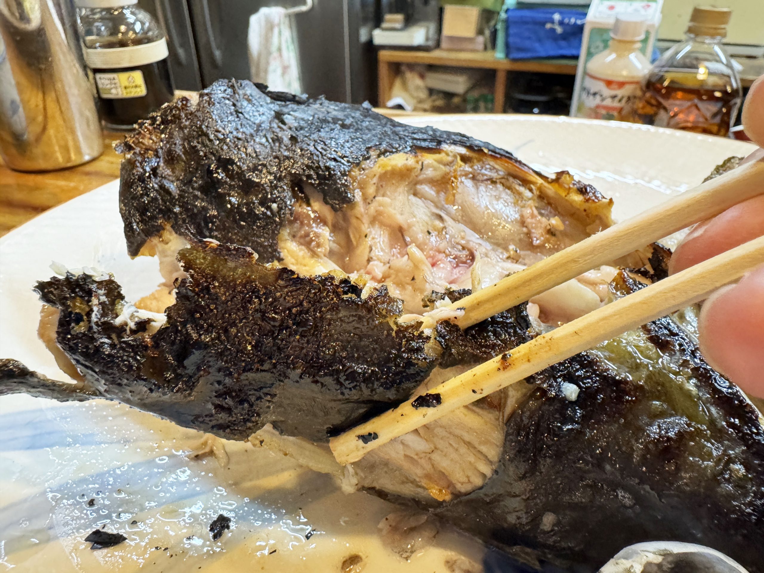 ブリカマ、どこから食べればよいか迷うが、「ここが崩れそうかな?」「ここが身かな?」と思いつつ箸を入れてみると、スゥーッと箸が沈む。箸を入れた部位は大正解。ゴロッと巨大なブリカマの身を取ることができた。これはデカい。いままで食べてきたブリカマとスケールが違う。