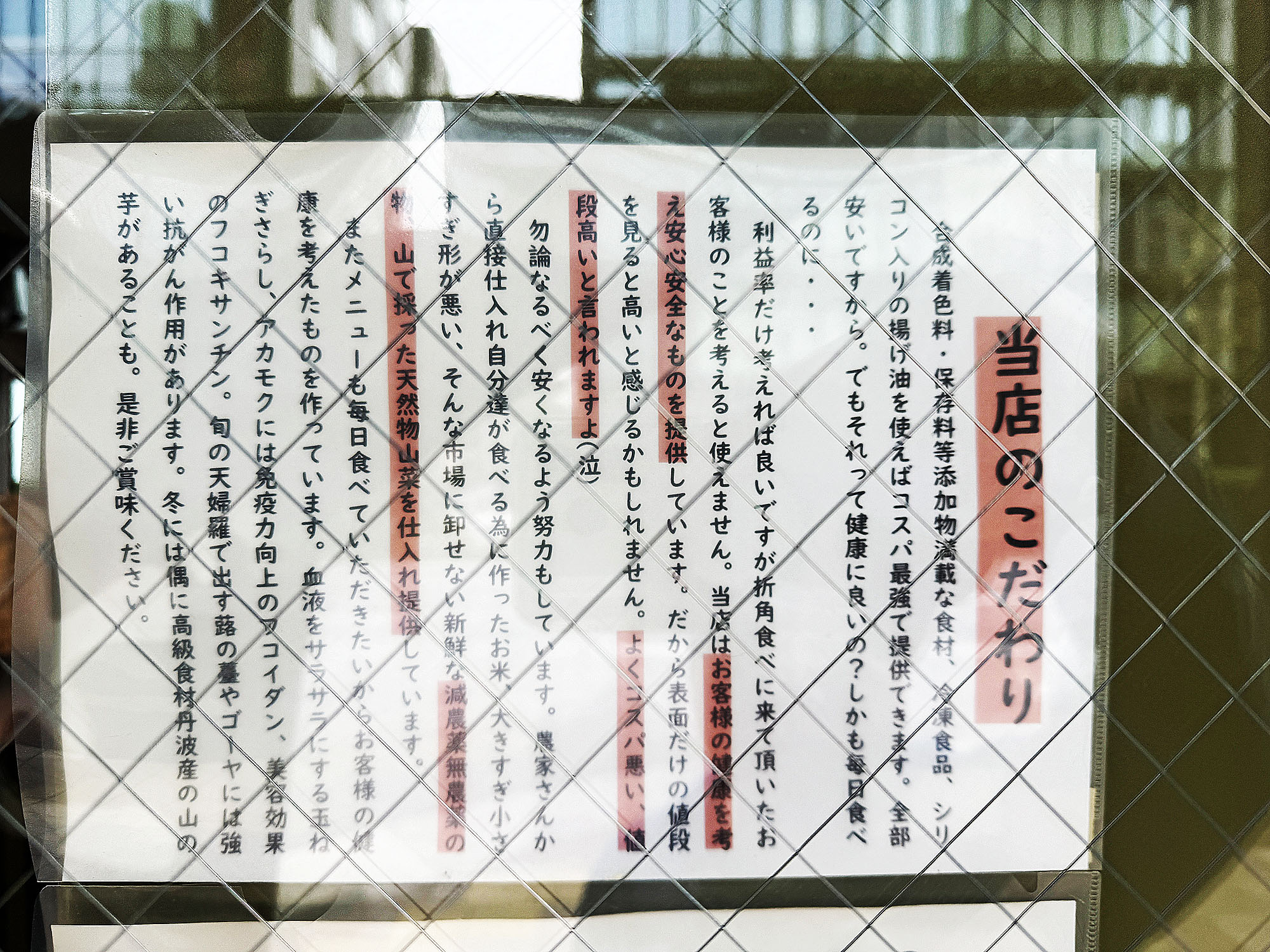 なるべく価格が安くなるよう努力しているが、それでも他店と比較して高いと思われてしまうのは、客の健康を大切に思っているから。そのこだわりについては、お店に掲示されている「当店のこだわり」を読んでほしい。