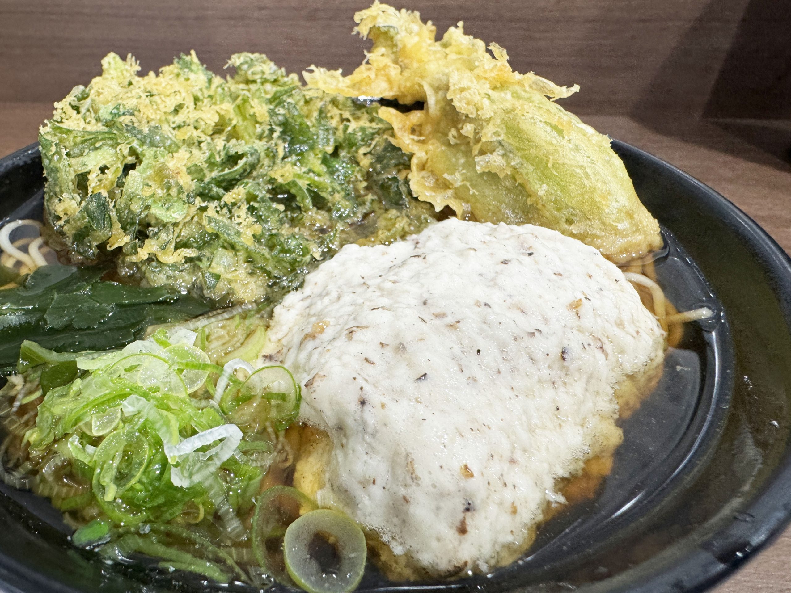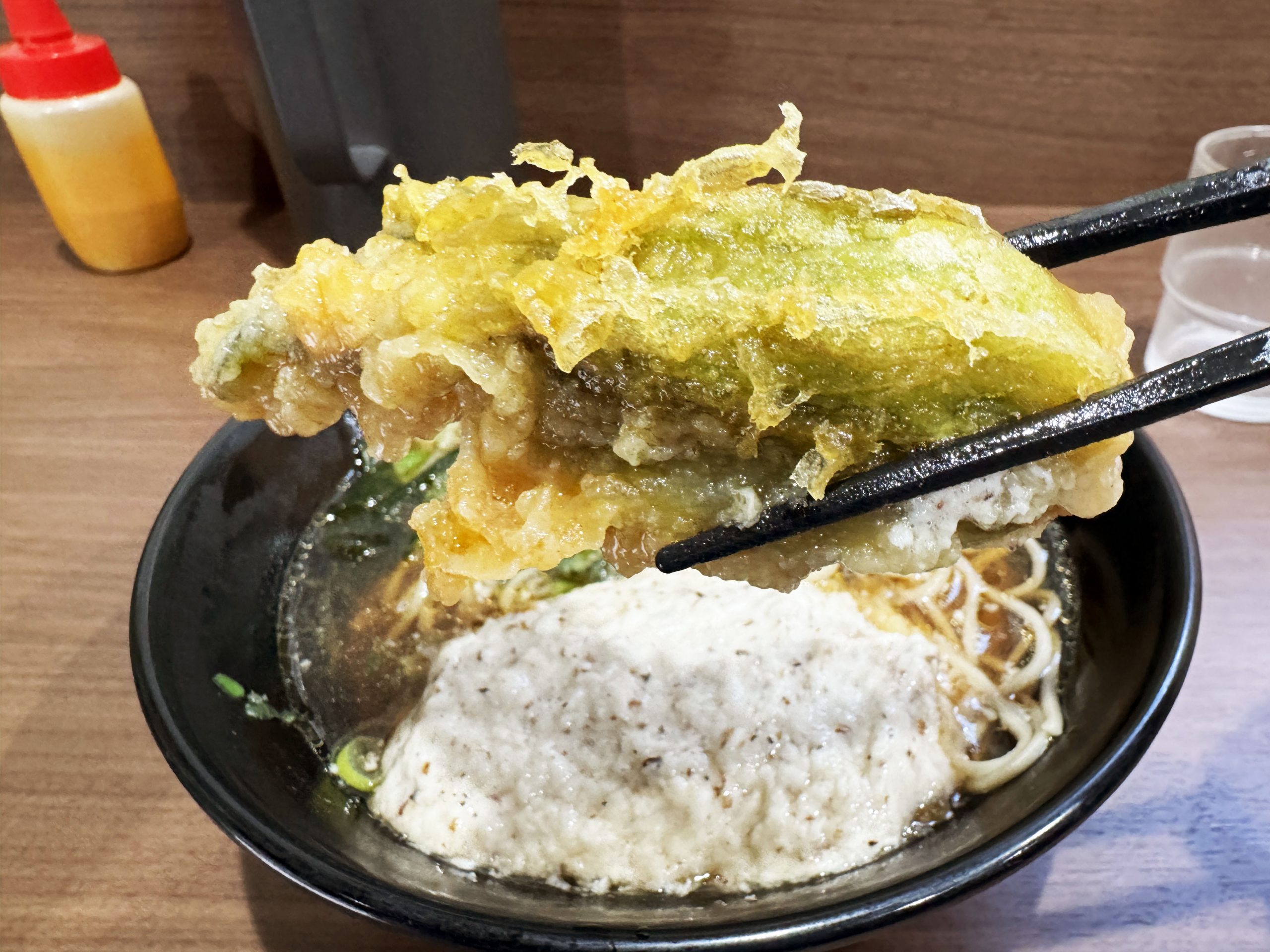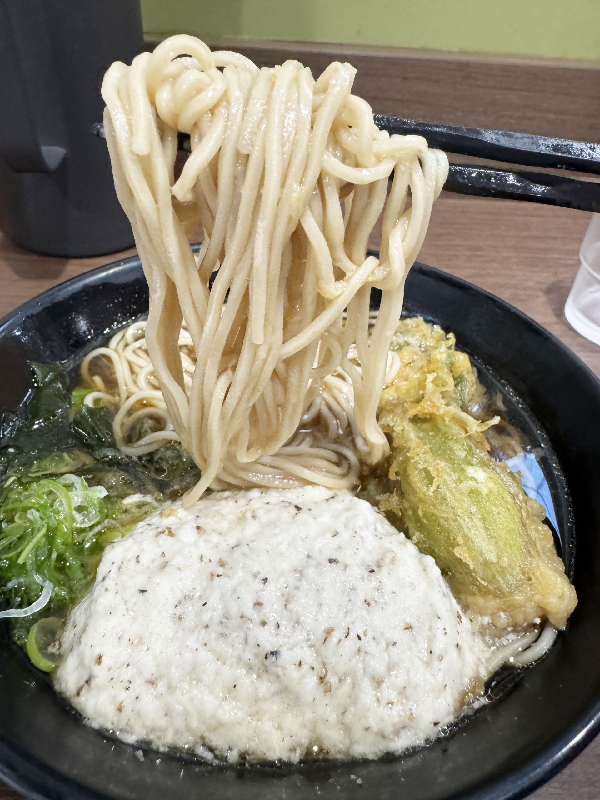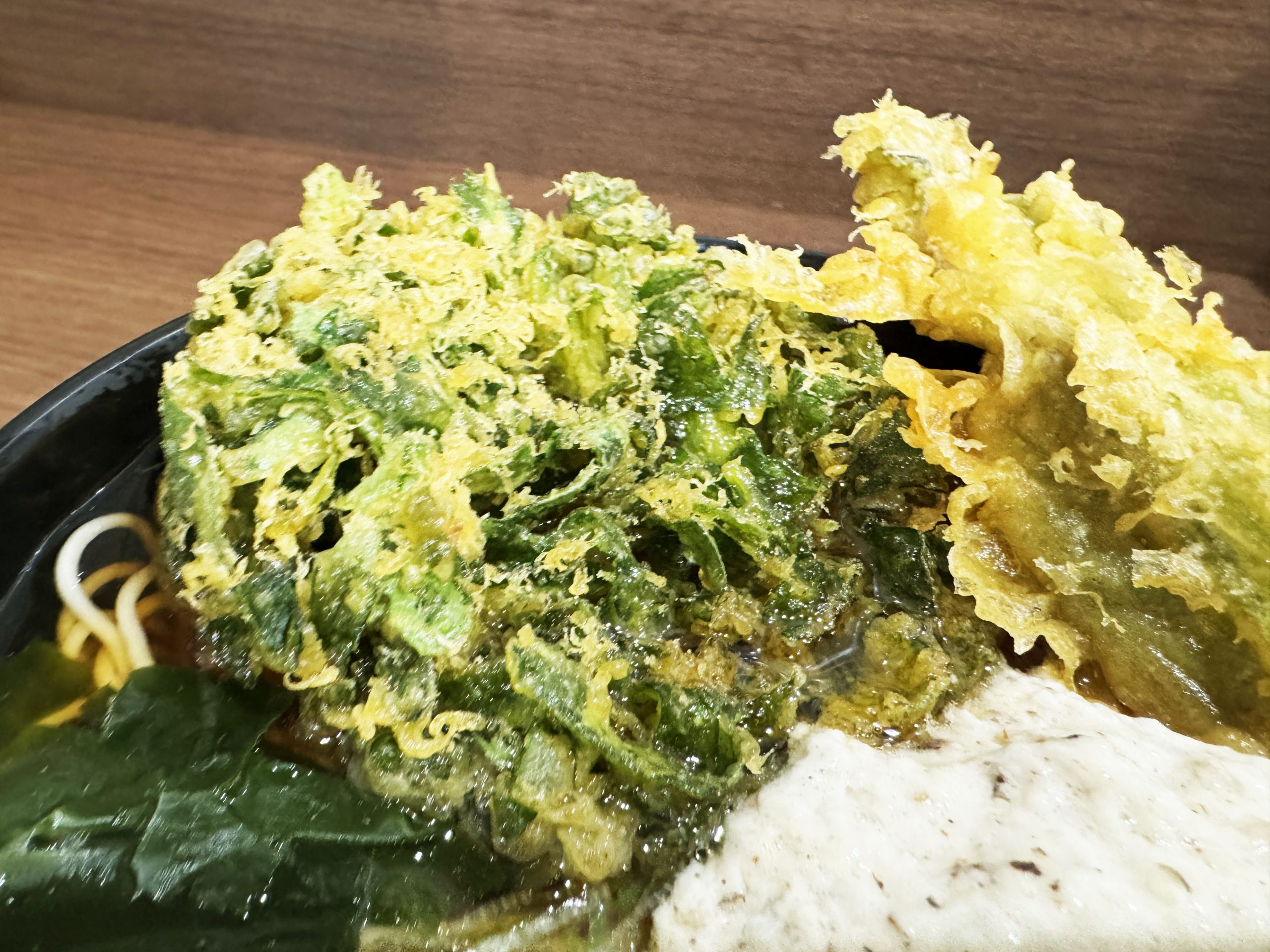ということで、今回はかけそばに春菊天、フキノトウ天、山の芋をトッピングとして注文。これがもう感動の嵐。ビジュの時点で極まった美しい盛り。適当に天ぷらを投入した立ち食いソバも、それはそれで味があって良きものだが、峠そばの盛りつけは極めてセンスを感じる美しいもの。