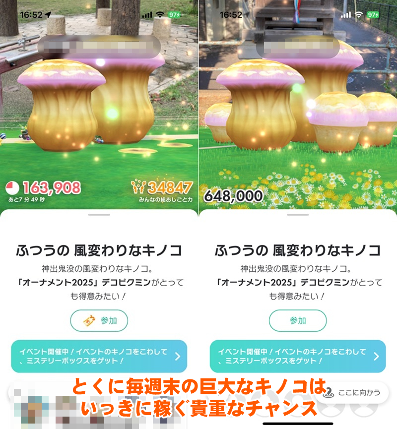 オーナメントを身に付けたデコピクミン集めはもちろん、巨大なキノコを狙える最後の週末ということで、たくさんの人がピクミンにエキスを与えて周囲のキノコ事情とにらめっこをしていることだろう。