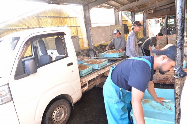 ▲訪れたのは12月。同町のカリスマ、楠田養鰻(写真は飼料を整えて積み込むシーン)ではTシャツで働く方も。コートは不要で、筆者もロンTで取材しました