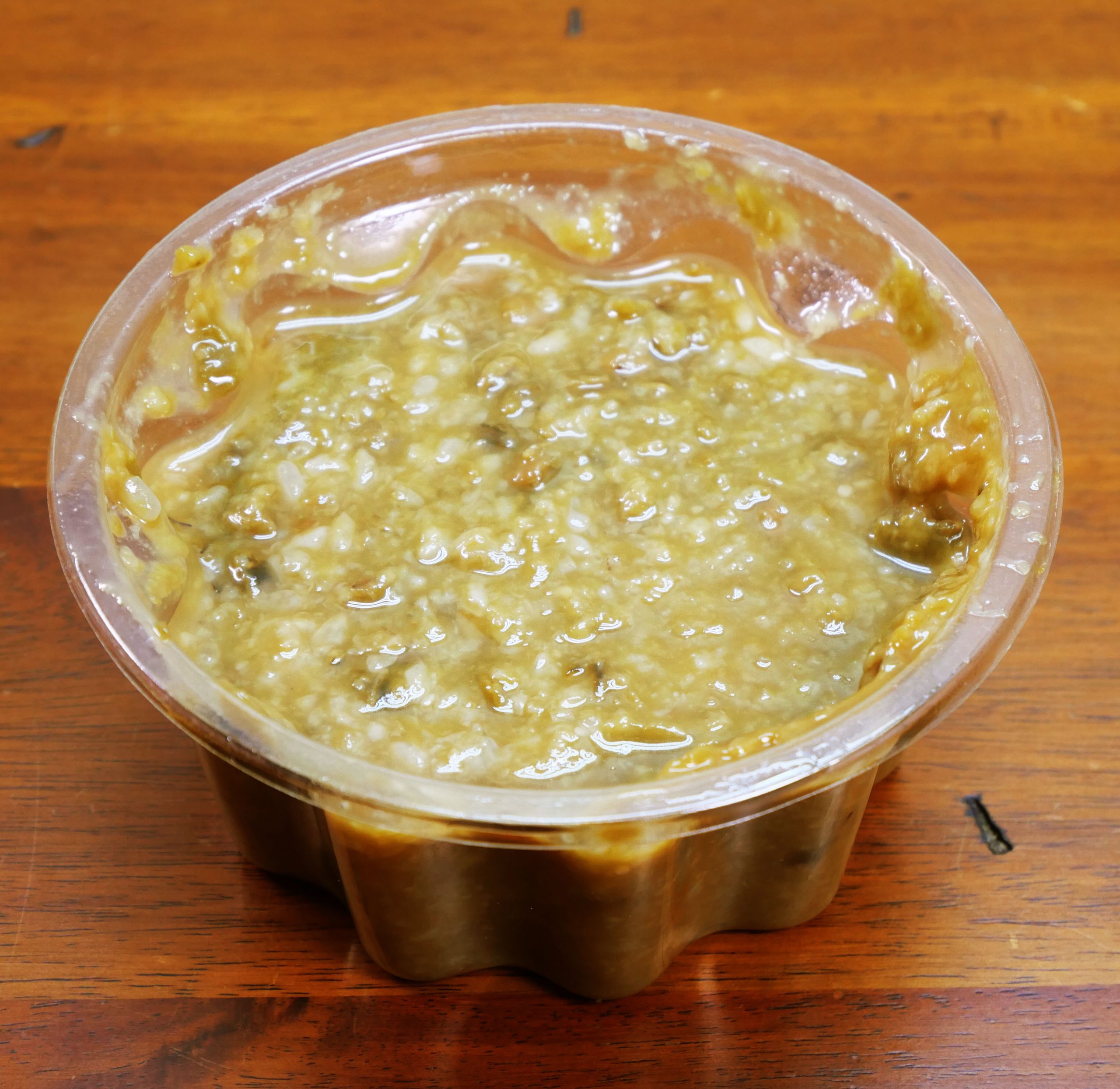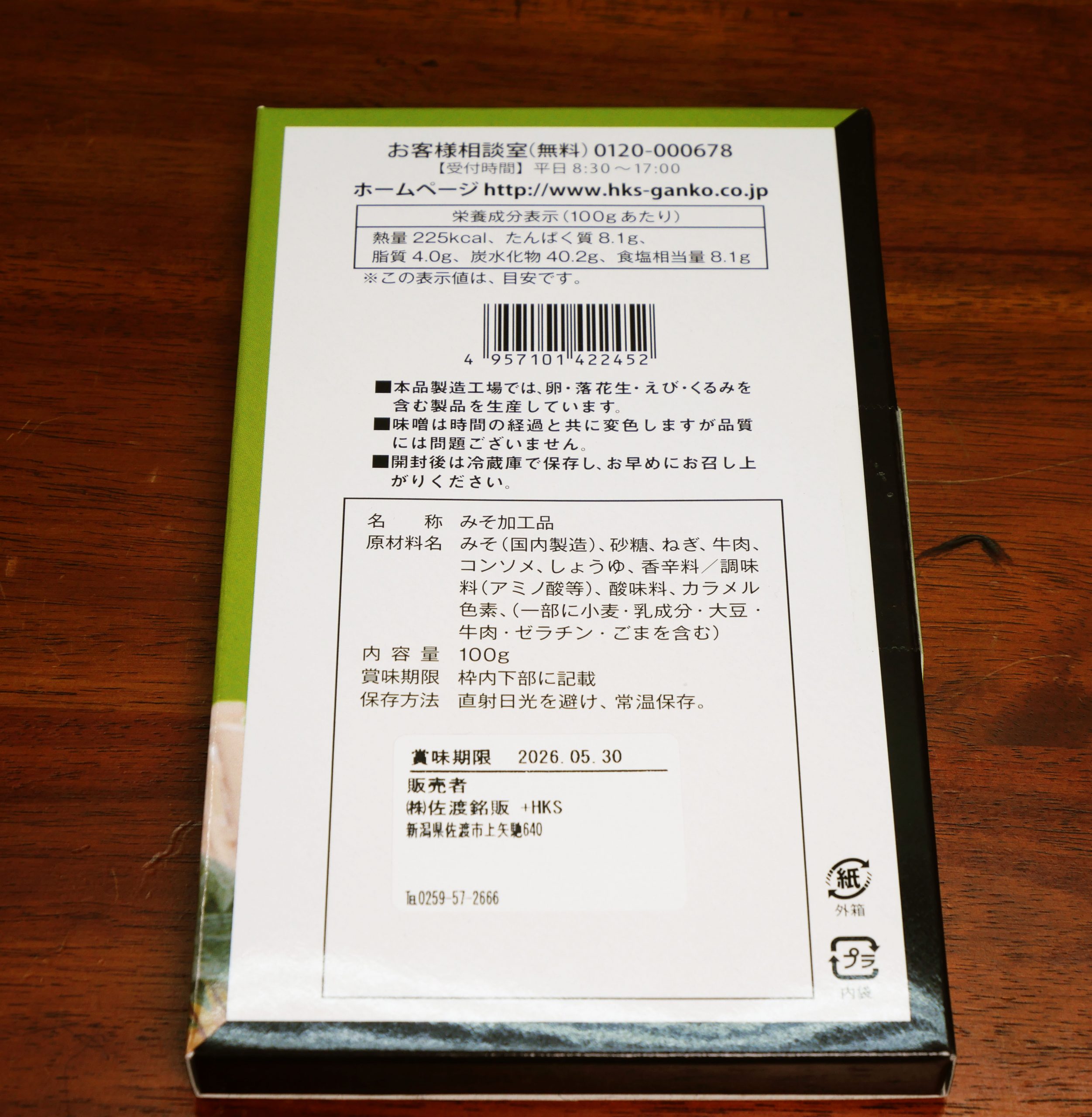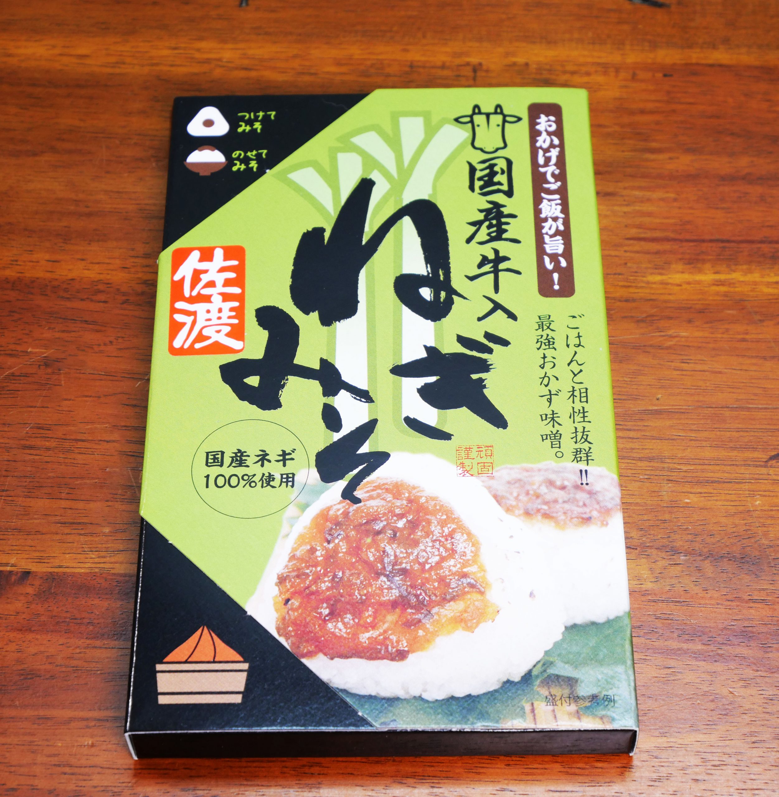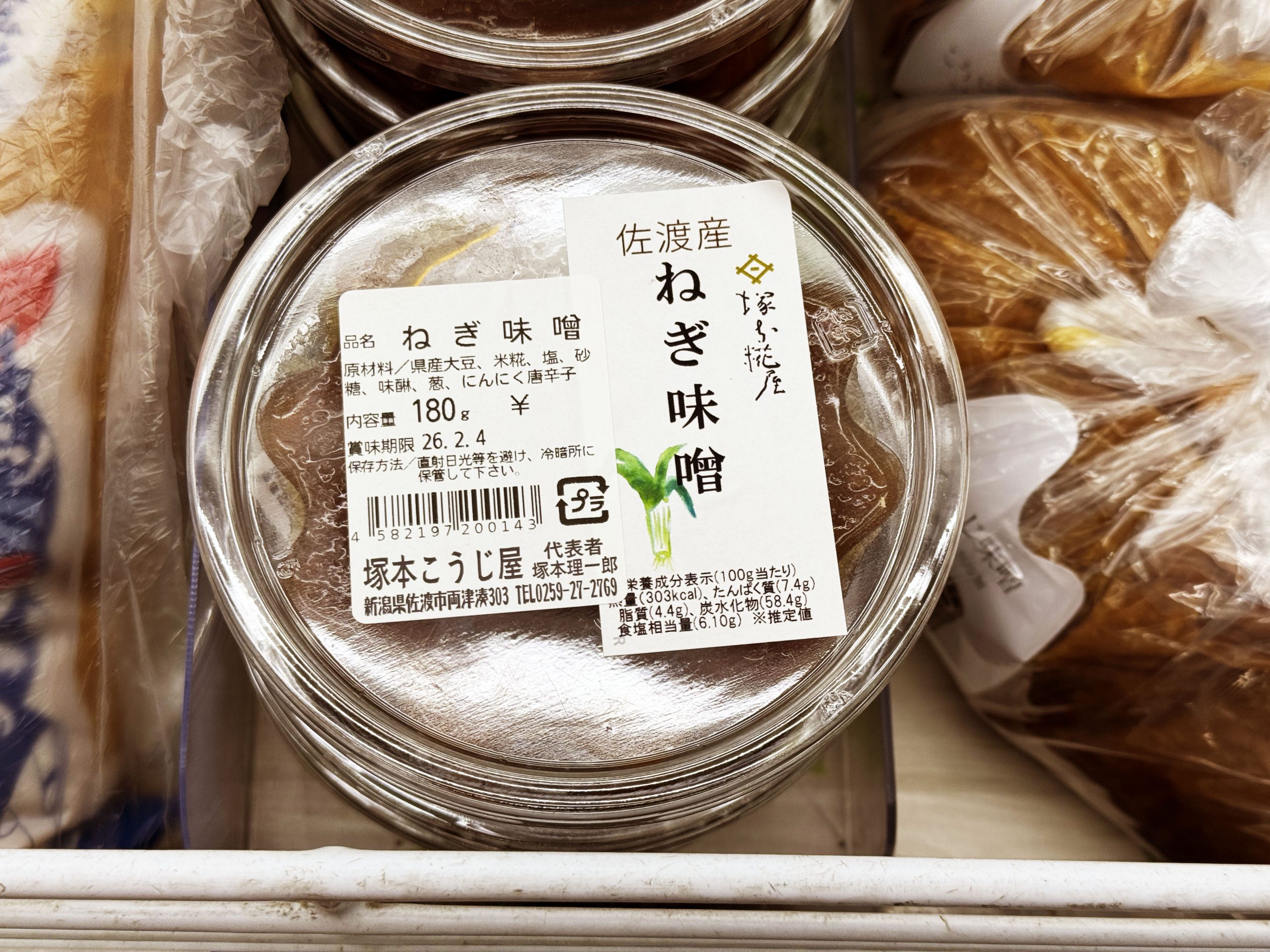 今回入手した「ねぎ味噌」の原材料は、国内製造みそ、砂糖、ねぎ、牛肉、コンソメ、しょうゆ、香辛料など。正式名称は「佐渡 国産牛入りねぎみそ」。さきほどの「ゆず味噌」と同様に塚本こうじ屋でも販売しているが、さまざまな製造元の味噌を確かめるため、今回は株式会社佐渡銘販のものにした。