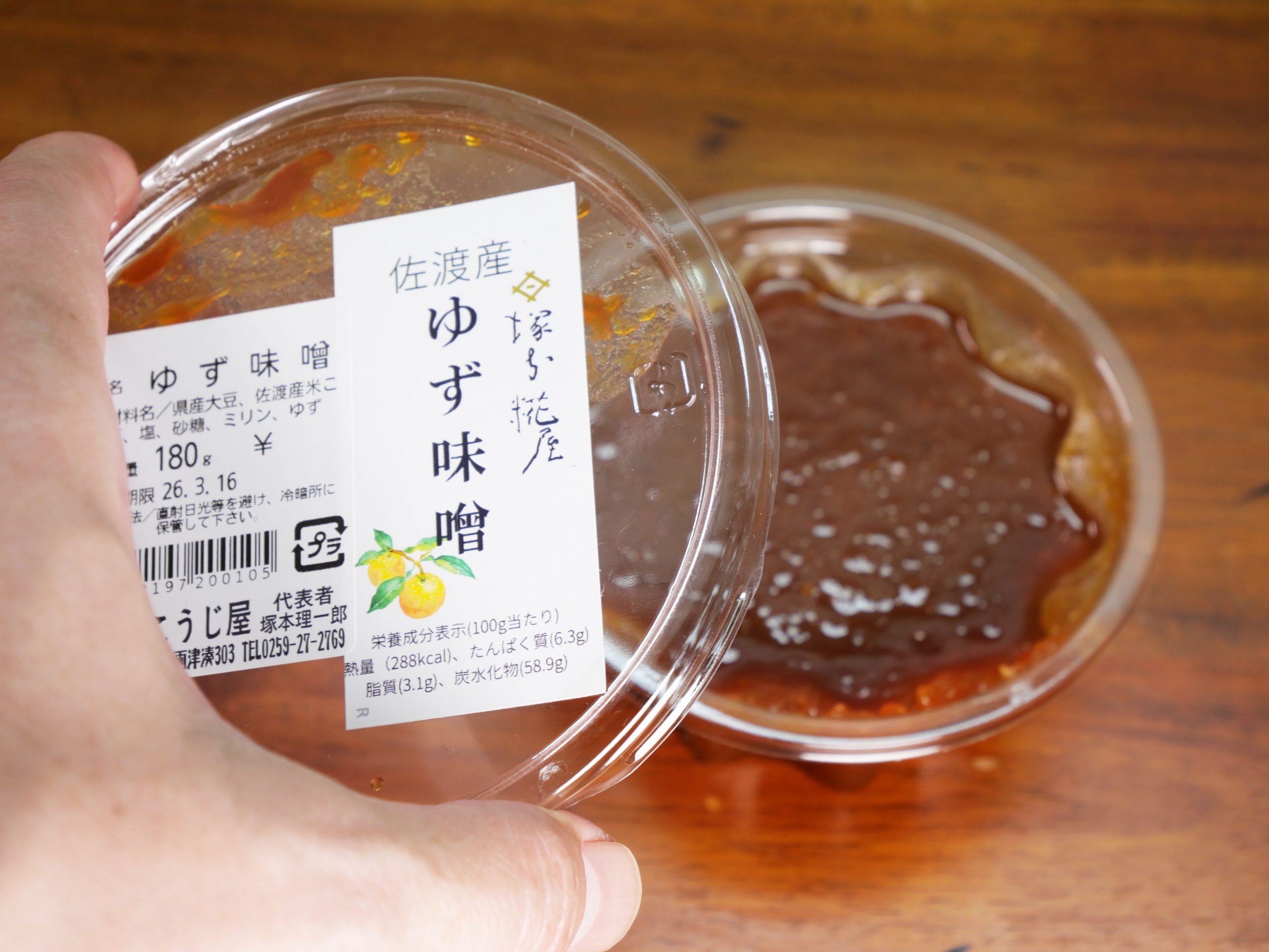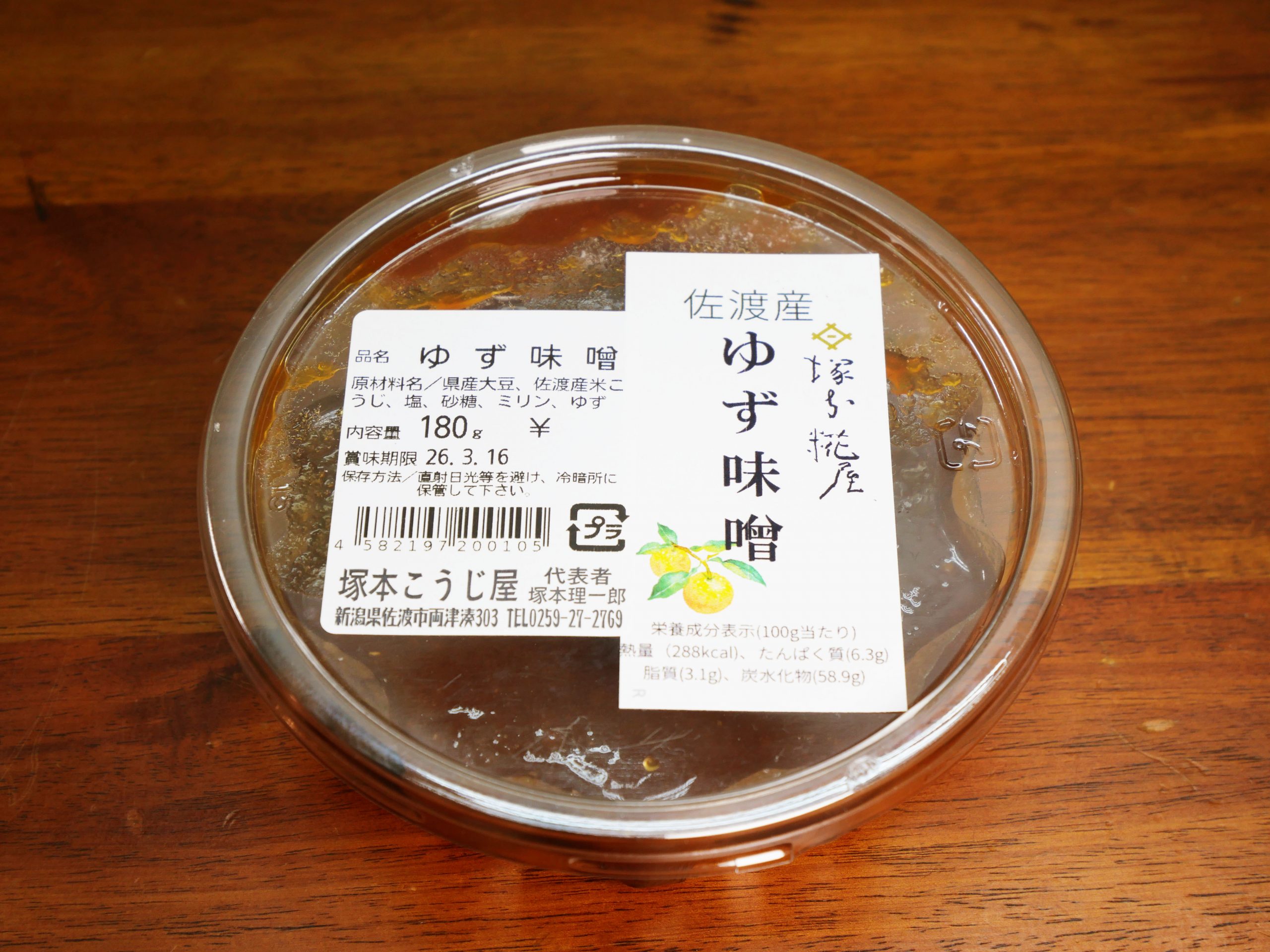 今回入手した「ゆず味噌」の原材料は、新潟県産大豆、佐渡産米こうじ、塩、砂糖、みりん、ゆず。正式名称は「塚本糀屋 佐渡産ゆず味噌」。製造元の塚本こうじ屋で話を聞いた。