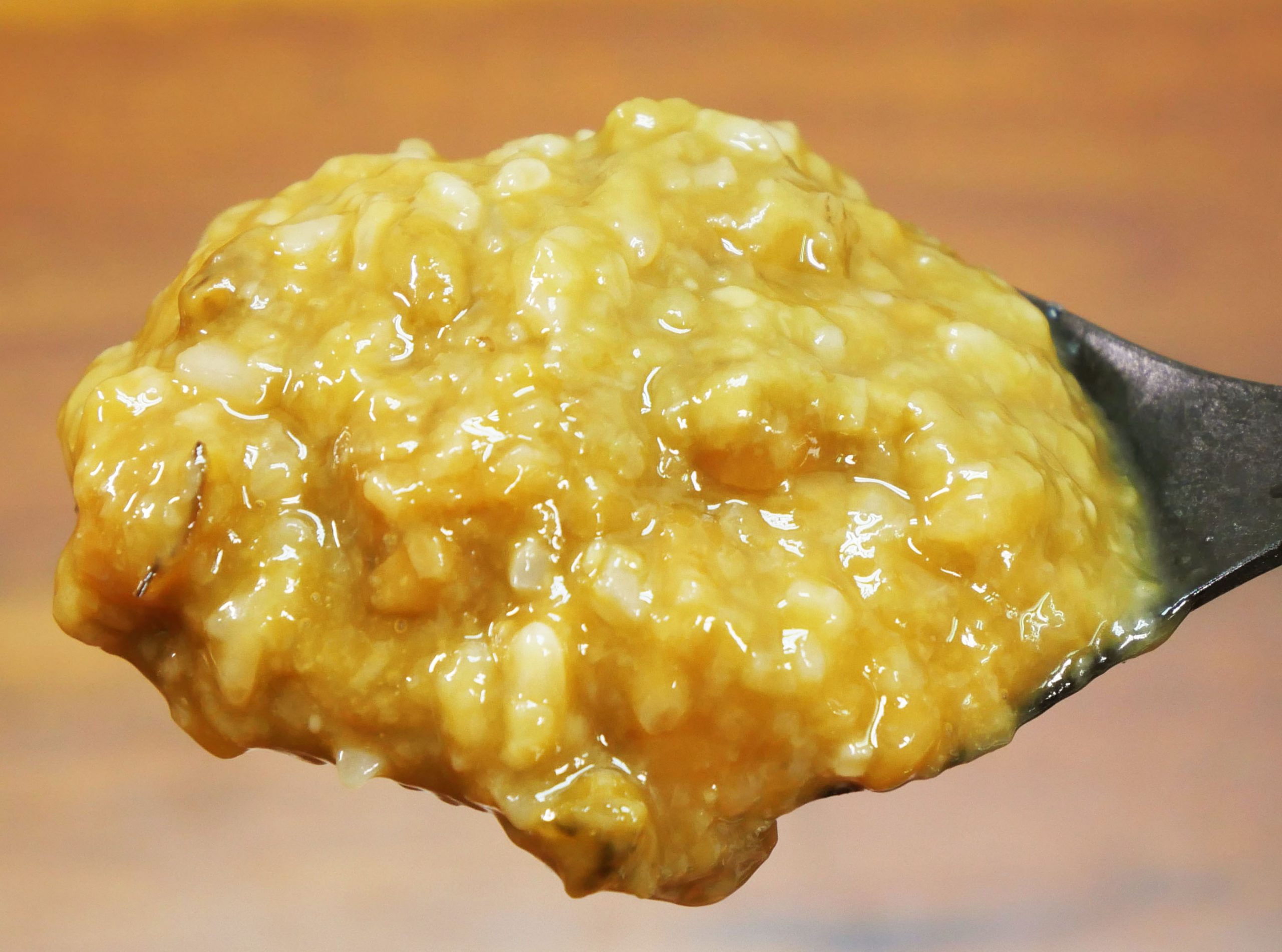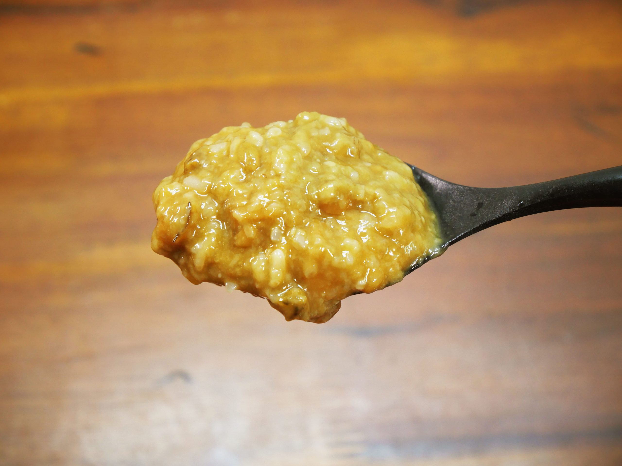 さっそく開封し、スプーンでおにぎりに詰めて食べてみる。