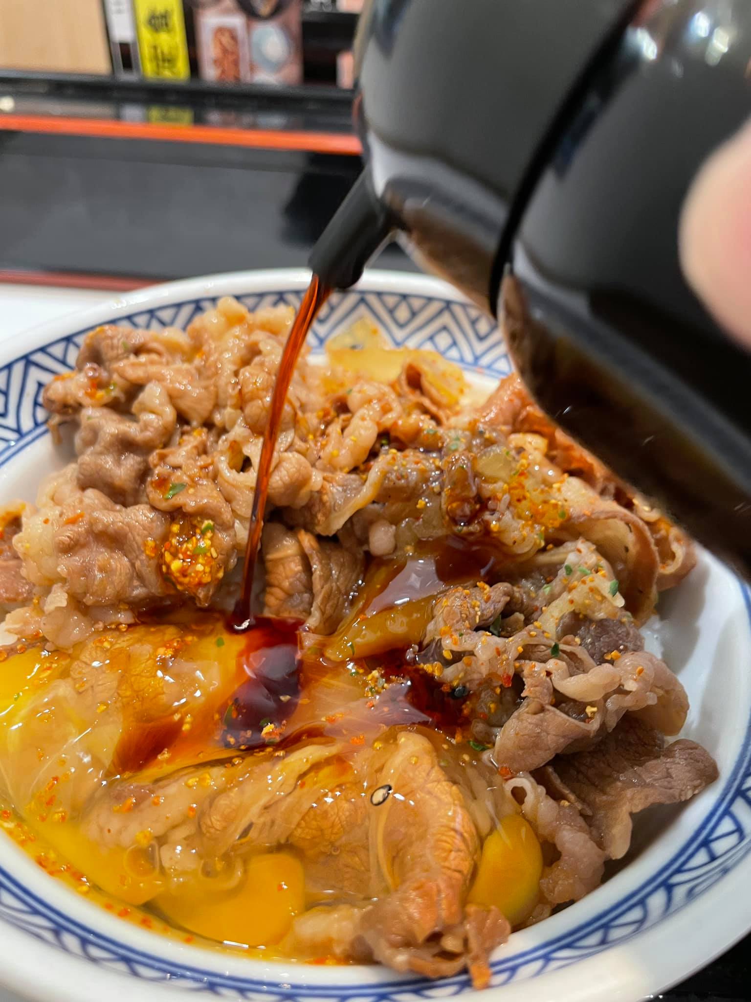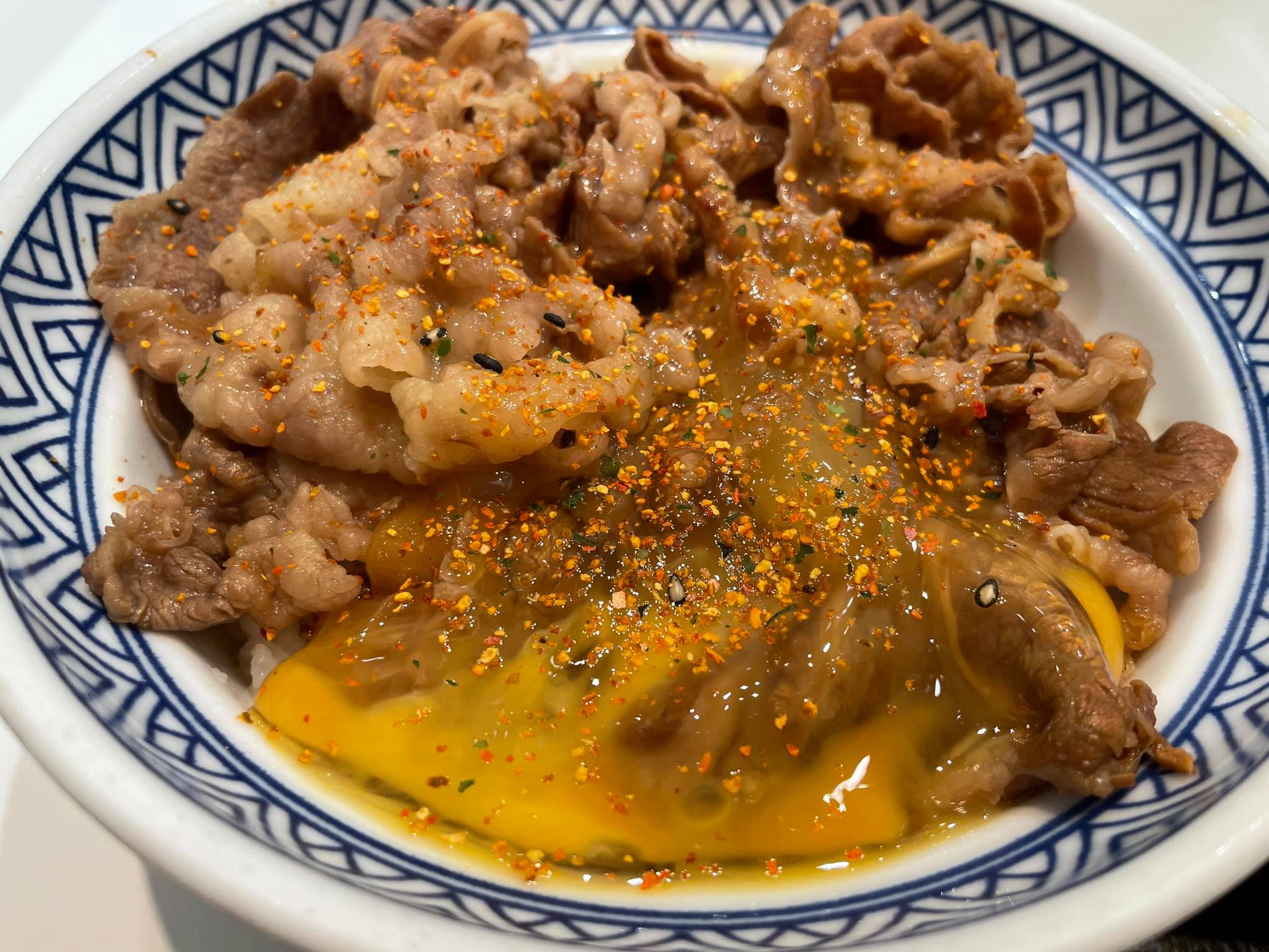 オーダーするものは牛丼ツユヌキ、お新香、生卵、味噌汁。まず生卵の黄身と白身を分け、黄身を牛丼の具にかけてよくなじませる。そこにお新香をのせ、たっぷりと七味唐辛子をふりかけて完成。