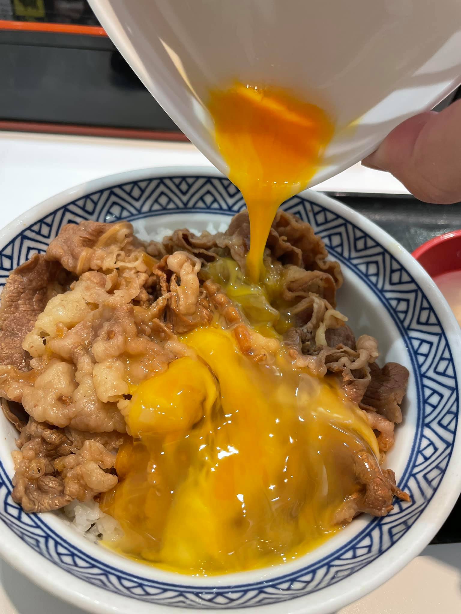 牛丼並盛とともに生卵5個をオーダー。黄身だけを牛丼にのせ、よくかき混ぜて牛肉に卵黄を行き届かせて完成。牛肉によくからまった卵黄が黄金に見えてくる。