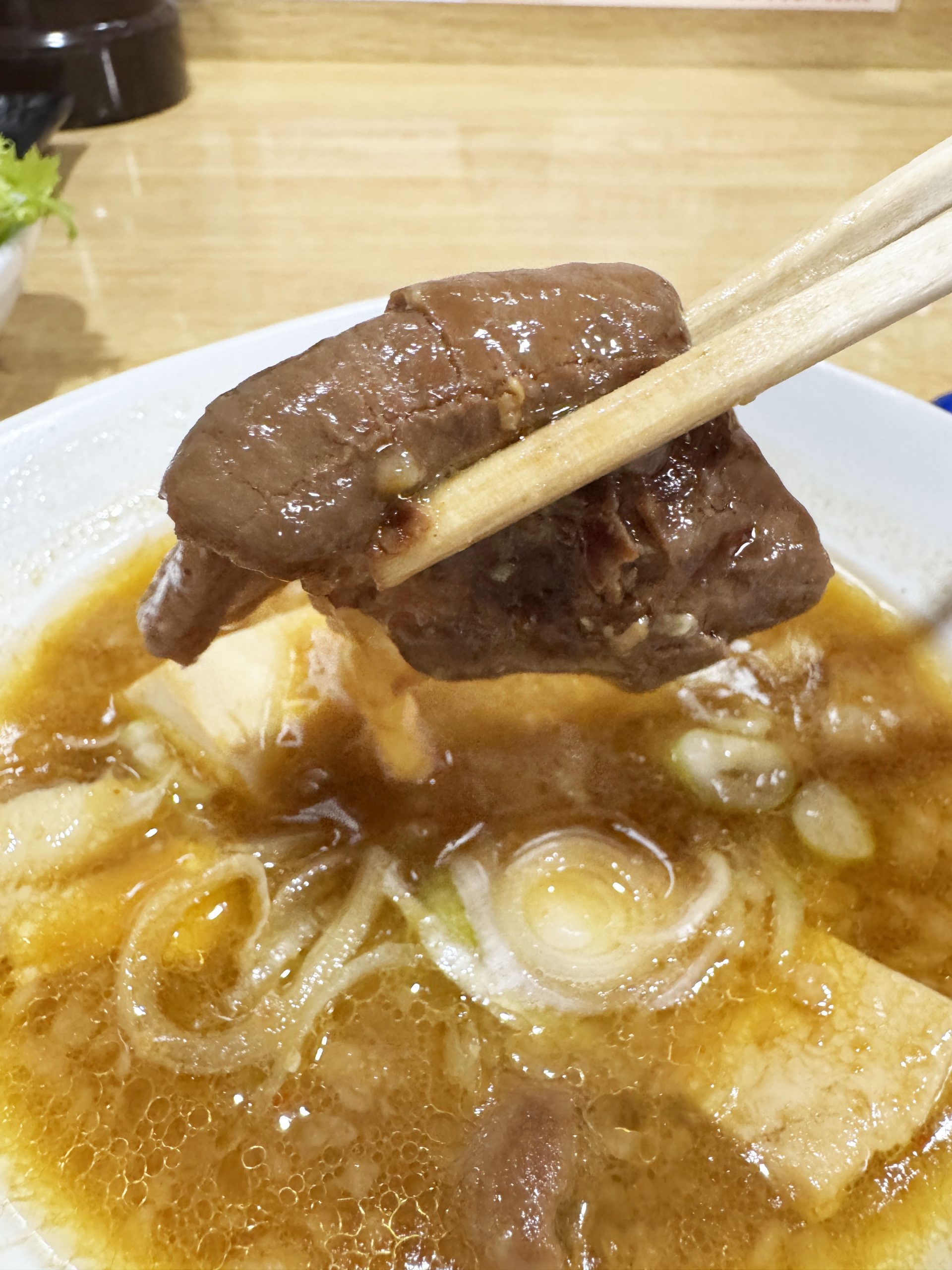 とにかく、薫りが芳醇。湯気とともに芳醇な薫りが漂う。箸でつまんでみると、そのモツの色に驚かされる。徹底的に、煮込みに煮込みまくられた、旨味たっぷりシミシミのモツだ。