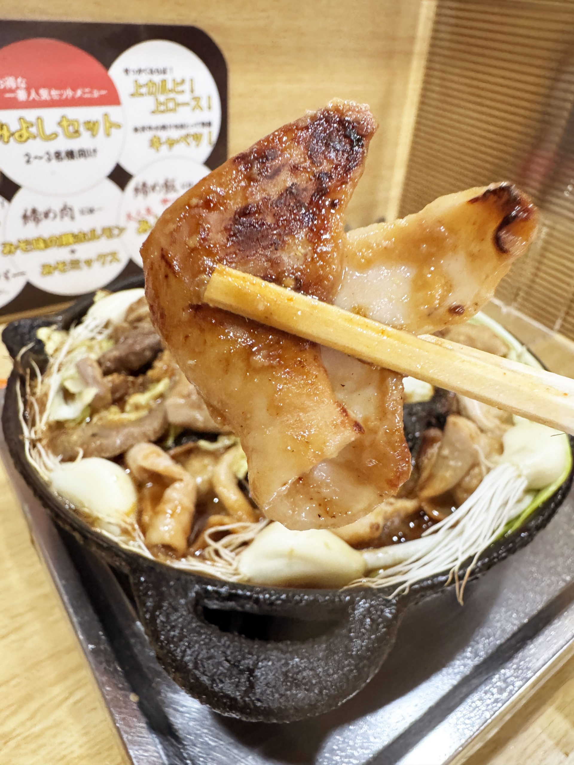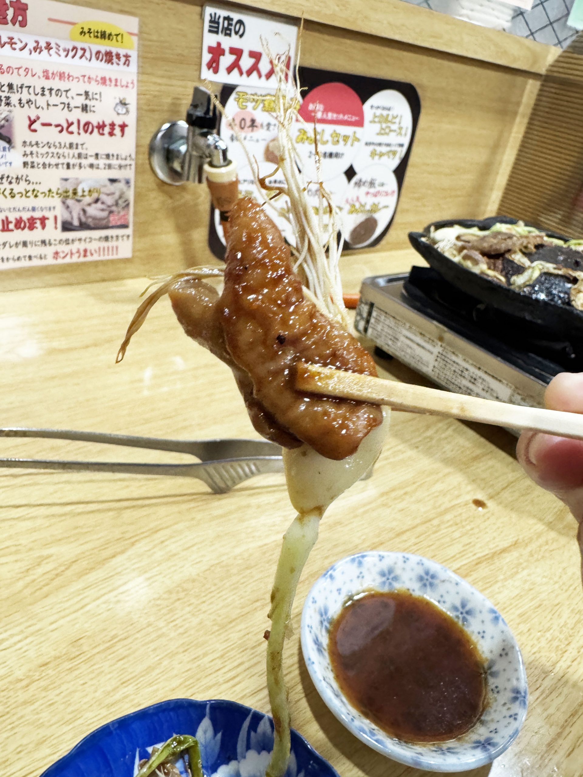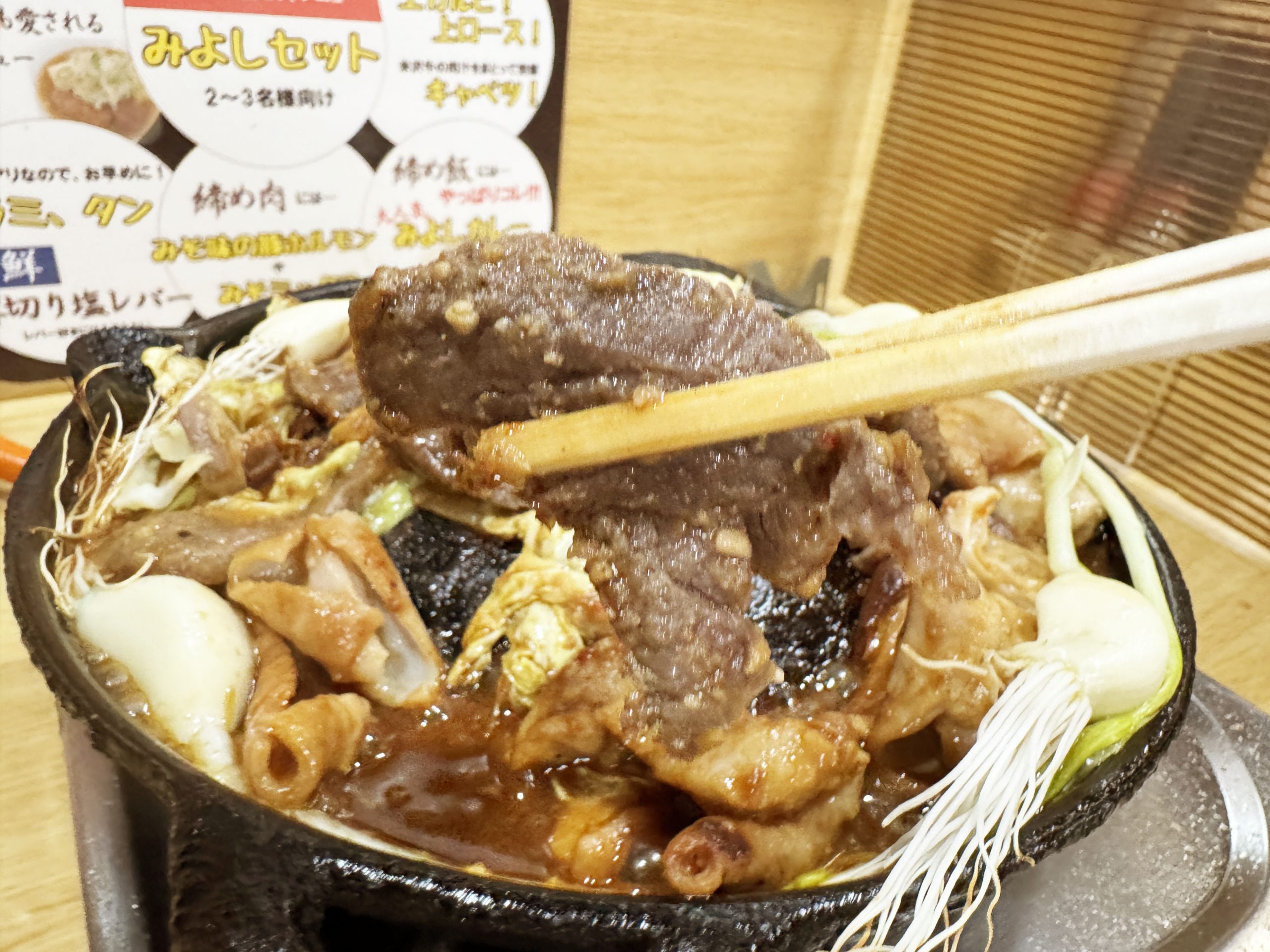 焼肉みよしの独自レシピで仕上げられた豚ホルモンみそ。純白のホルモンを包んでいるのは薫り高いみそ。ひとつひとつ焼くのではなく、豪快にぜんぶ鉄板にのせてガッツリと焼いて食べると美味。